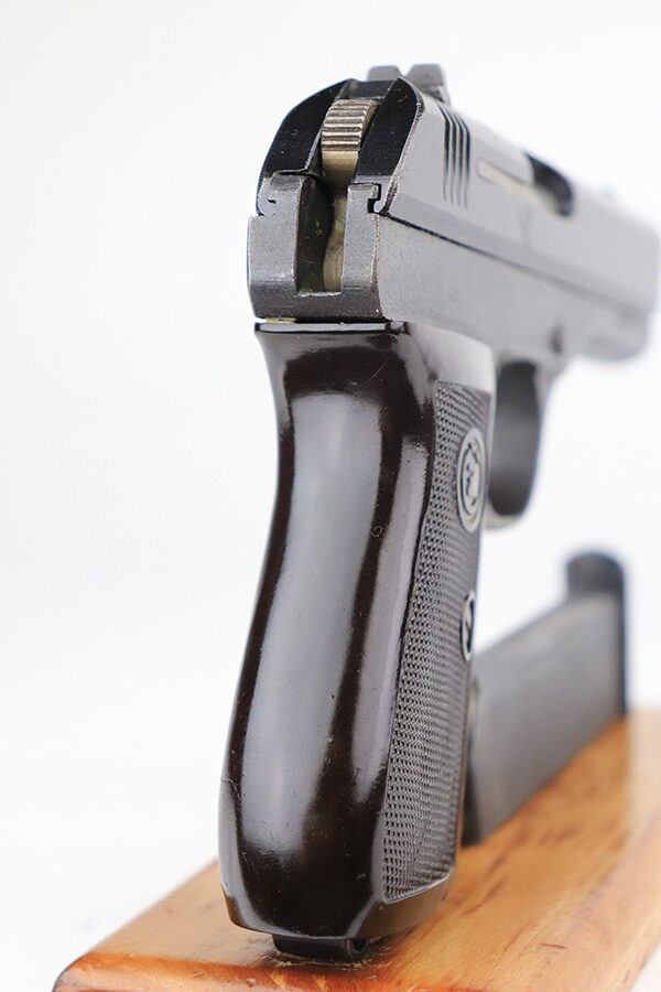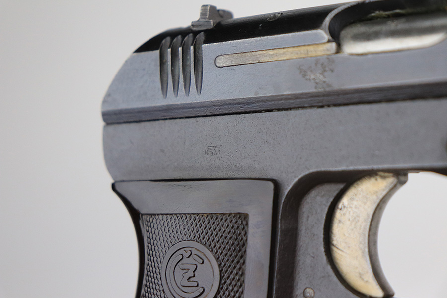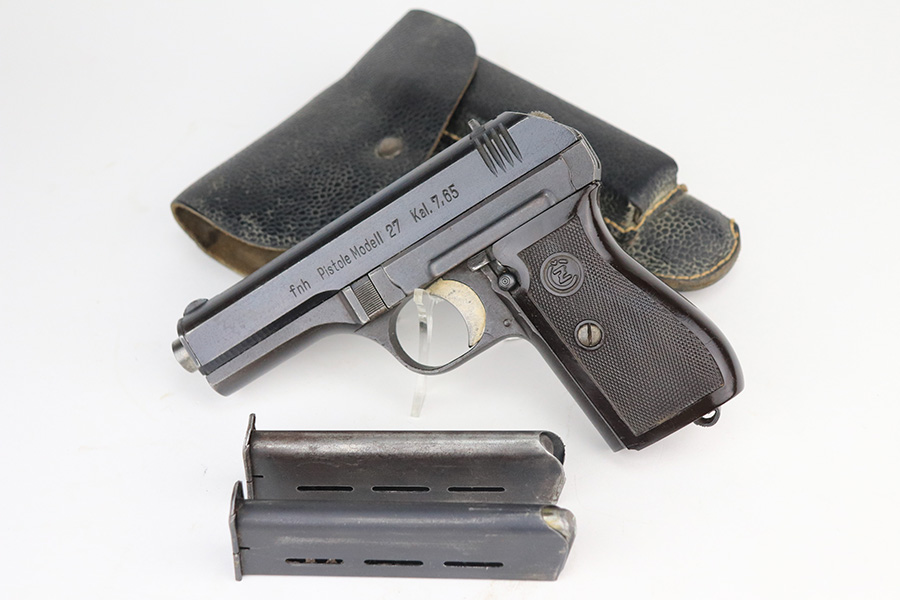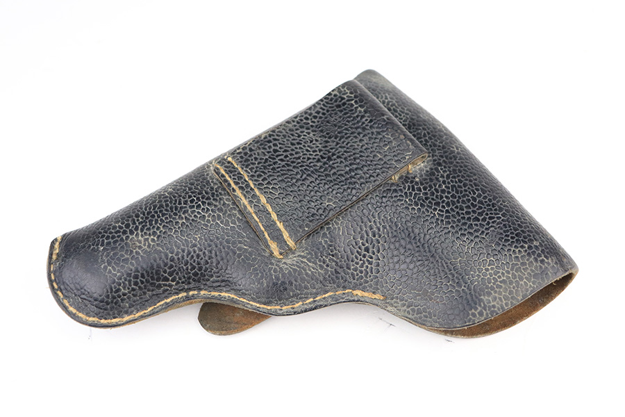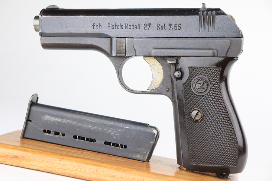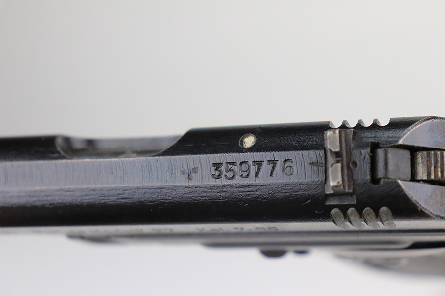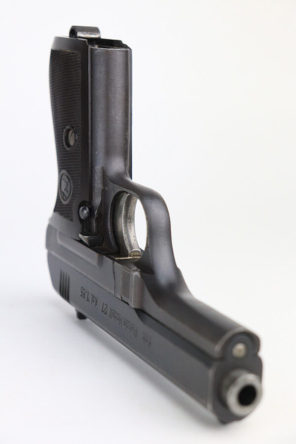 1/25/22 – This is an excellent example of a CZ 27 issued to the Nazi military during WW2. It is all matching and has the proper “Waffen 76” Nazi military acceptance proof on the right side of the frame. It comes as a rig with two period-correct magazines and a very nice pebble grain holster – there appears to be an extremely faint maker mark on the belt loop. The gun has retained about 97% of its original military finish. There are just hints of wear on the high edges of the slide. There is also a small area of discoloration and some tiny pits on the right side of the slide. Comes with a nice period-correct grip – small chips in the bottom corners. The bore is mint.