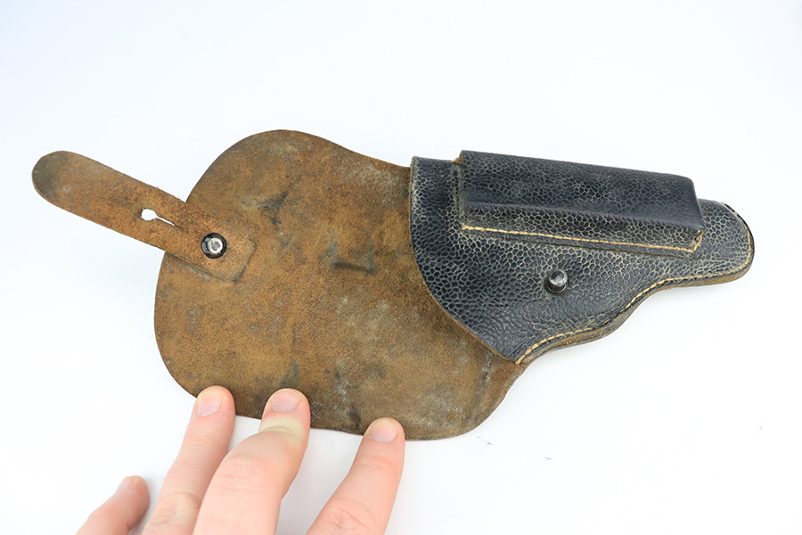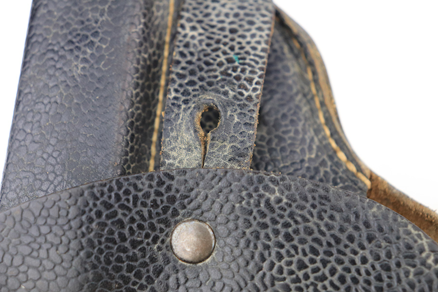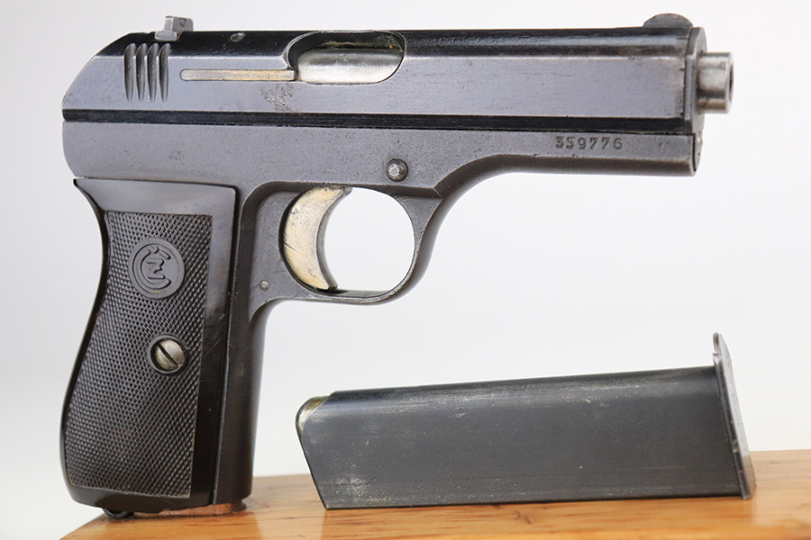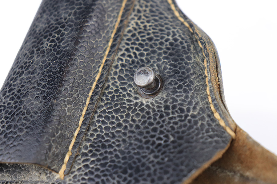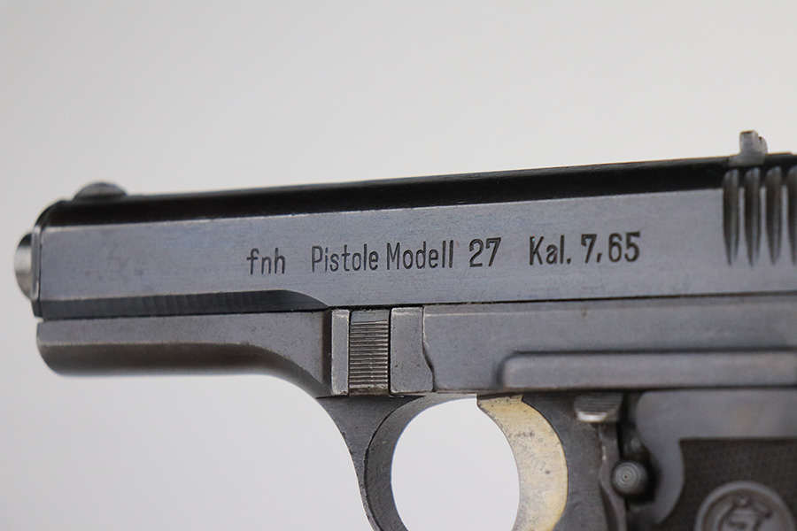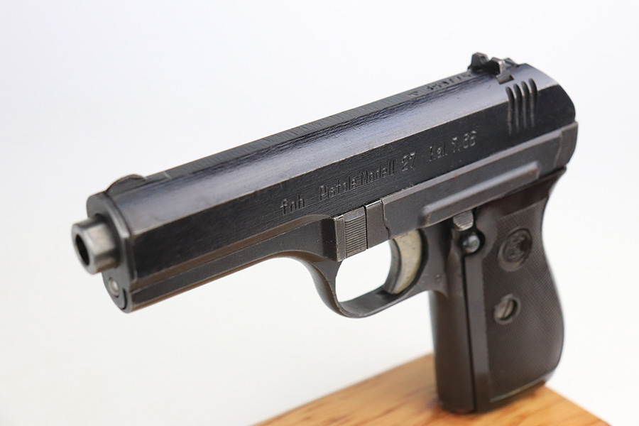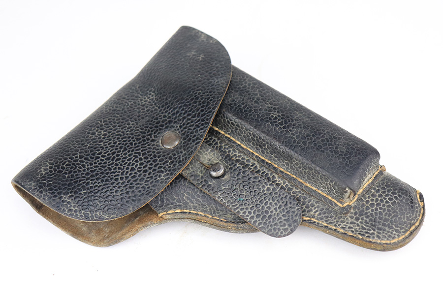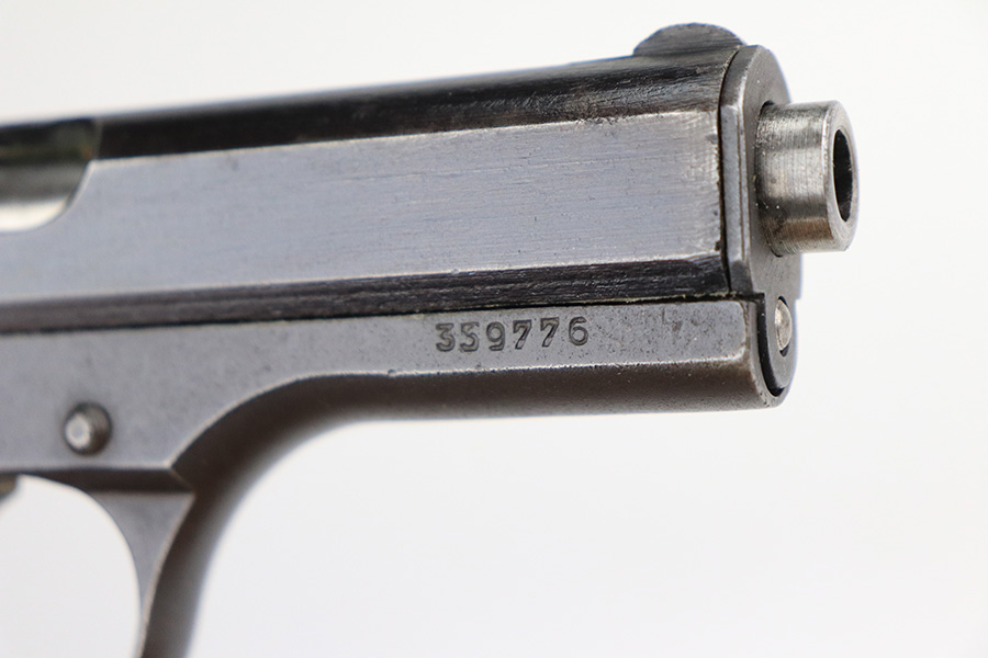 1/25/22 – This is an excellent example of a CZ 27 issued to the Nazi military during WW2. It is all matching and has the proper “Waffen 76” Nazi military acceptance proof on the right side of the frame. It comes as a rig with two period-correct magazines and a very nice pebble grain holster – there appears to be an extremely faint maker mark on the belt loop. The gun has retained about 97% of its original military finish. There are just hints of wear on the high edges of the slide. There is also a small area of discoloration and some tiny pits on the right side of the slide. Comes with a nice period-correct grip – small chips in the bottom corners. The bore is mint.