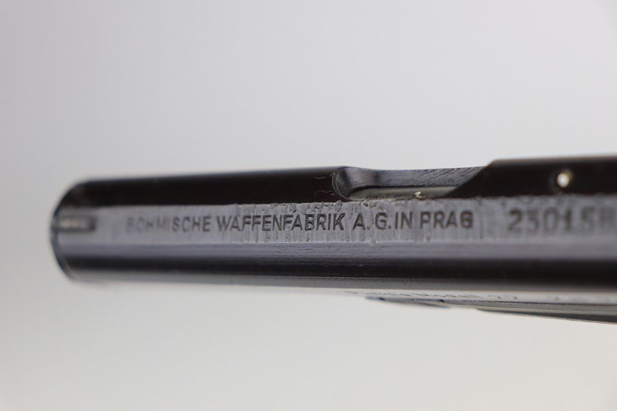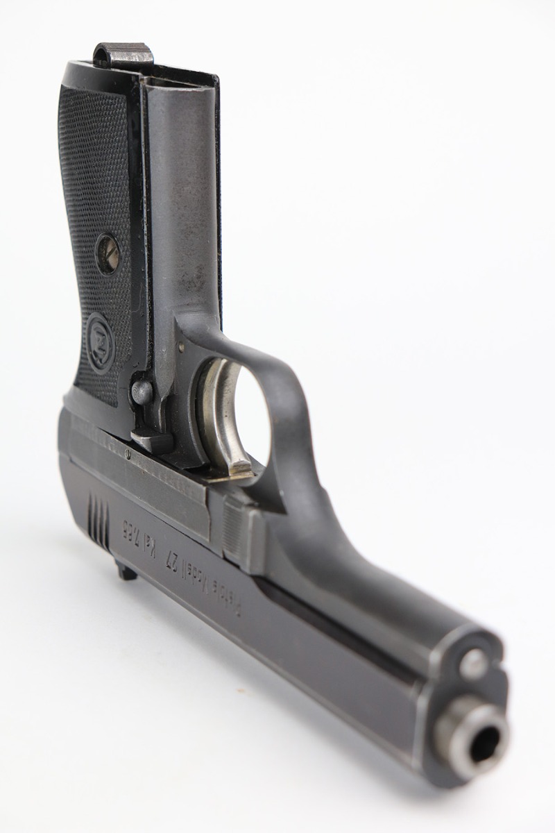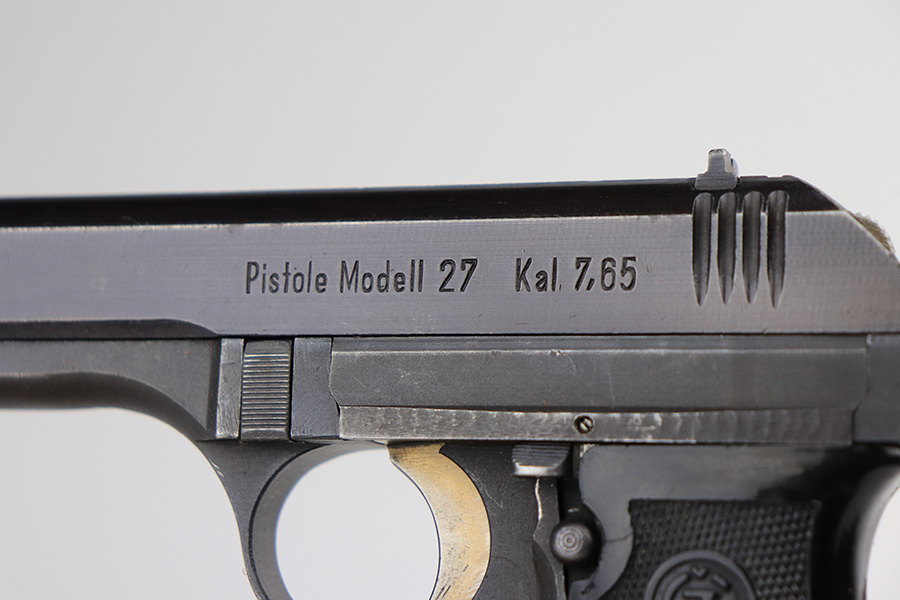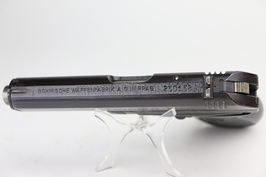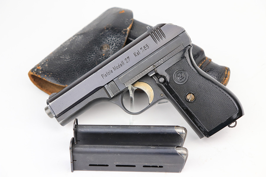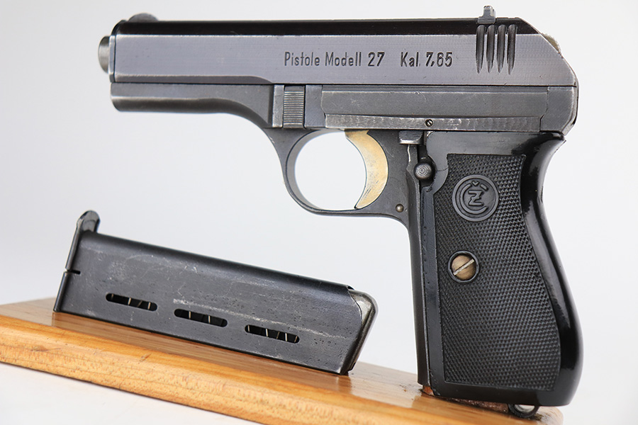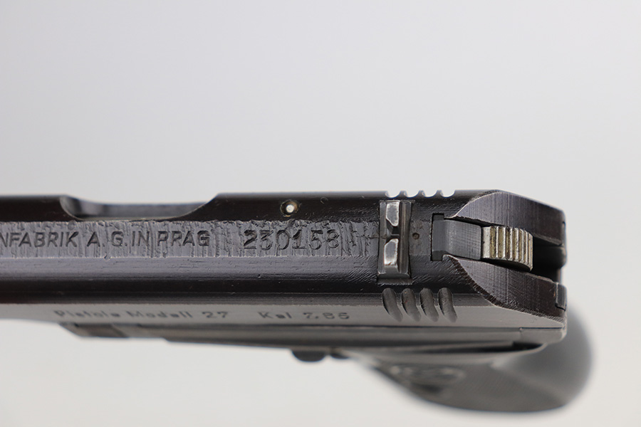 2/23/22 – This is an excellent example of a CZ 27 issued to the Nazi military during WW2. The gun is all matching and has the proper “Waffen 76” Nazi military acceptance proof on the right side of the frame. It comes as a rig with a nice 1943-dated waffen-proofed holster and two period-correct magazines. The holster has light surface cracking along the top flap and a tear on the closure strap. The gun has retained about 97% of its original military finish. There is just very minor wear concentrated around the high edges of the slide and a few very light scratches on the right side of the frame. Some tiny dots of oxidation on the front strap. The grip has some chips at the top of the spine, the bottom near the magazine release appears to have been slightly shaved, and there are some imperfections along the left and right edges. The bore is mint.