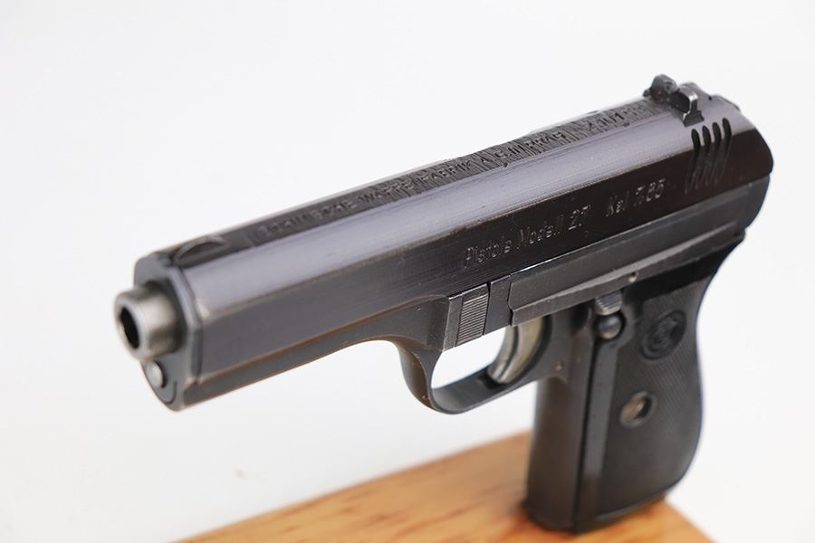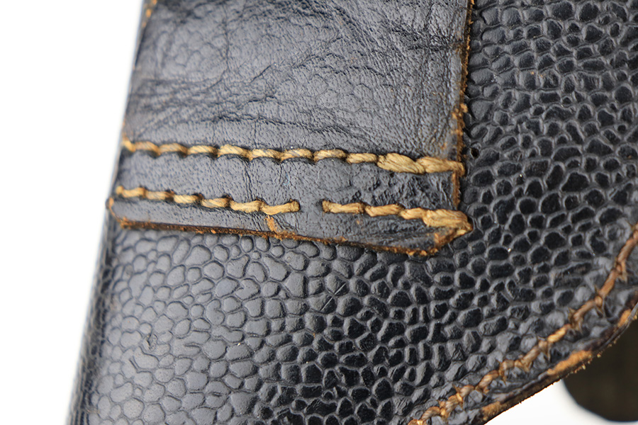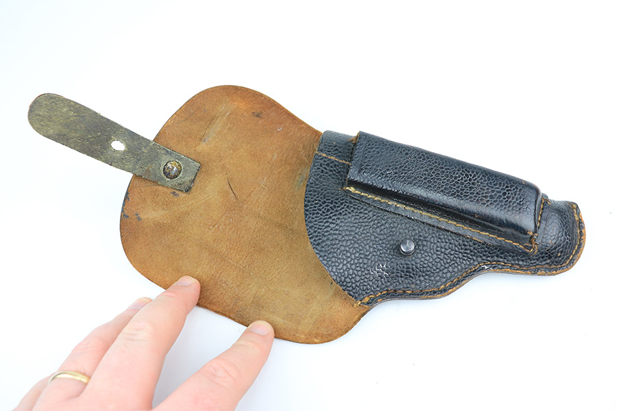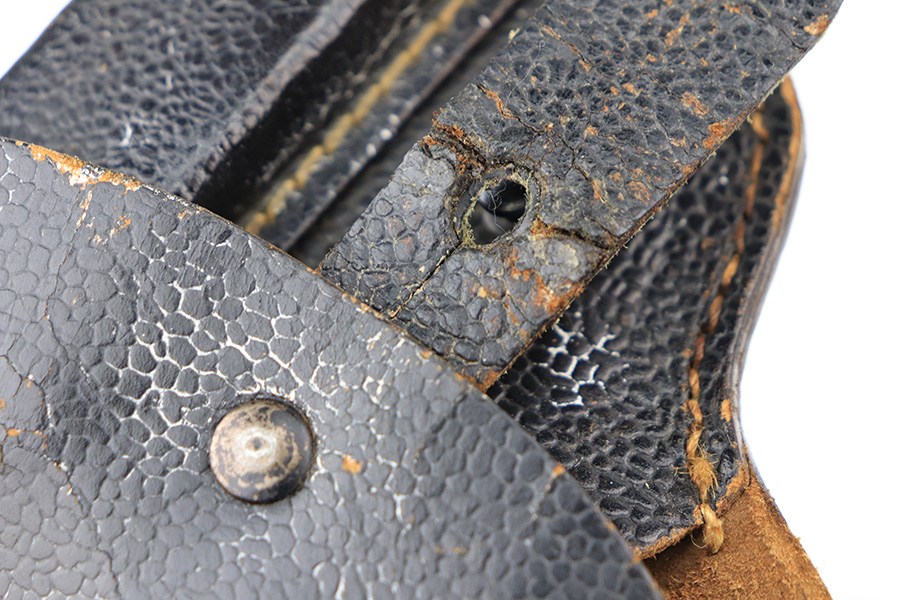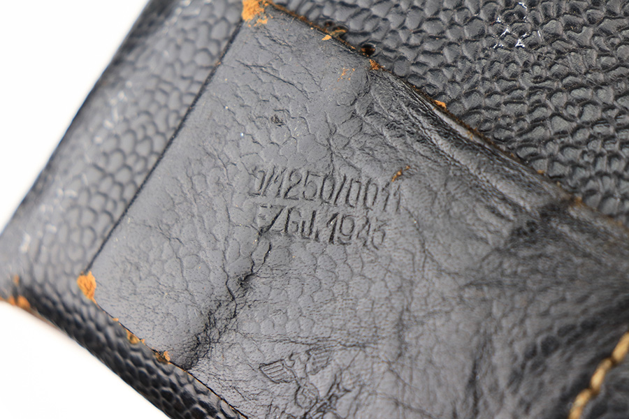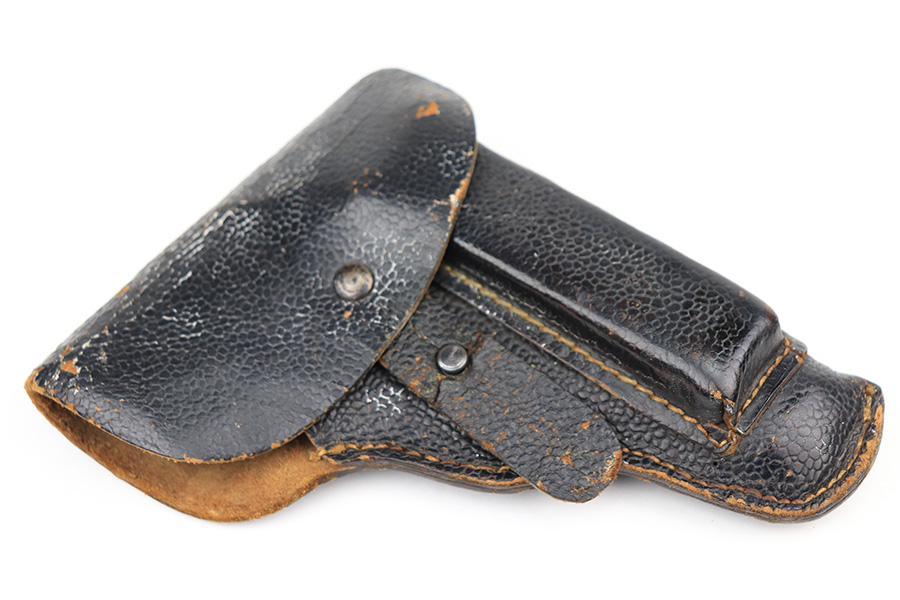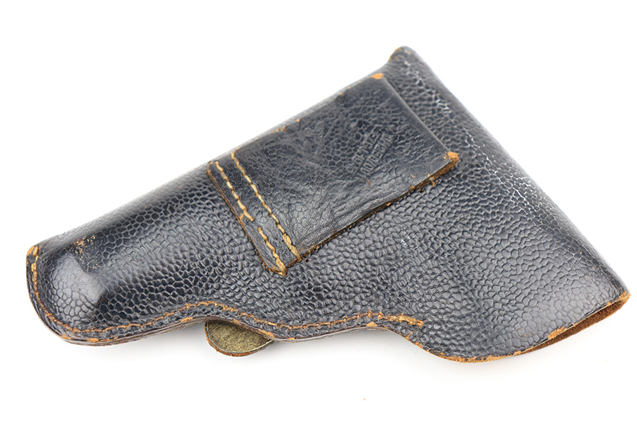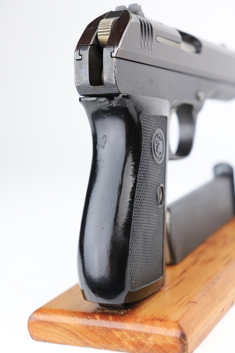 2/23/22 – This is an excellent example of a CZ 27 issued to the Nazi military during WW2. The gun is all matching and has the proper “Waffen 76” Nazi military acceptance proof on the right side of the frame. It comes as a rig with a nice 1943-dated waffen-proofed holster and two period-correct magazines. The holster has light surface cracking along the top flap and a tear on the closure strap. The gun has retained about 97% of its original military finish. There is just very minor wear concentrated around the high edges of the slide and a few very light scratches on the right side of the frame. Some tiny dots of oxidation on the front strap. The grip has some chips at the top of the spine, the bottom near the magazine release appears to have been slightly shaved, and there are some imperfections along the left and right edges. The bore is mint.