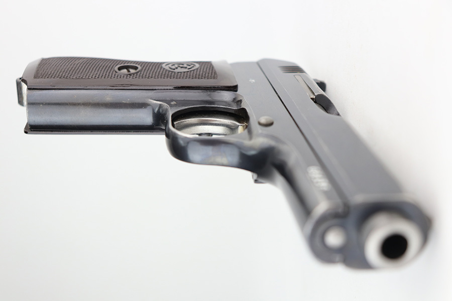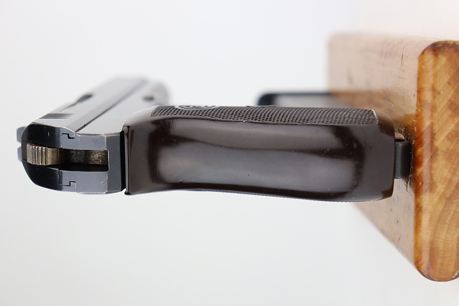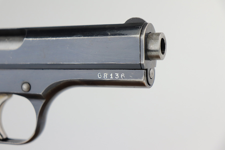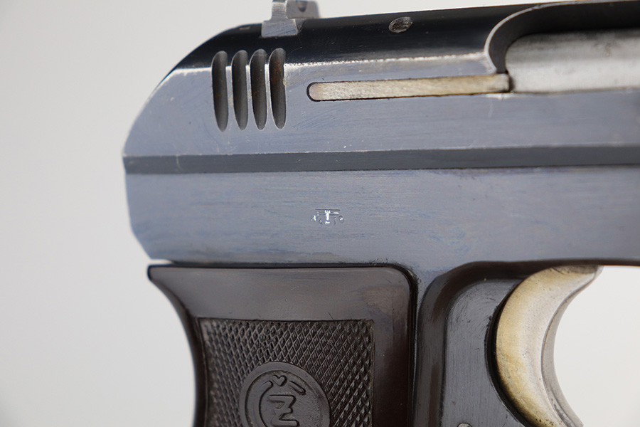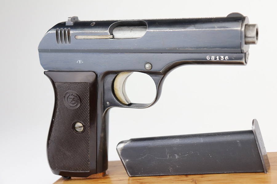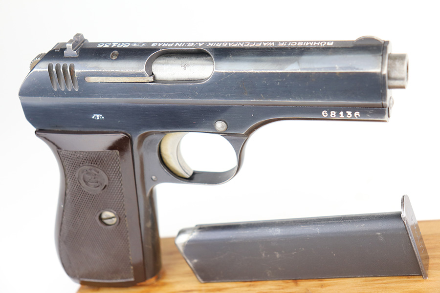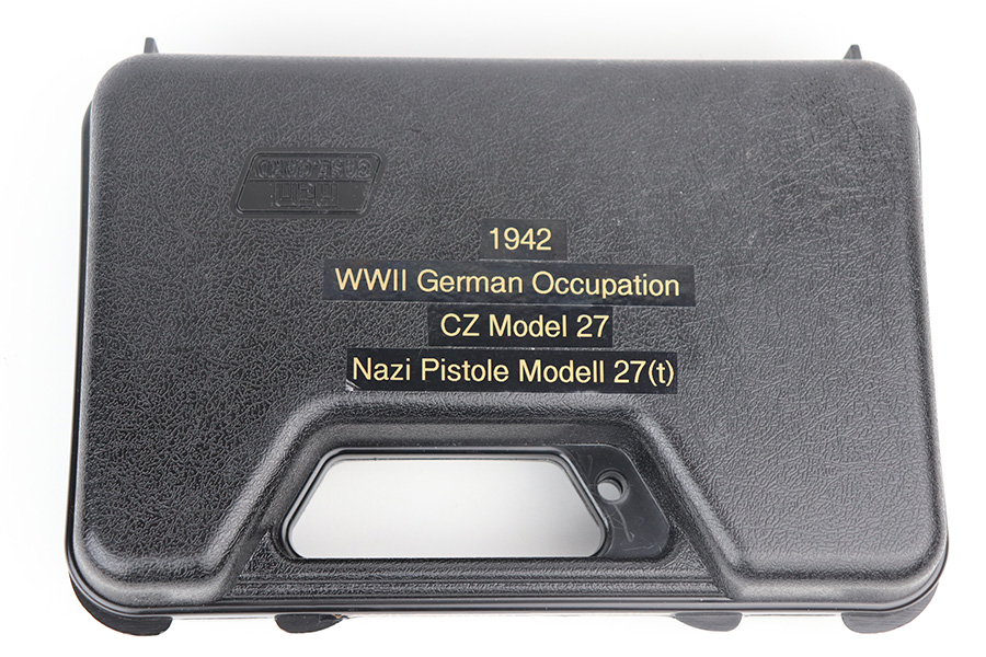 5/7/21 – This is an excellent example of a CZ 27 issued to the Nazi military in 1942. This gun is being sold on consignment. The consignor put the gun with a very nice labeled hard case with patches on the inside. The gun is all matching and has the proper waffen military proofs. It has retained about 96% of its original high polish finish. There is a hint of wear on the high edges of the slide. Spotty wear and very light scratches on the front strap and on the right side of the slide. Comes with a very nice grip – just some minor dings on the back and a small chip on the right side. Comes with a period-correct magazine. The bore is mint.