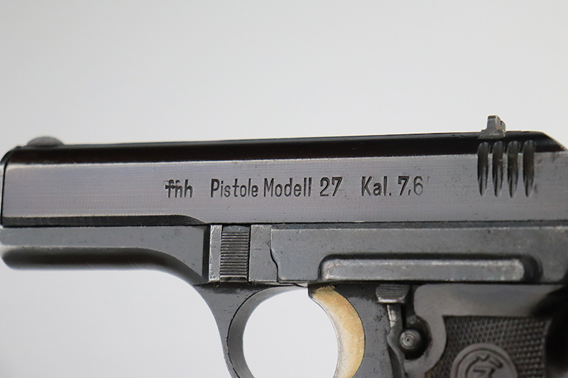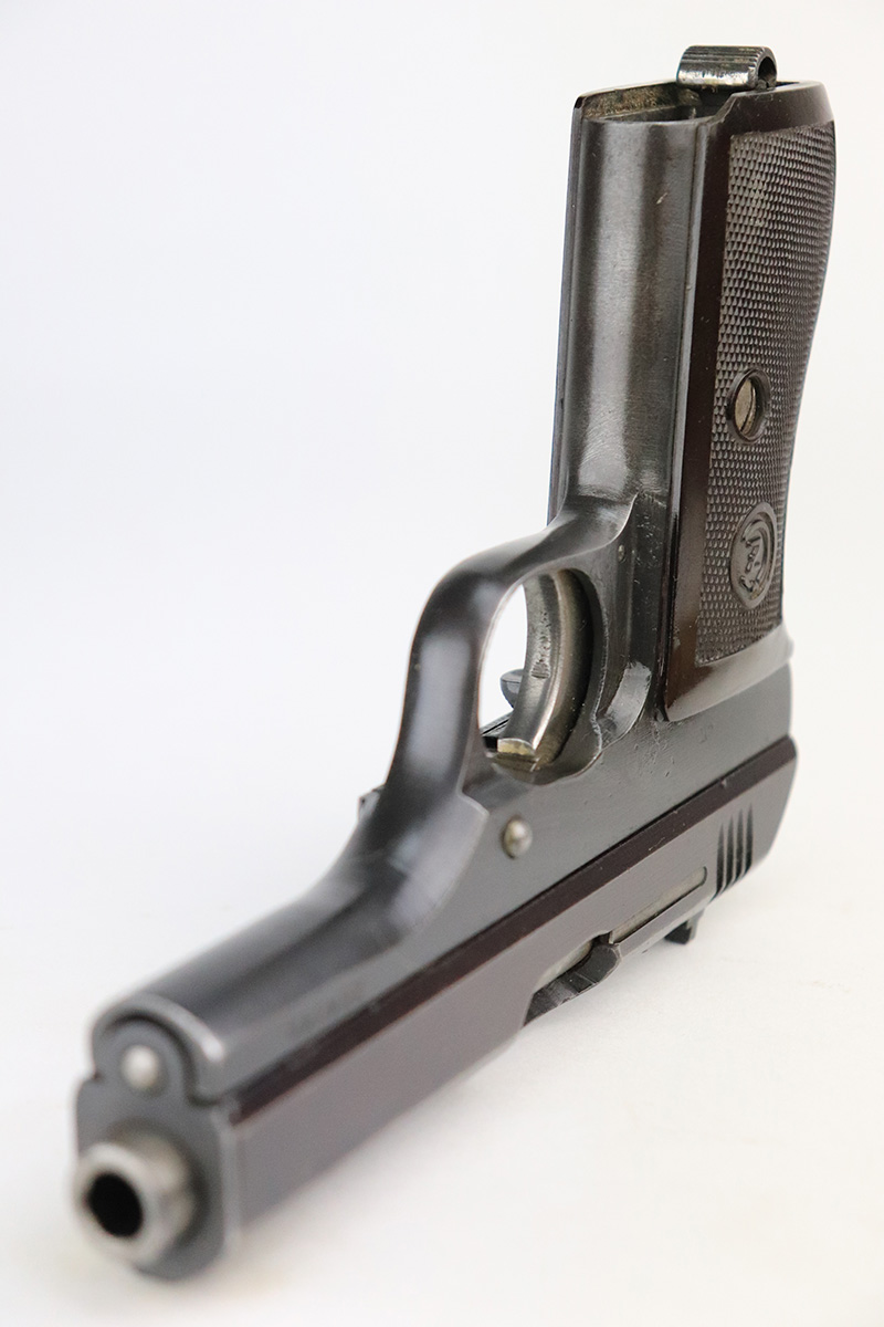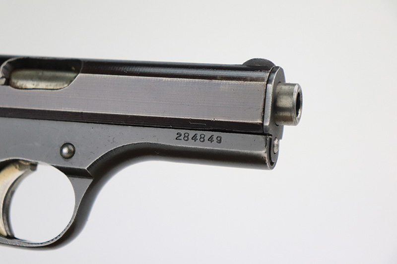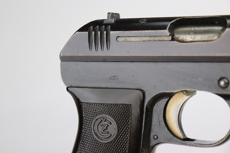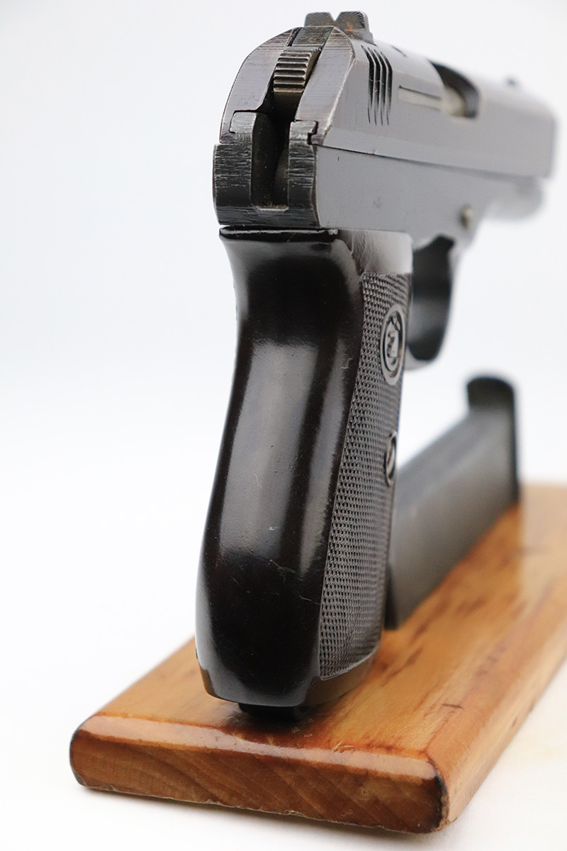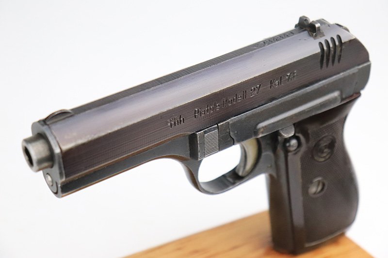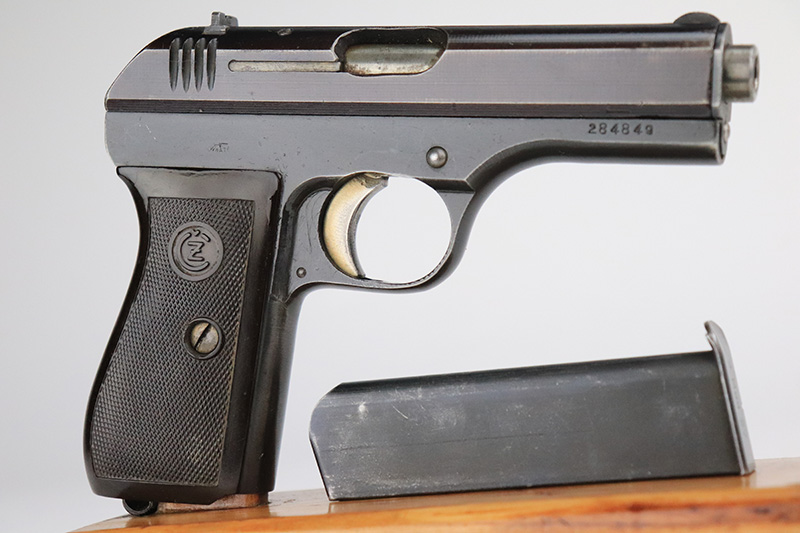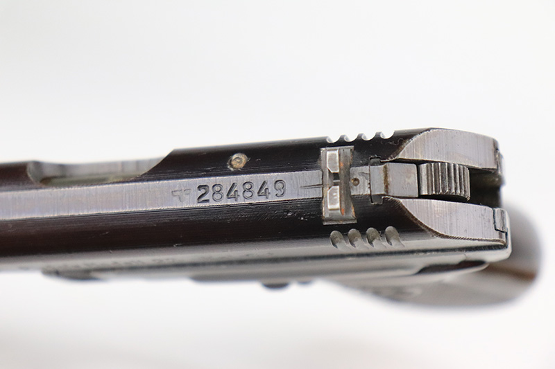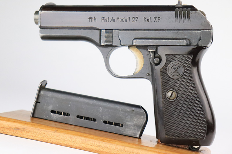 9/16/22 – This is an excellent example of a CZ Model 27 issued to the Nazi military during WW2. The gun is all matching and has the proper “Waffen 76” military acceptance proof on the right side of the frame. It has retained about 97% of its original wartime finish. There is just very minor wear around the high edges and around the muzzle and very minor thinning on the front strap. Some areas of light spotty oxidation on the left side of the frame. Comes with a very nice period-correct bakelite grip – one small chip in the bottom right corner. Also comes with one proper magazine, but the follower does not reach the top of the magazine opening (see photo). This causes the hold-open to not work properly. Otherwise, fully functional. Stone-mint bore.
