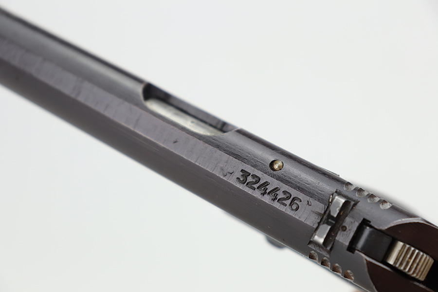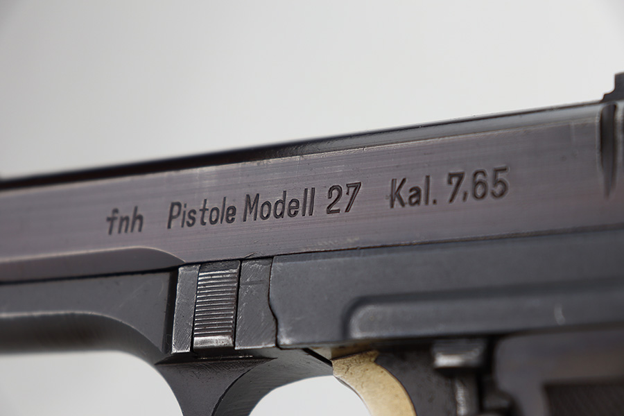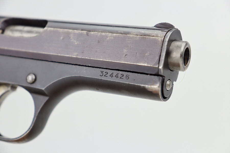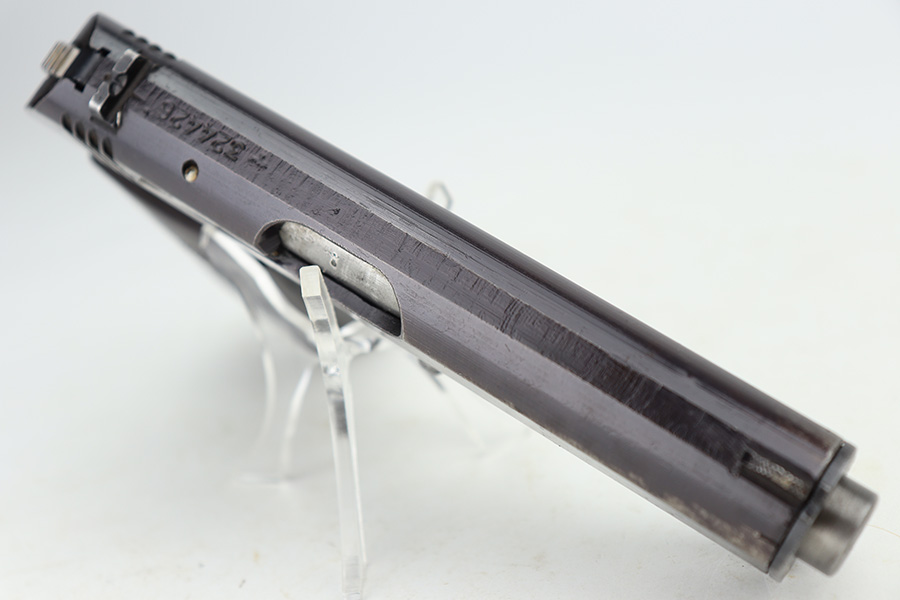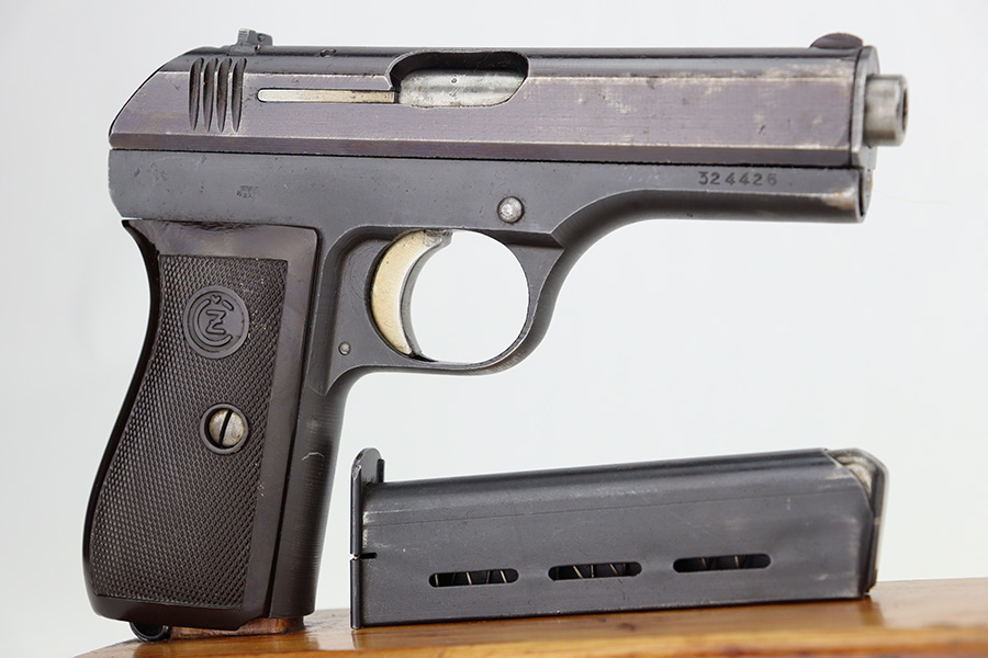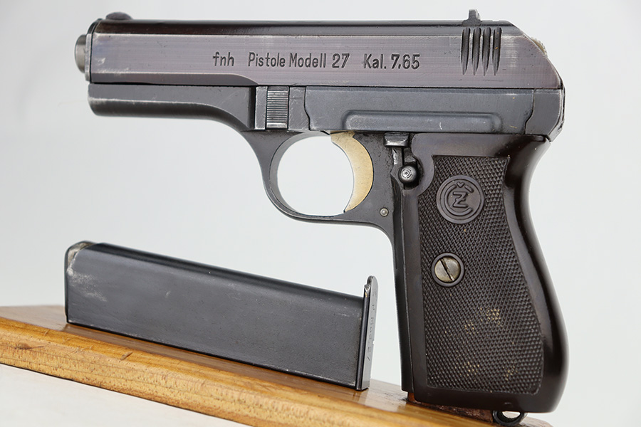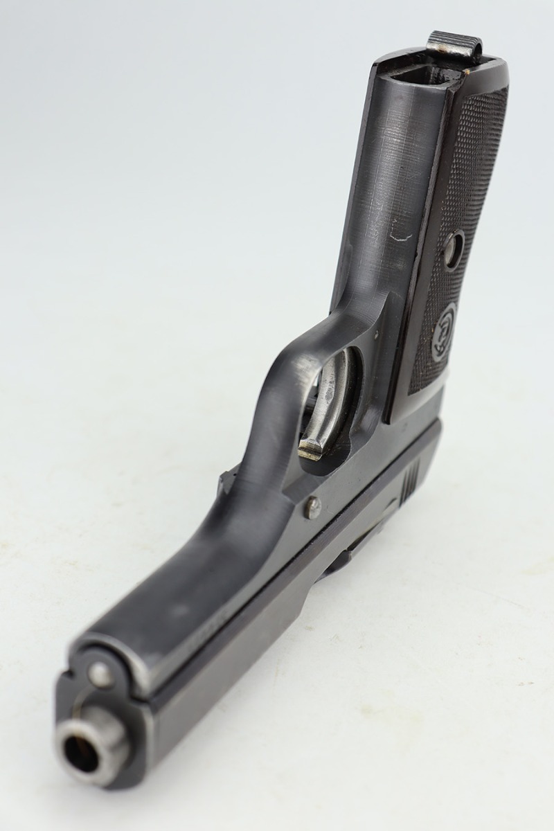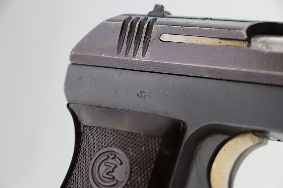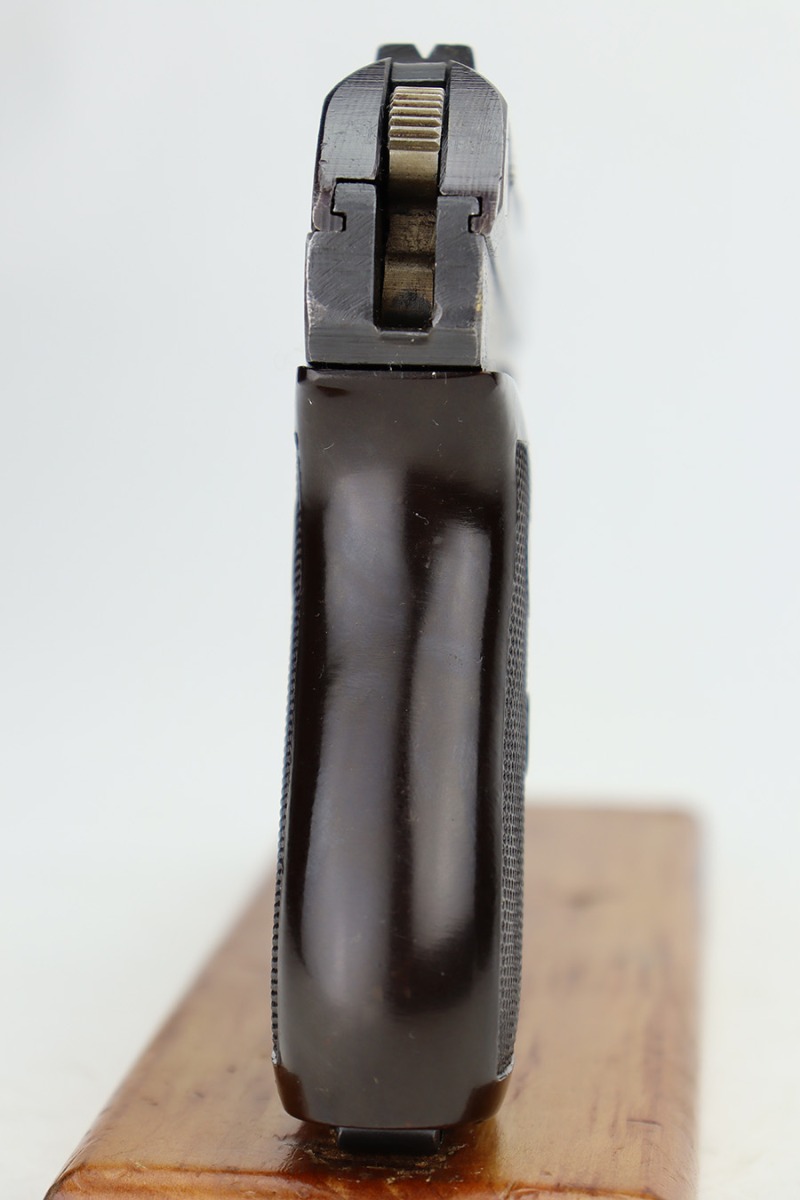 12/27/23 – This is an excellent CZ 27 issued to the Nazi military during WW2. All matching with the proper “Waffen 76” military acceptance proof. The slide has a nice plum tint to it. The original finish rates about 95-96% with wear around the muzzle and some light spotty wear on the right side of the slide. Fitted with a period-correct bakelite grip – a tiny chip in the bottom right corner. Comes with a proper magazine. Mint bore.