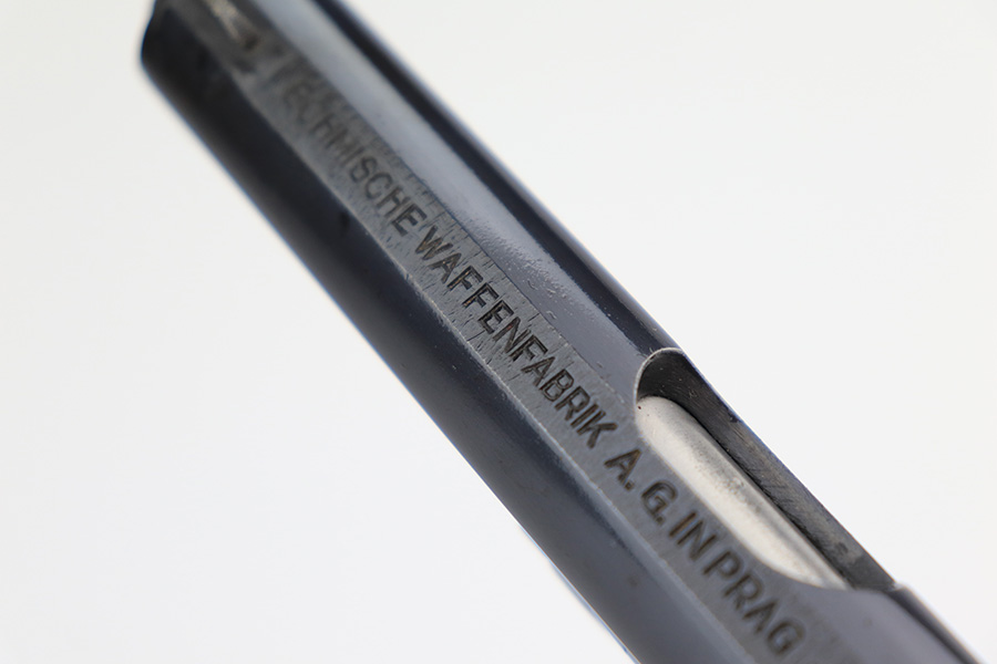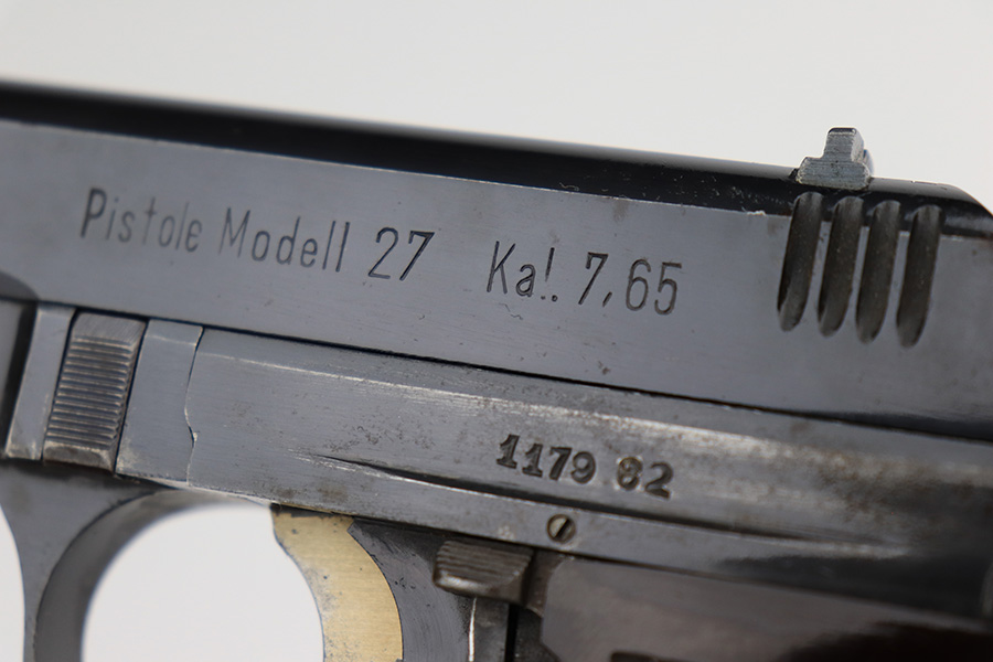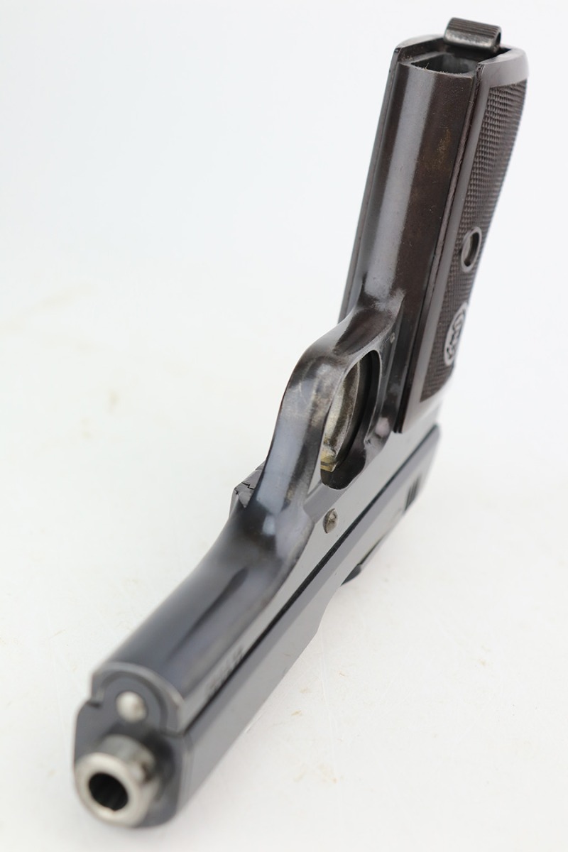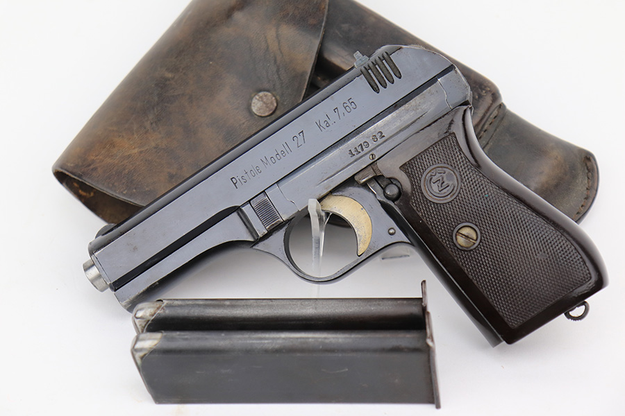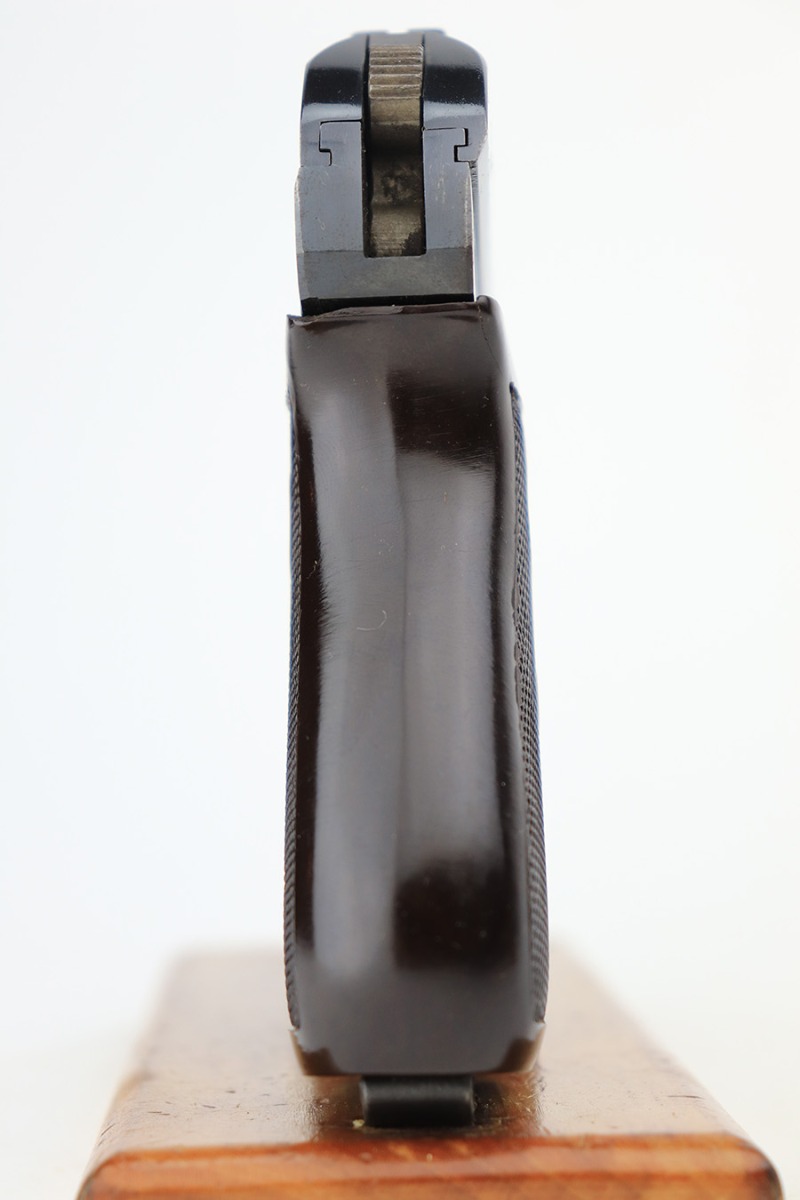 4/19/23 – This is an excellent example of a CZ Model 27 issued to the Nazi military during WW2. This is of the earlier “Bomische” variation with a high polish finish. All matching with the proper “Waffen 76” proof on the right side of the frame. It comes as a rig with a nice un-marked holster and two period-correct magazines. The gun itself has retained about 96-97% of its original high polish finish. There is a light streak of wear on the right side of the frame and an area of very minor wear and light freckling on the left side plate. Very minor muzzle wear. Excellent period-correct bakelite grip – no cracks or chips. Mint bore.