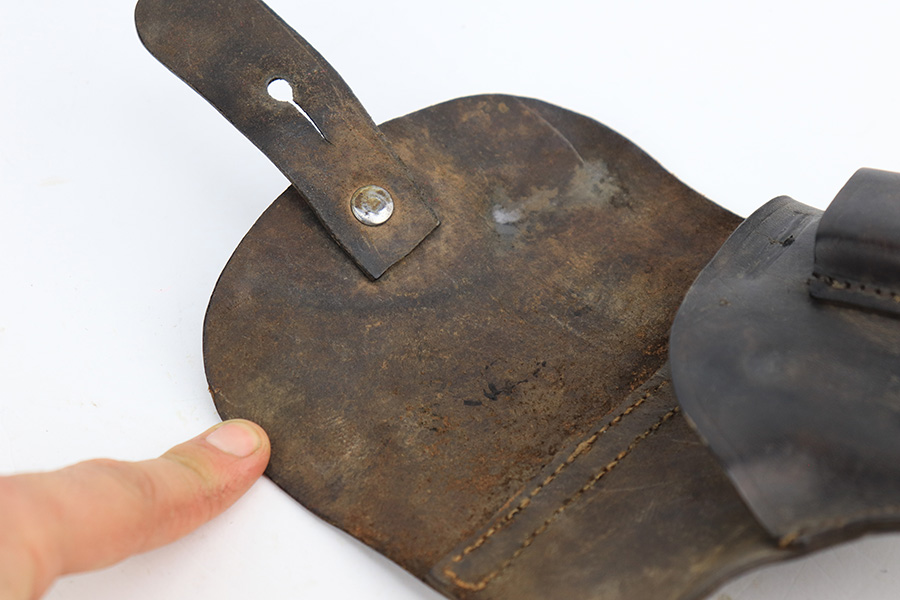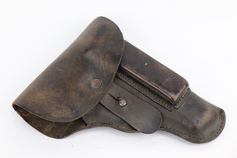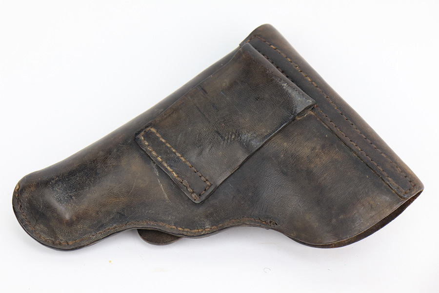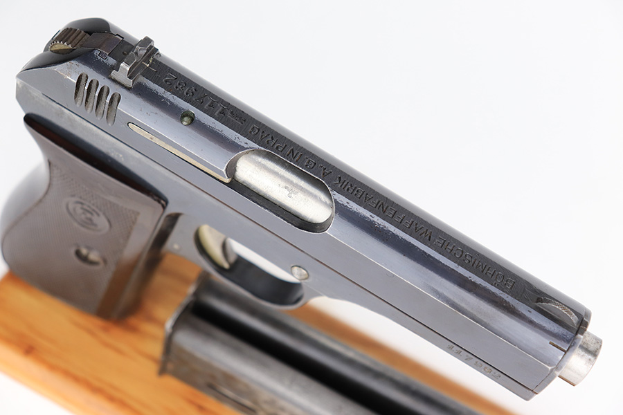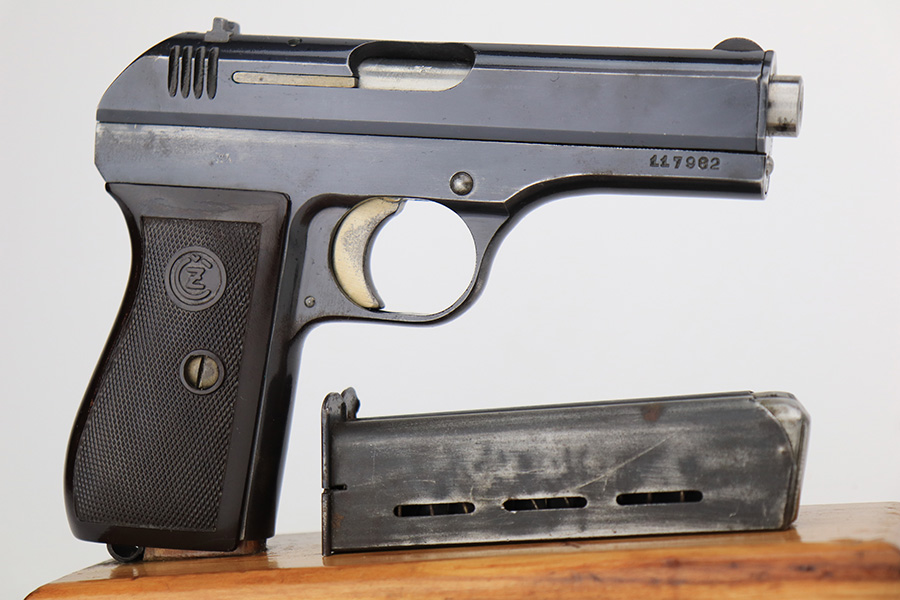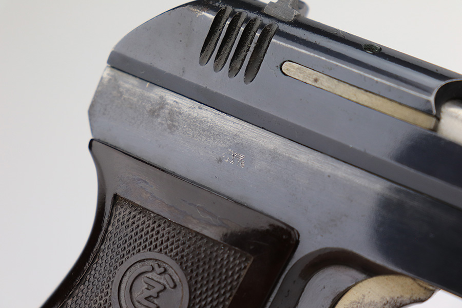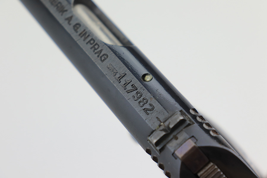 4/19/23 – This is an excellent example of a CZ Model 27 issued to the Nazi military during WW2. This is of the earlier “Bomische” variation with a high polish finish. All matching with the proper “Waffen 76” proof on the right side of the frame. It comes as a rig with a nice un-marked holster and two period-correct magazines. The gun itself has retained about 96-97% of its original high polish finish. There is a light streak of wear on the right side of the frame and an area of very minor wear and light freckling on the left side plate. Very minor muzzle wear. Excellent period-correct bakelite grip – no cracks or chips. Mint bore.