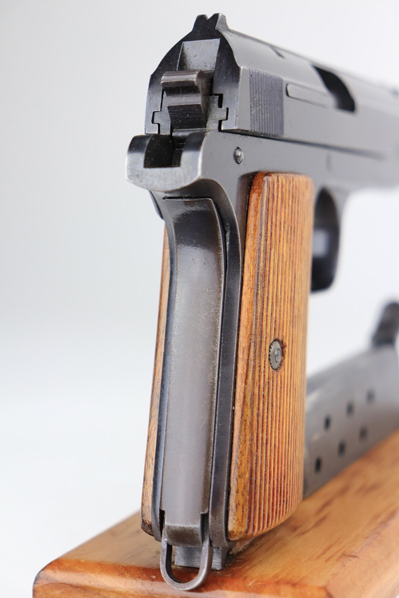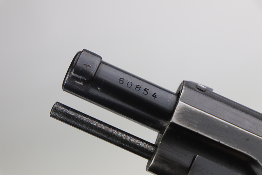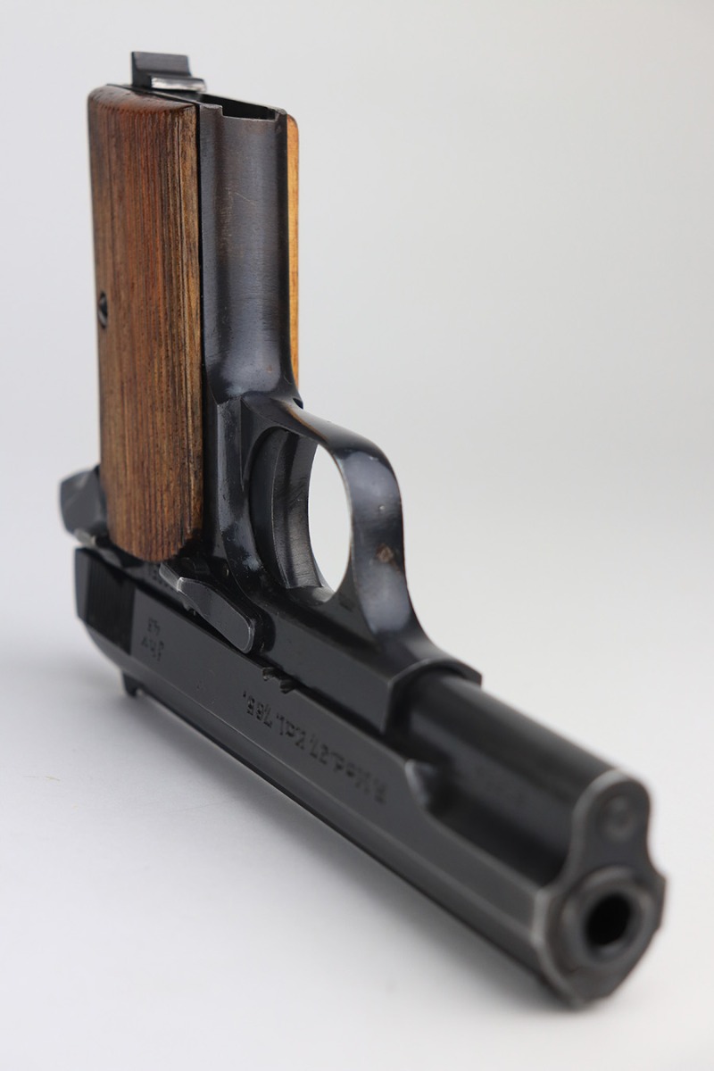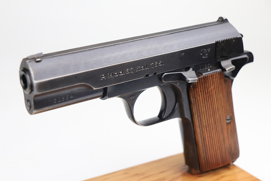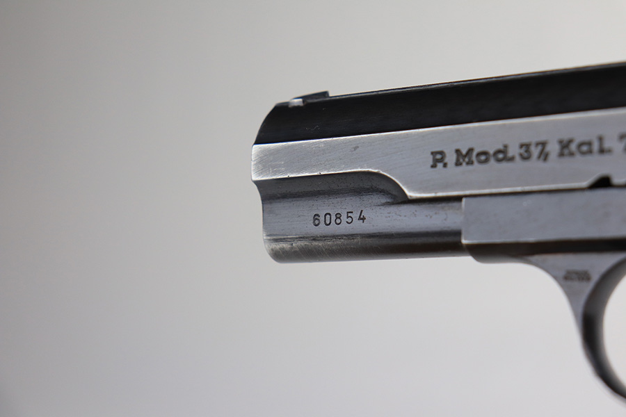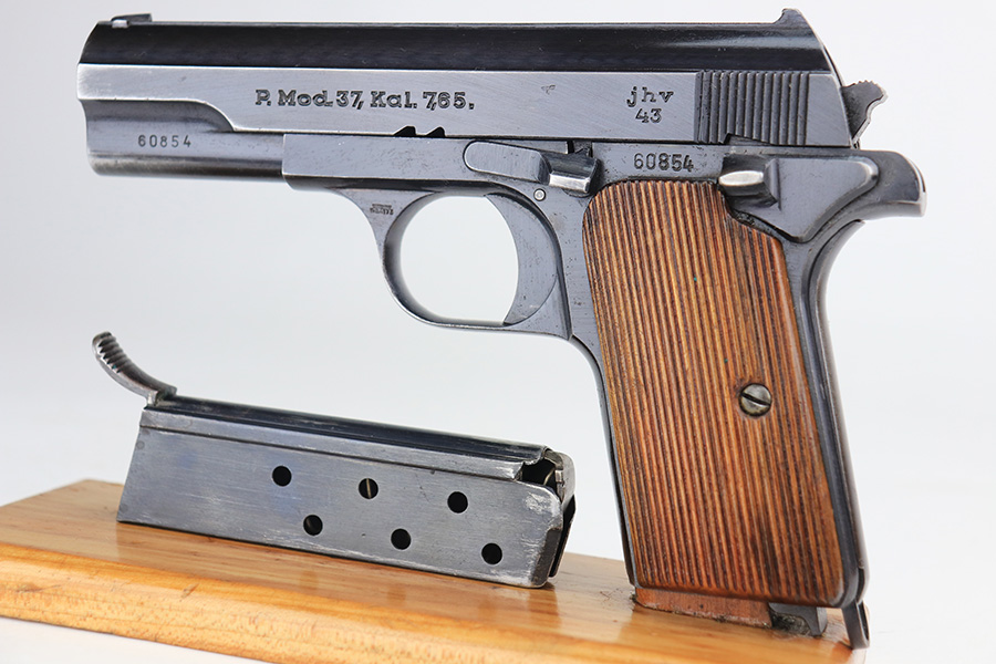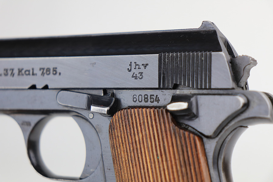 1/27/22 – This is an excellent example of a Hungarian Femaru Model 37 issued to the Luftwaffe in 1943. The gun is all matching and has the proper waffen military acceptance proof on the left side of the trigger guard. It also comes with one original matching-numbered magazine. It has retained about 97% of its original finish. There is very minor wear around the muzzle and hints of wear on the high edges of the slide. Some areas of very minor thinning on the right side of the slide and on the back strap. Just a hint of spotty wear on the front strap and underside of the trigger guard. Comes with excellent period-correct wood grips. Mint bore.