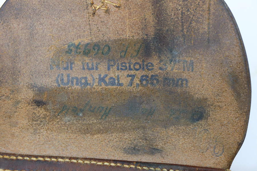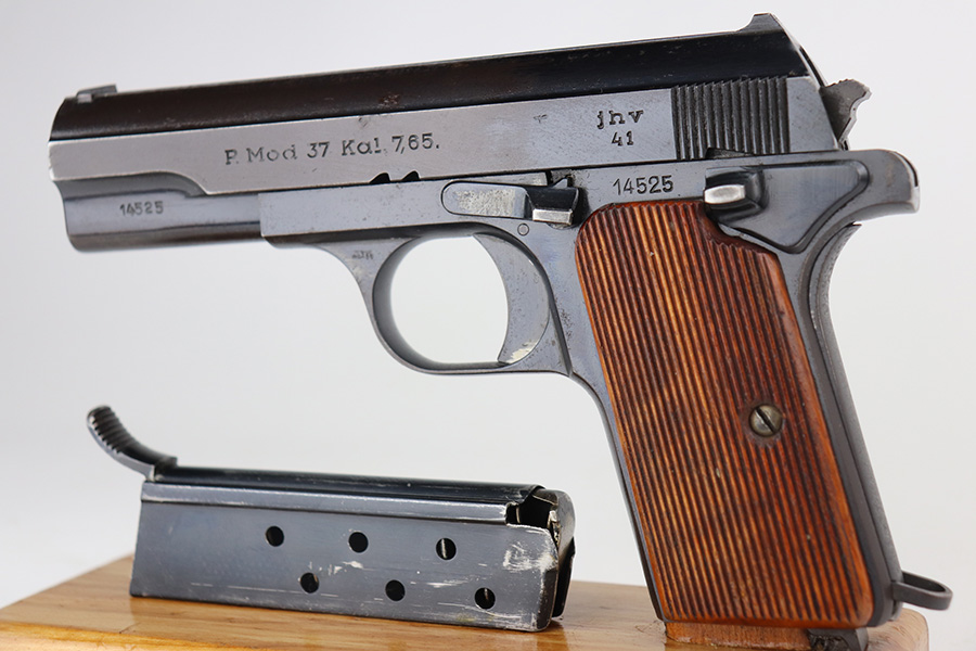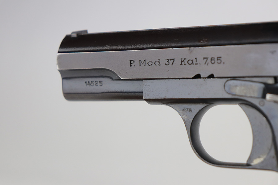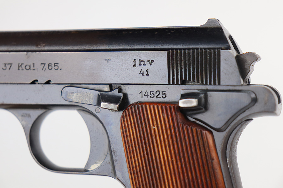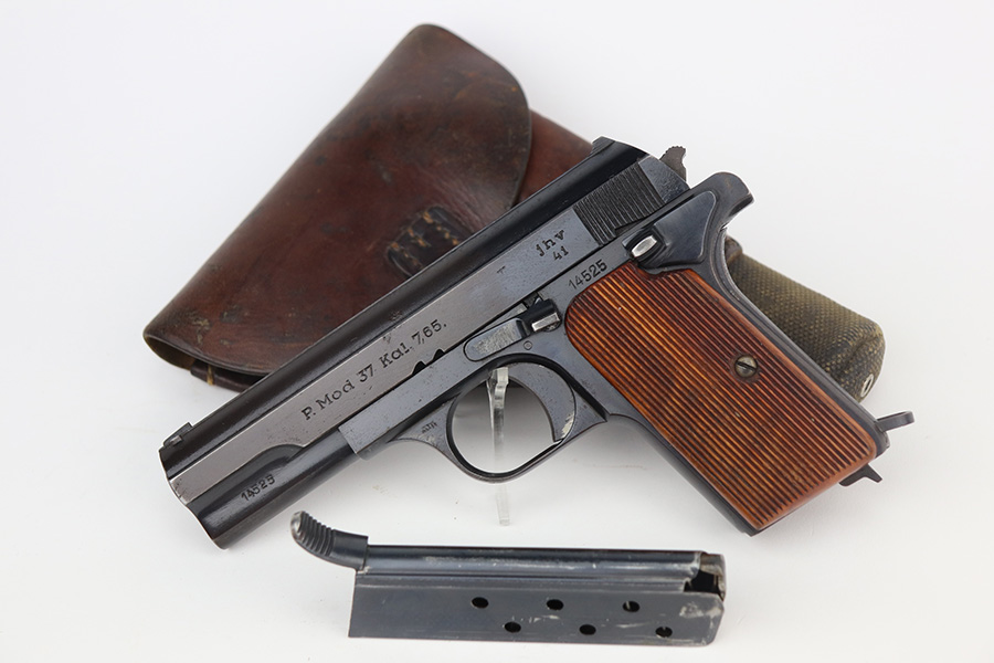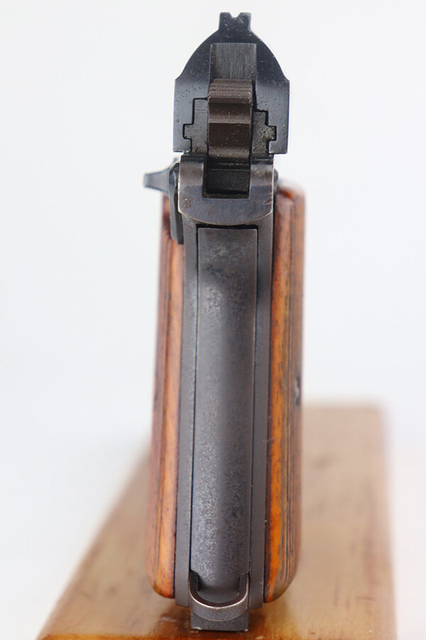 6/18/21 – This is an excellent example of a Femaru Model 37 Rig issued to the Luftwaffe in 1941. The gun is all matching and has the proper waffen proofs. The rig comes with a period-correct mismatched magazine and a nice 1941-dated holster. The gun has retained about 99% of its original finish with a hint of wear around the muzzle. While there is next-to-no finish loss, there is brown patina on the front half of the slide and spotty oxidation throughout. Comes with excellent wood grips. Mint bore.
