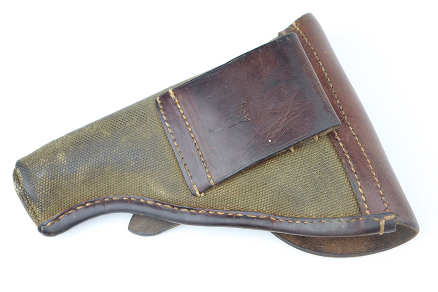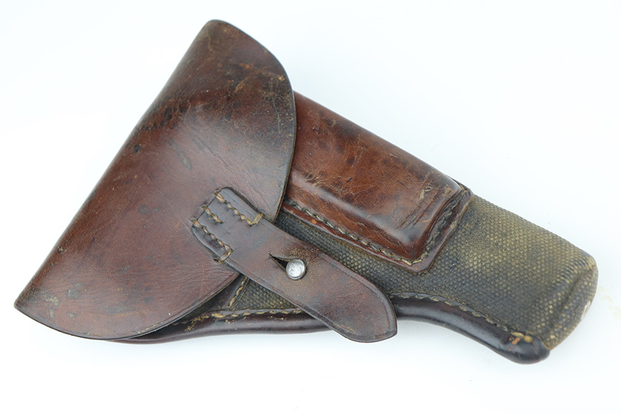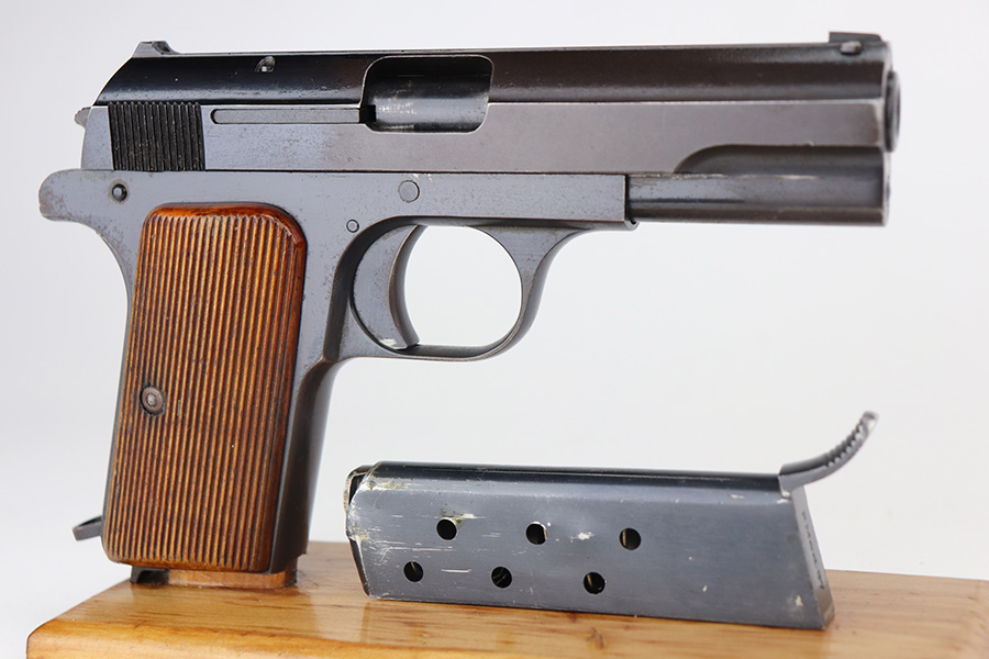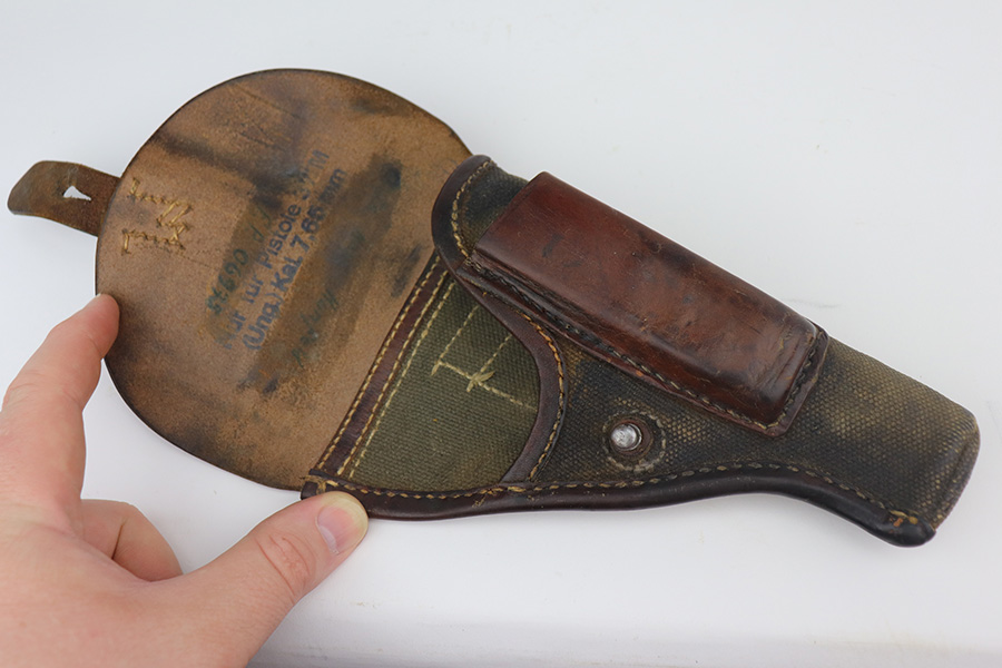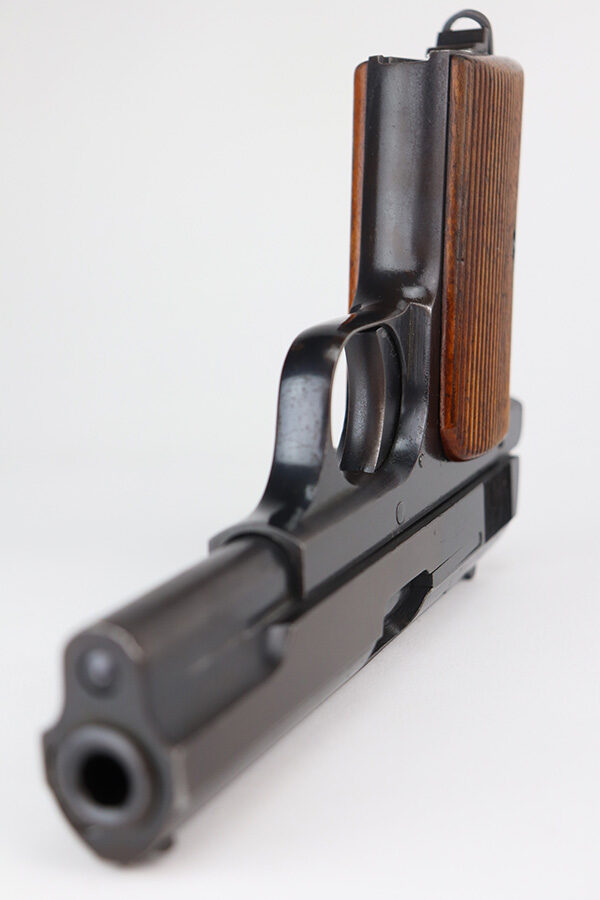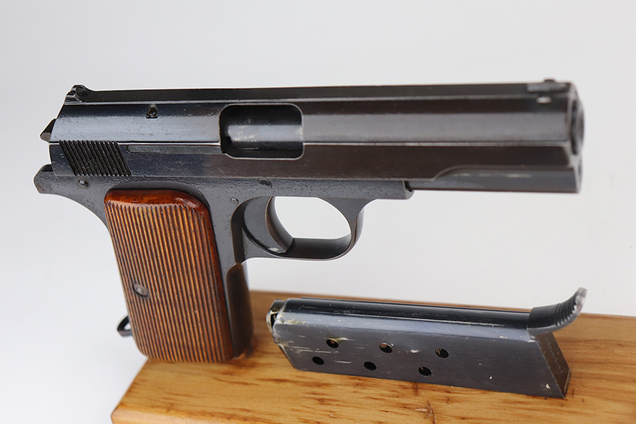 6/18/21 – This is an excellent example of a Femaru Model 37 Rig issued to the Luftwaffe in 1941. The gun is all matching and has the proper waffen proofs. The rig comes with a period-correct mismatched magazine and a nice 1941-dated holster. The gun has retained about 99% of its original finish with a hint of wear around the muzzle. While there is next-to-no finish loss, there is brown patina on the front half of the slide and spotty oxidation throughout. Comes with excellent wood grips. Mint bore.