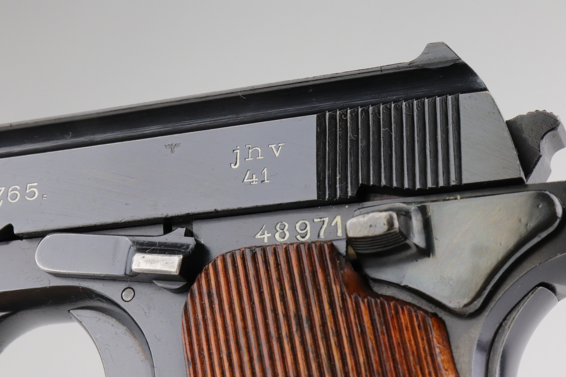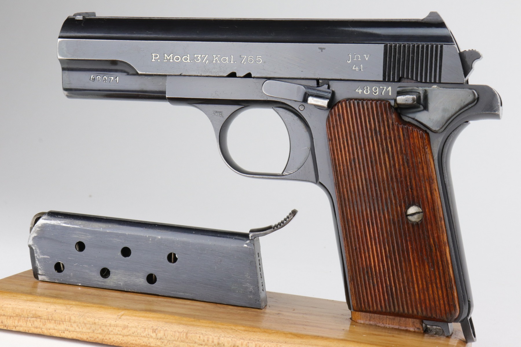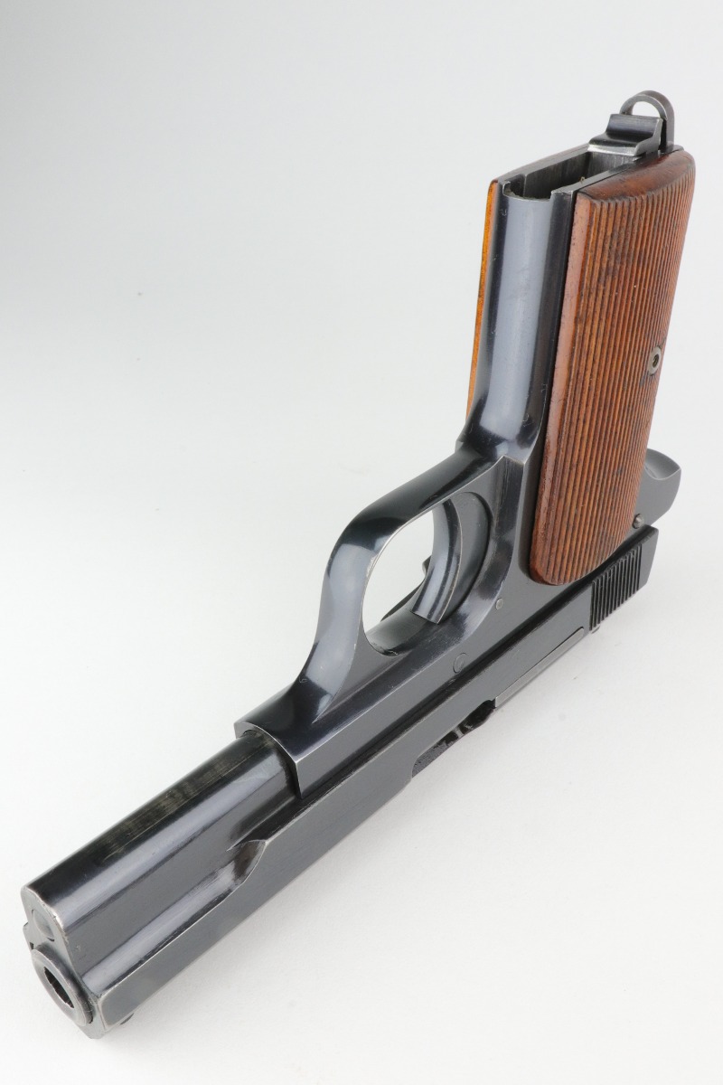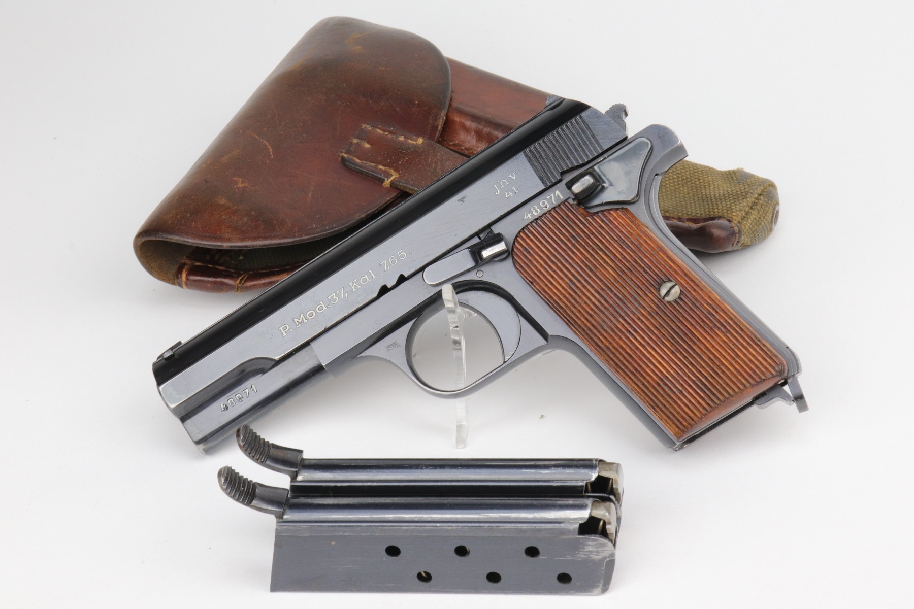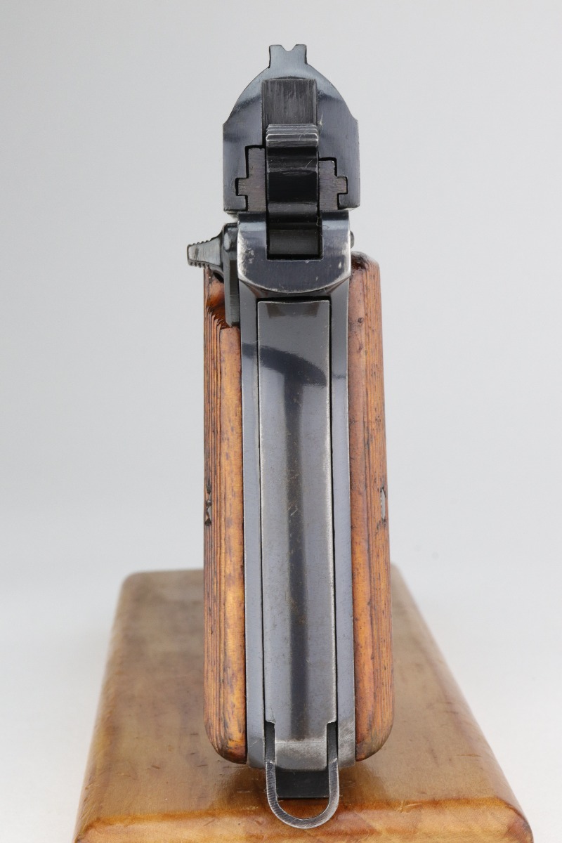 1/7/21 – This is an excellent example of a Femaru M37 issued to the Nazi Luftwaffe in 1941. It is all matching and has a proper military waffen proof on the trigger guard. The rig comes with two original matching magazines and a rare canvas tropical holster. The holster is Luftwaffe-proofed and is dated 1941. The gun is in excellent condition, retaining about 95-96% of its original bluing. There are areas of very minor wear around the muzzle, high edges of the slide, underside of the slide, and on the straps. Some minor oxidation on the back strap. Excellent period-correct grips. The bore is excellent – shiny with strong rifling.