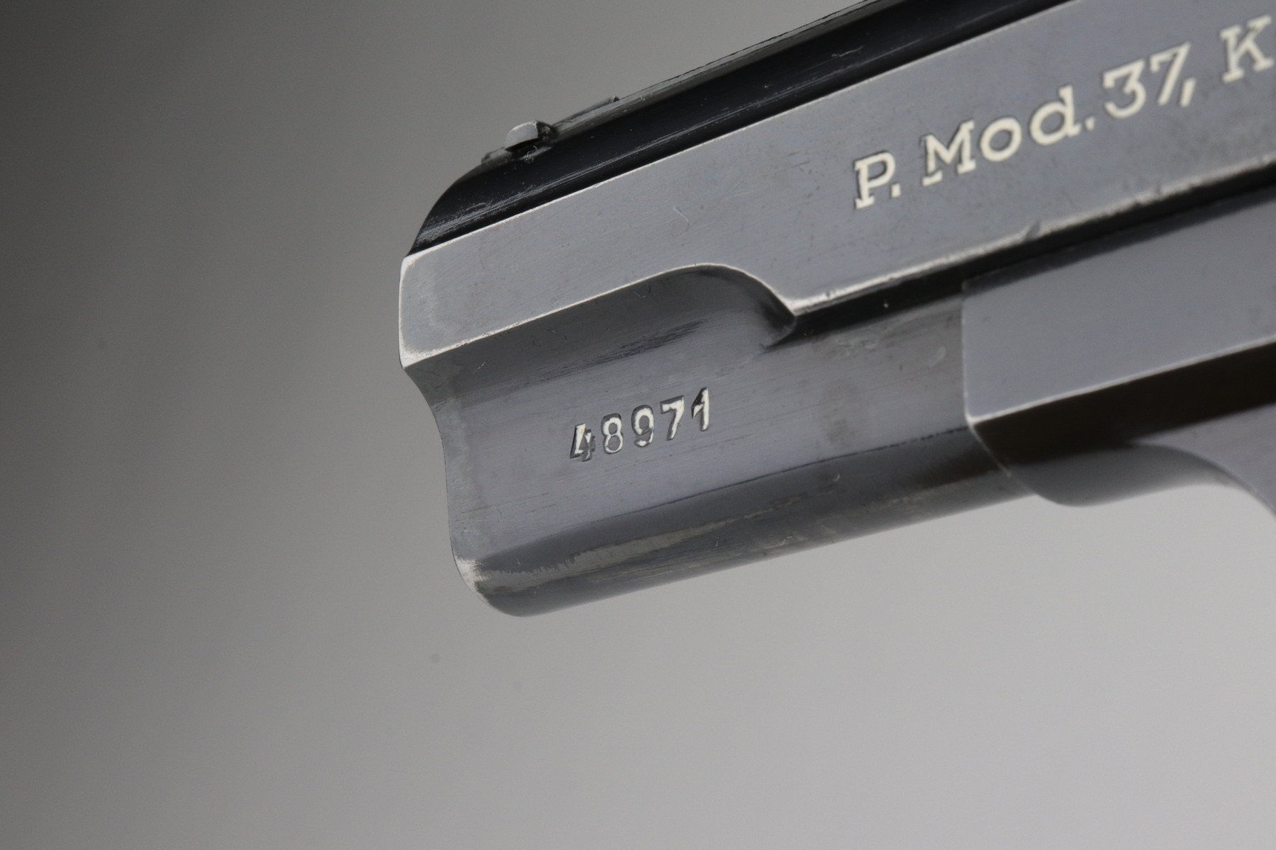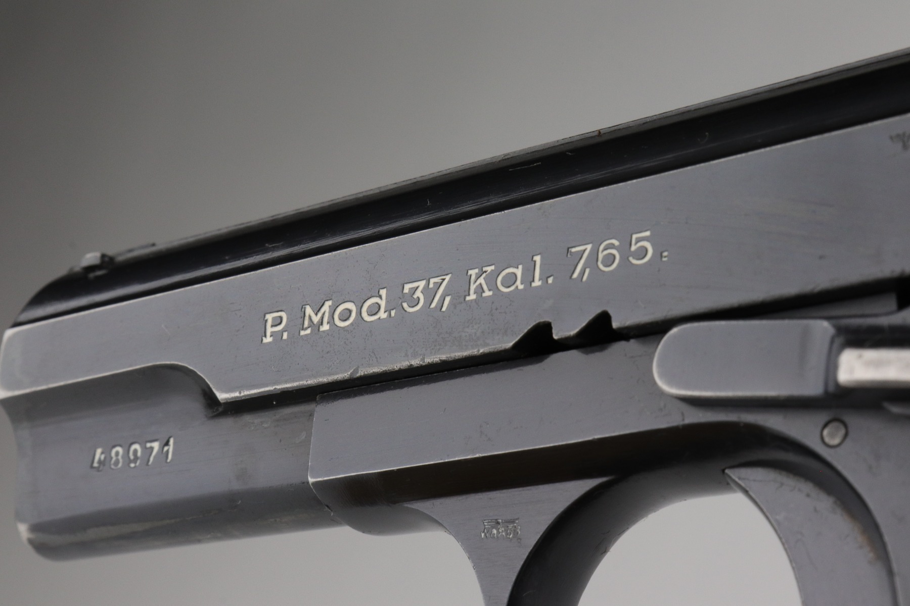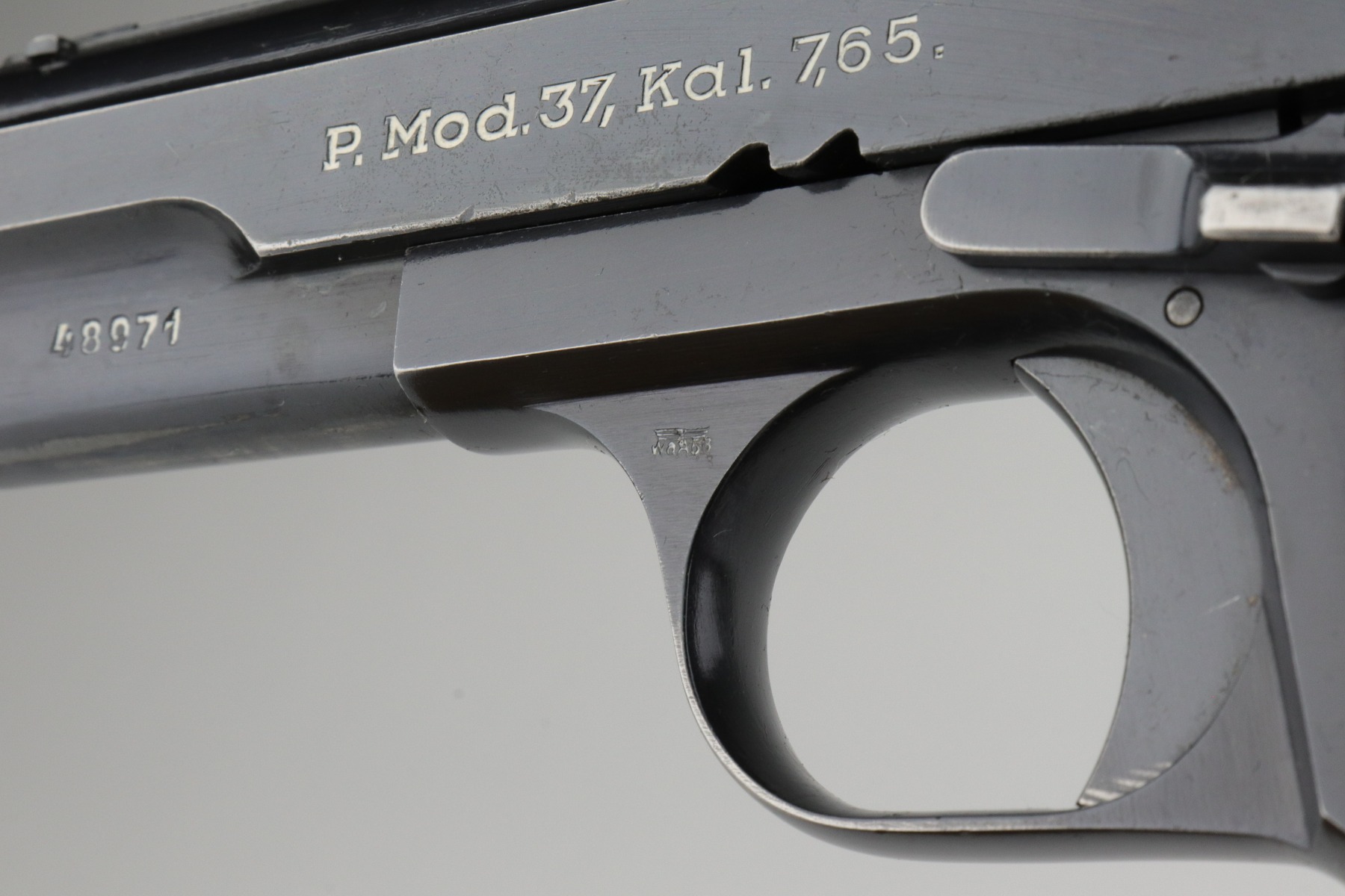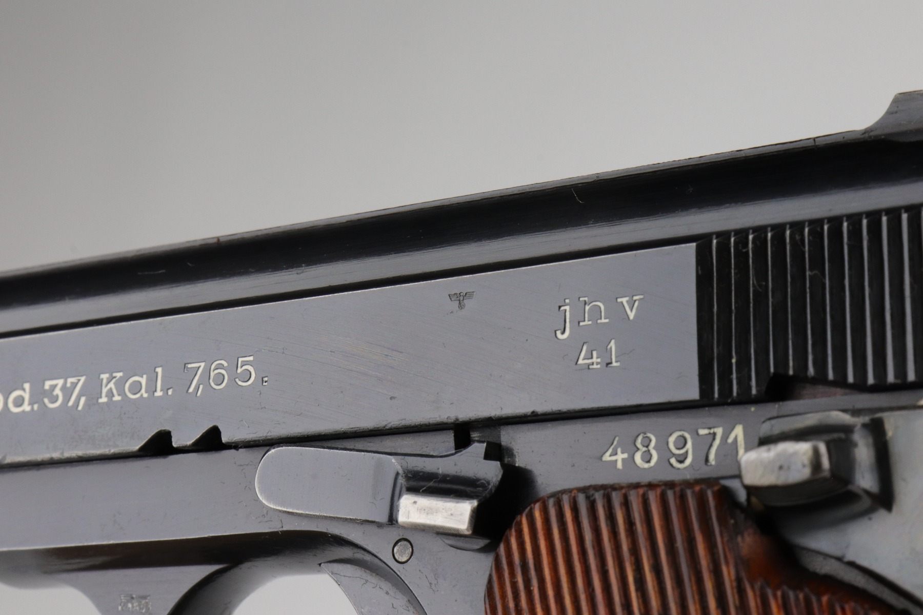 1/7/21 – This is an excellent example of a Femaru M37 issued to the Nazi Luftwaffe in 1941. It is all matching and has a proper military waffen proof on the trigger guard. The rig comes with two original matching magazines and a rare canvas tropical holster. The holster is Luftwaffe-proofed and is dated 1941. The gun is in excellent condition, retaining about 95-96% of its original bluing. There are areas of very minor wear around the muzzle, high edges of the slide, underside of the slide, and on the straps. Some minor oxidation on the back strap. Excellent period-correct grips. The bore is excellent – shiny with strong rifling.