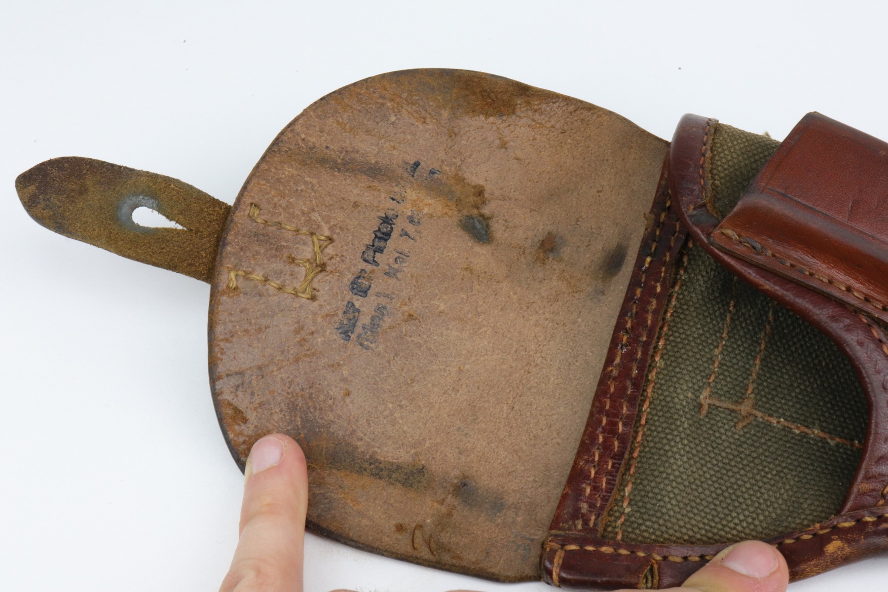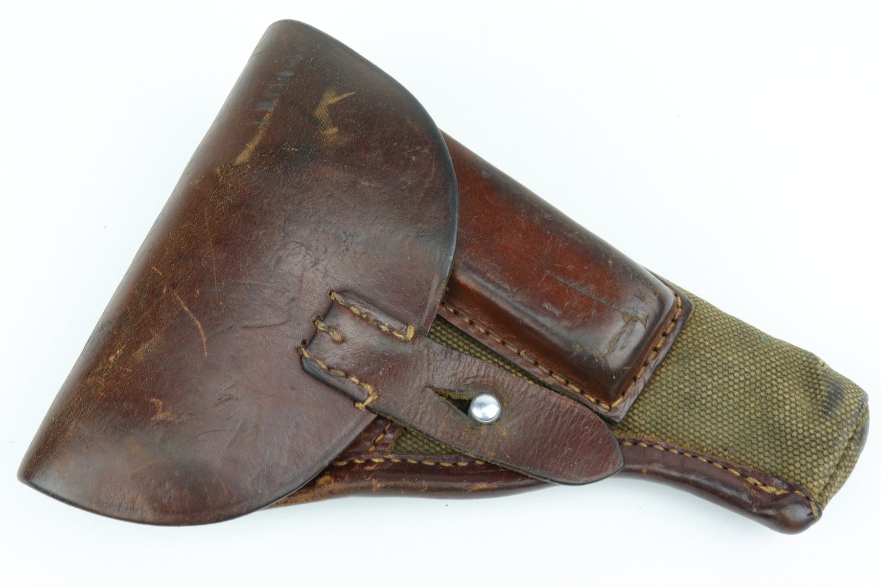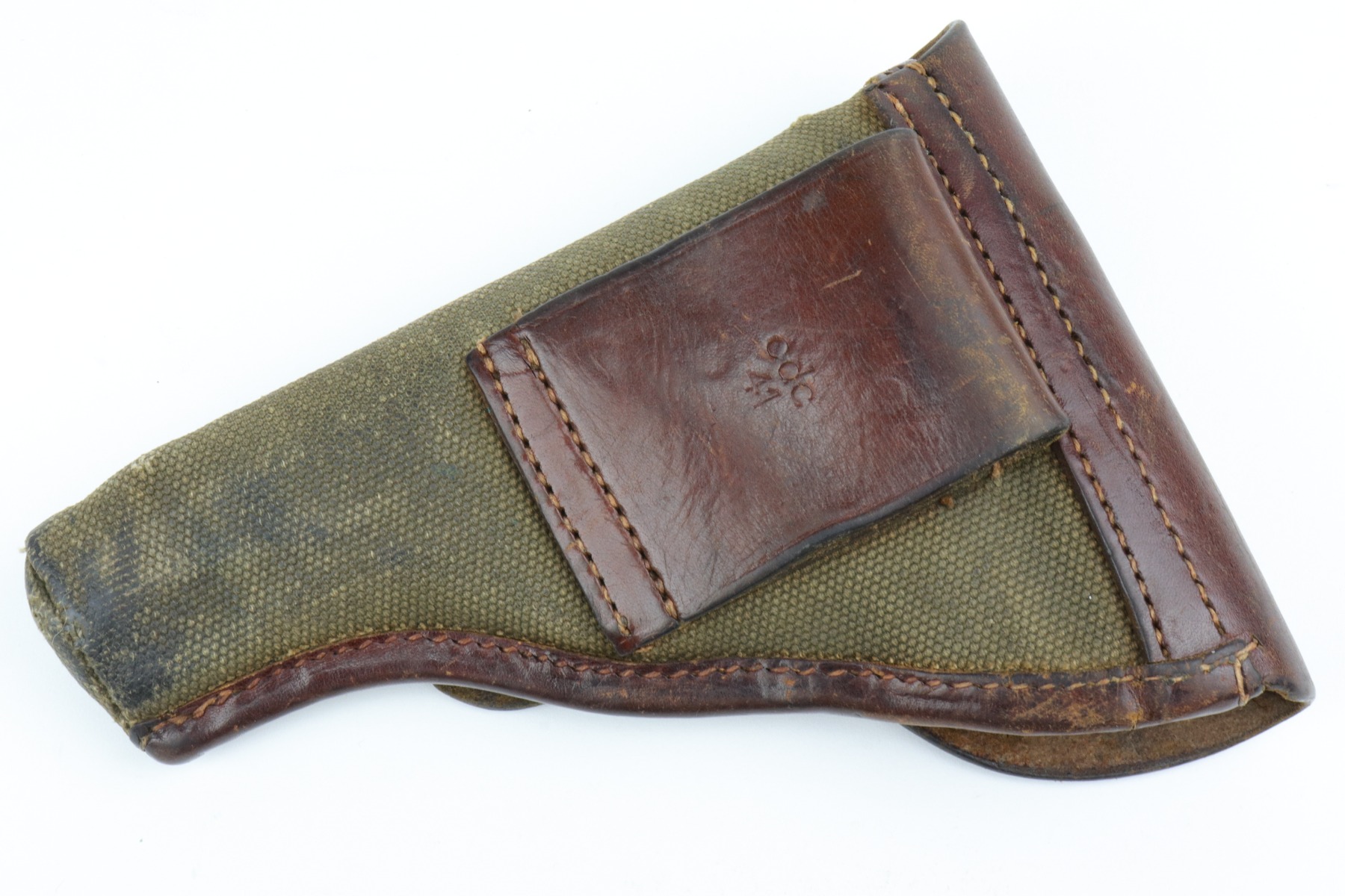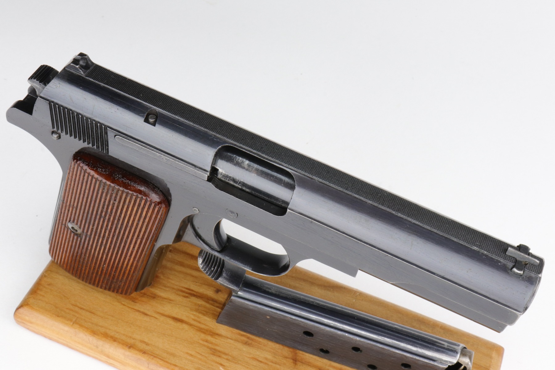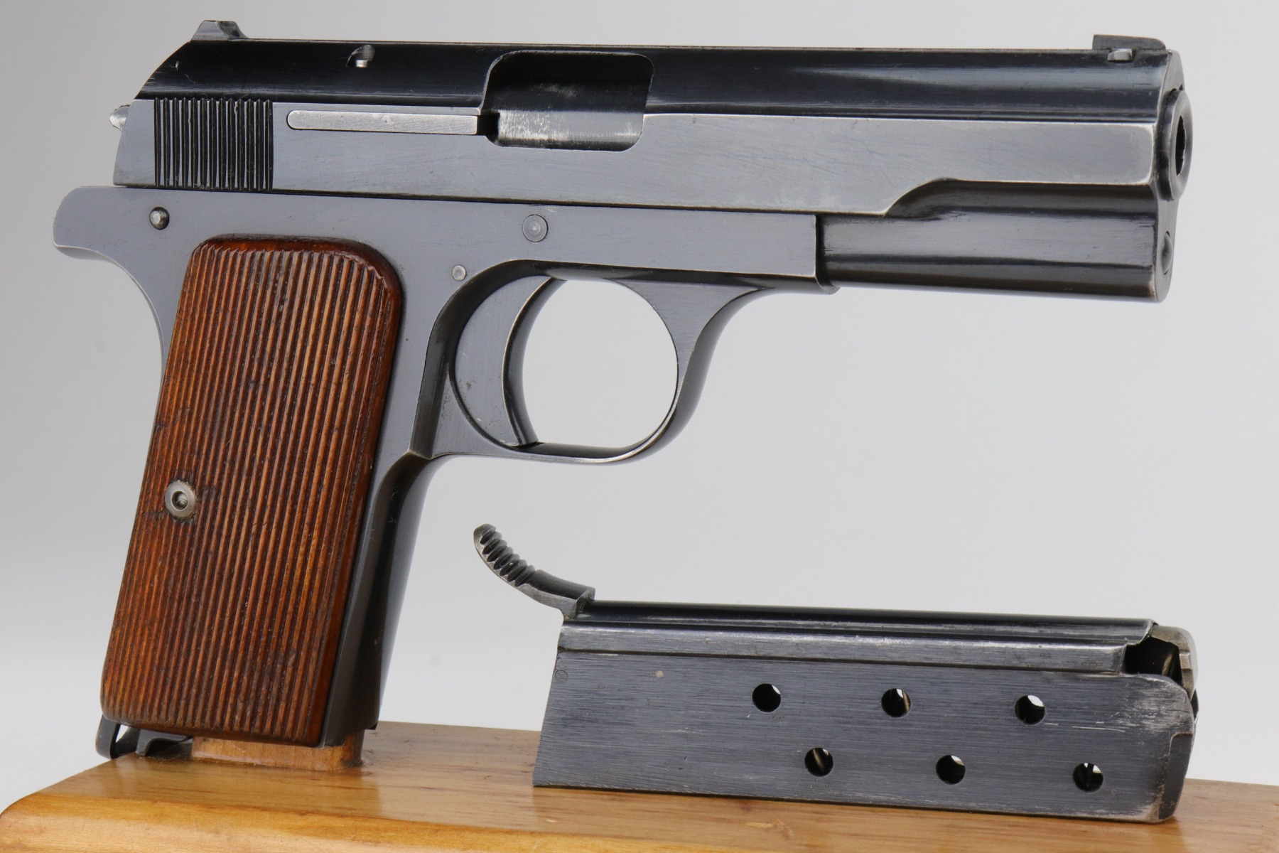 1/7/21 – This is an excellent example of a Femaru M37 issued to the Nazi Luftwaffe in 1941. It is all matching and has a proper military waffen proof on the trigger guard. The rig comes with two original matching magazines and a rare canvas tropical holster. The holster is Luftwaffe-proofed and is dated 1941. The gun is in excellent condition, retaining about 95-96% of its original bluing. There are areas of very minor wear around the muzzle, high edges of the slide, underside of the slide, and on the straps. Some minor oxidation on the back strap. Excellent period-correct grips. The bore is excellent – shiny with strong rifling.