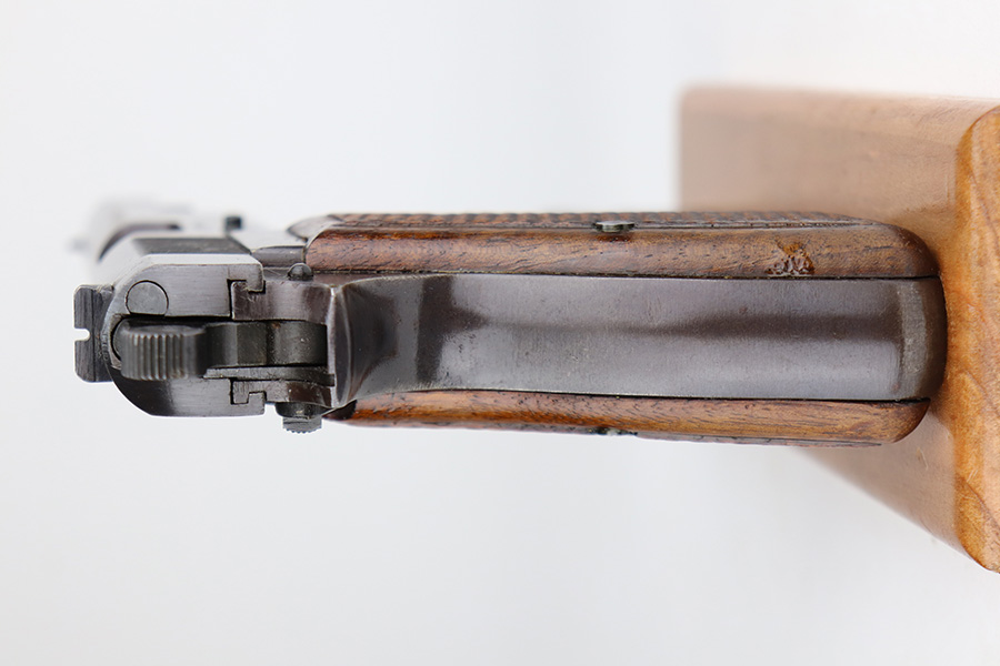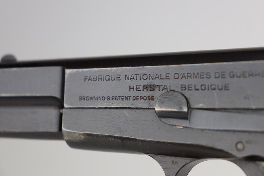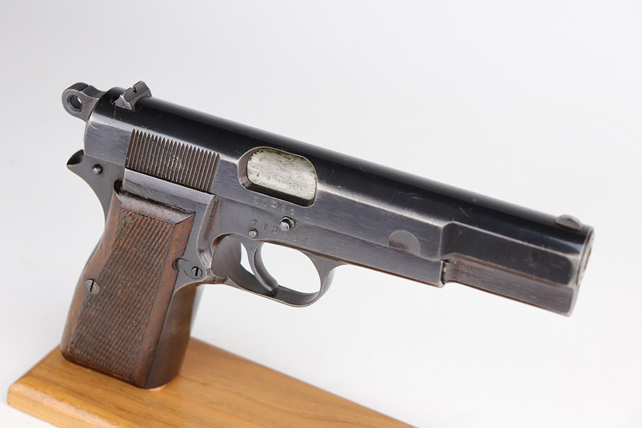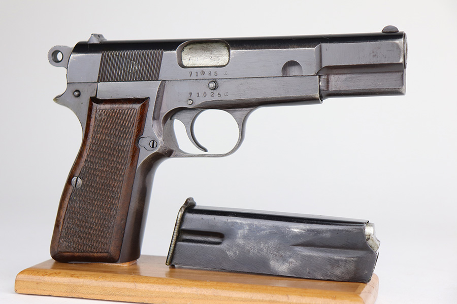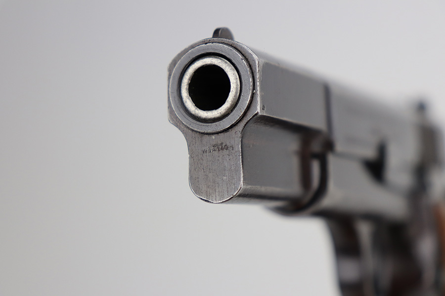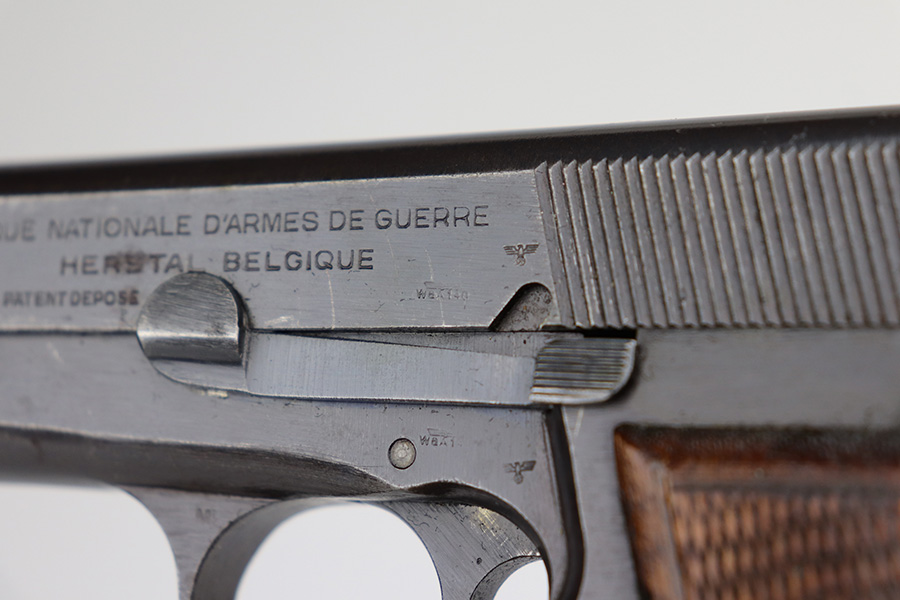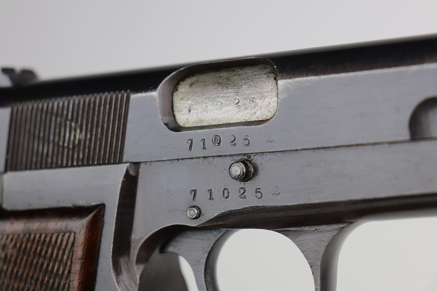 4/29/21 – This is an excellent example of an FN Browning Hi Power issued to the Nazi military during WW2. It is all matching and has the proper “Waffen 140” military proofs throughout. The gun has retained about 95% of its original bluing. There is minor wear on the high edges of the slide, around the muzzle, and a few very small spots of wear on the front strap. There are a few very minor surface scratches on the top of the slide and areas of very minor pin-pricking here and there. Excellent grips that have a light layer of lacquer on them. Comes with one period-correct magazine. The bore is excellent – shiny with strong rifling.