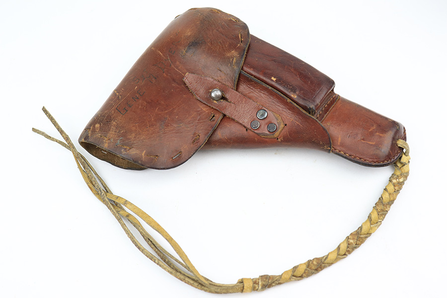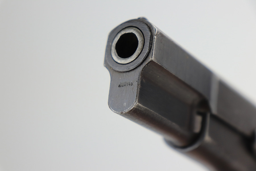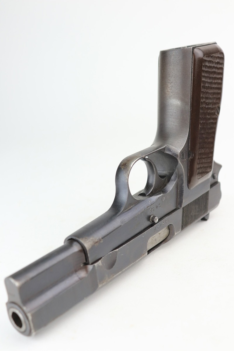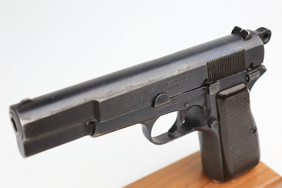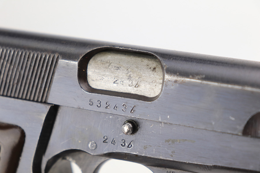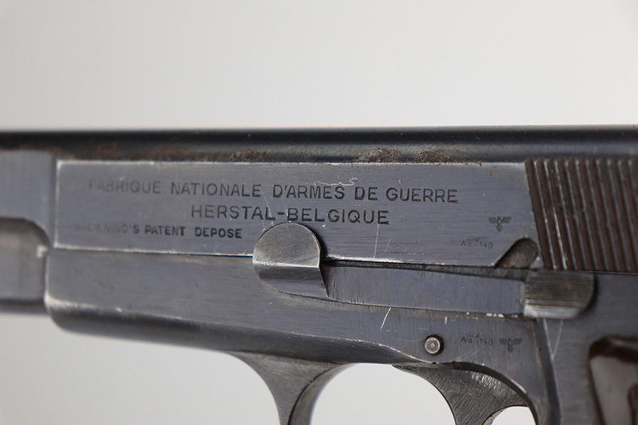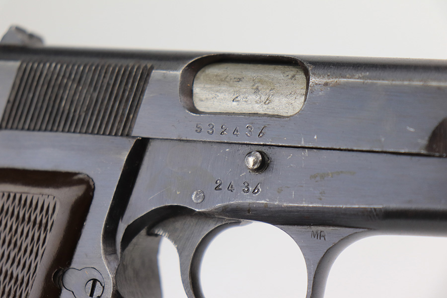 3/16/22 – This is an excellent example of a FN Browning Hi Power issued to the Nazi military during WW2. The gun is all matching and has the proper “Waffen 140” Nazi military acceptance proofs throughout. The gun comes as a rig with a period-correct unmarked magazine and a modified 1944-dated leather holster. The holster has slits cut into it along the top flap, a reinforced closure strap, and an added lanyard. There is a name “Sgt. Gene M Dyer” written on the top flap. The gun has retained about 95-96% of its original finish. Most of the finish loss comes in the form of spotty discoloration along the high edges of both sides of the slide and around the very front edge of the frame. There is a light streak of wear on the front strap and some very minor freckling on both grip straps. Comes with excellent period-correct bakelite grips. Excellent, shiny bore with strong rifling.