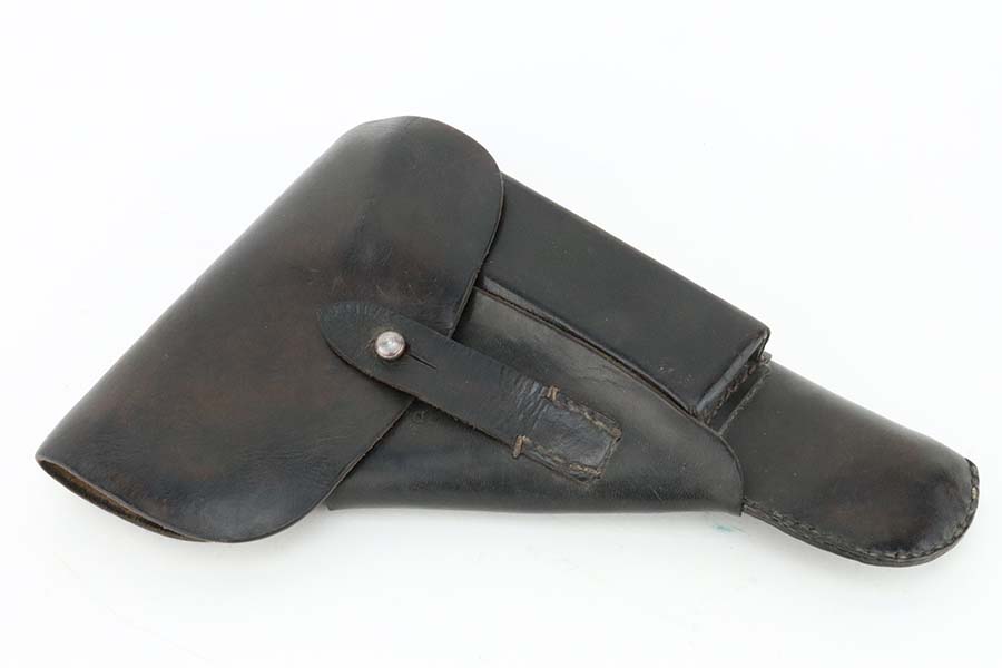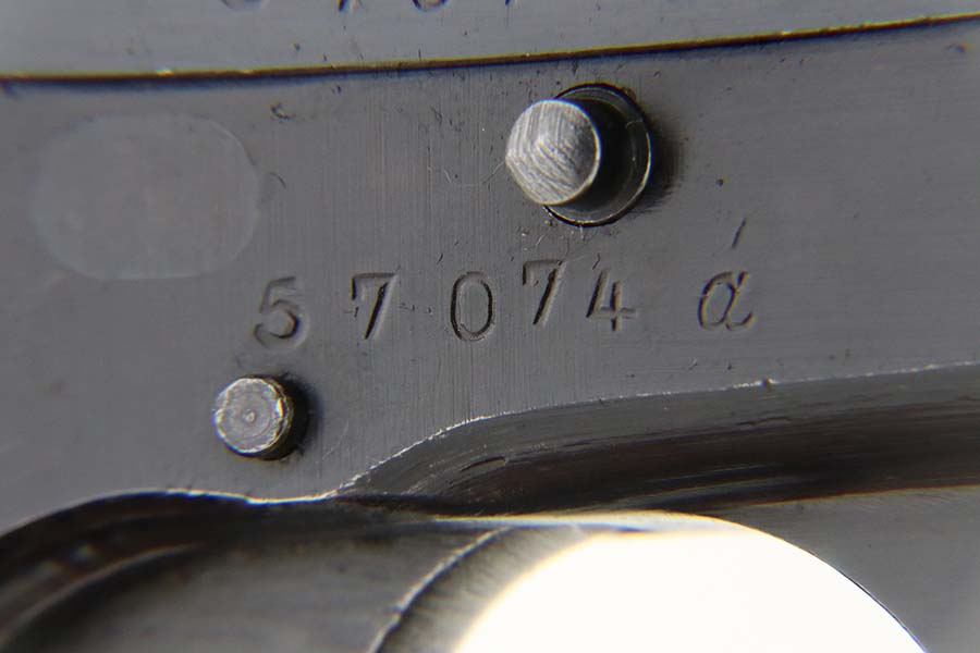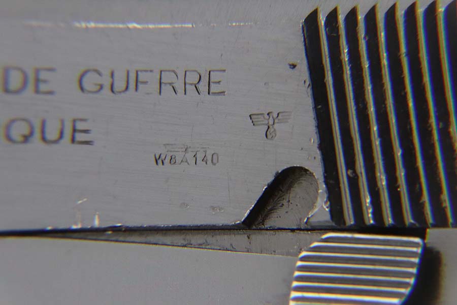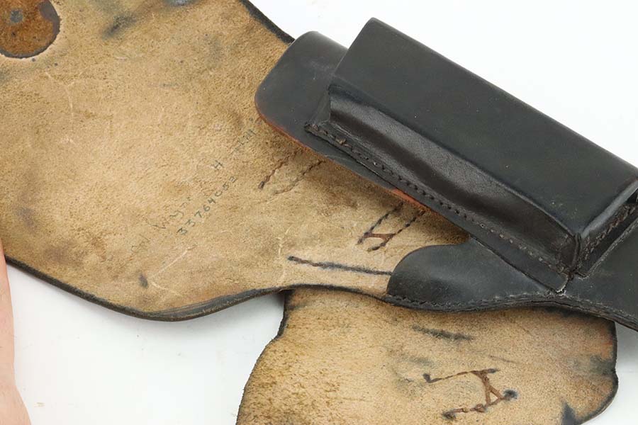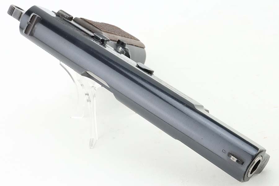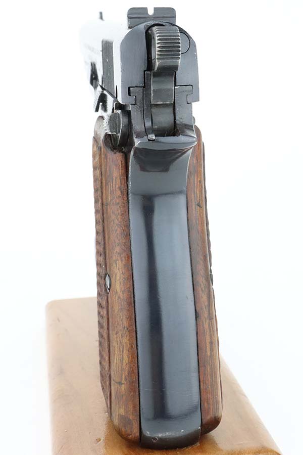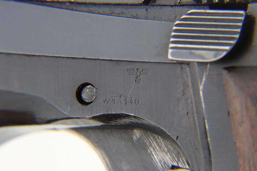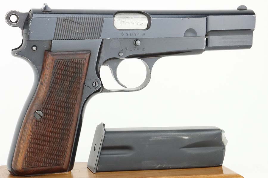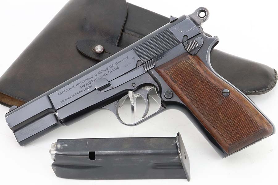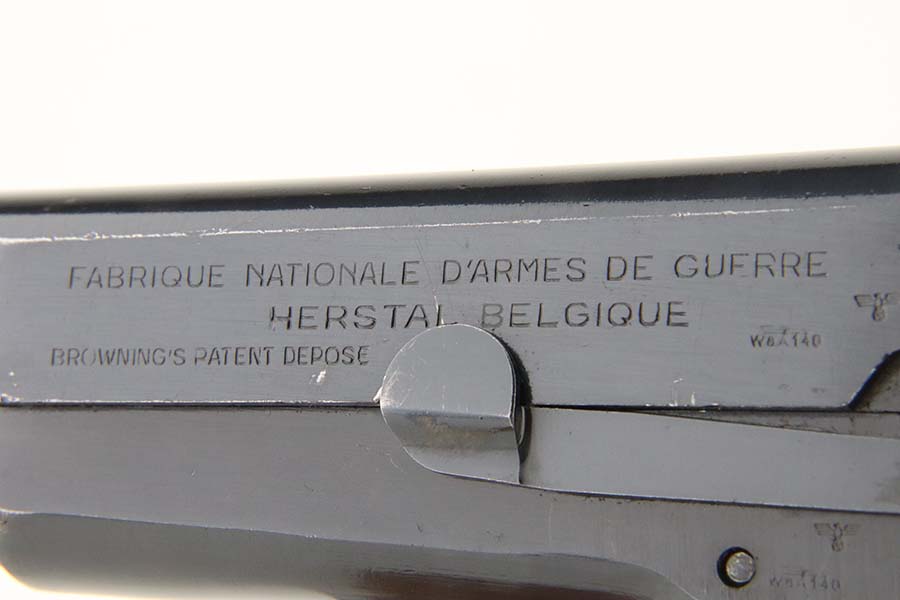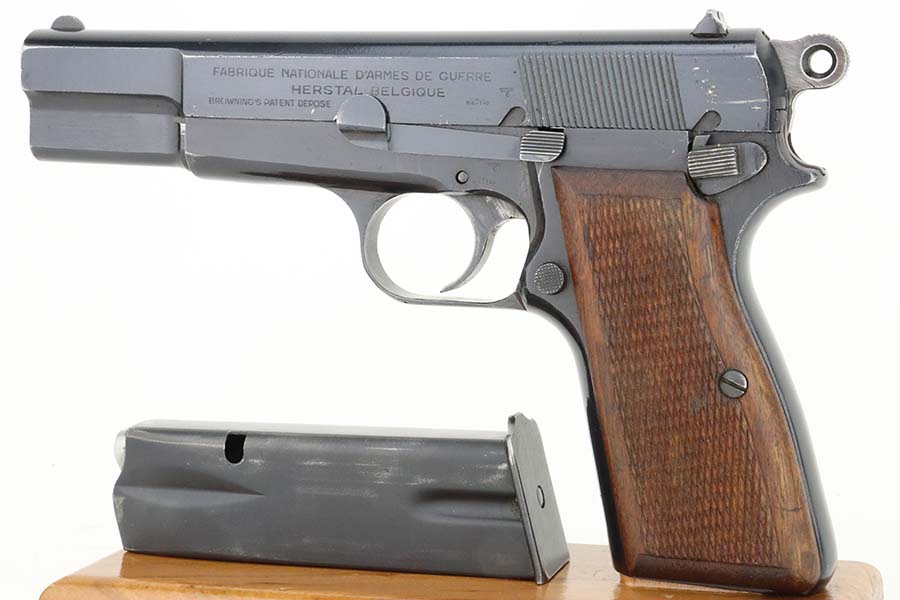 3/15/24 – This is an excellent example of an FN Browning High Power issued to the Nazi military during WW2. It is all matching and has the proper “Waffen 140” military acceptance proofs throughout. Comes as a rig with one un-marked magazine and a nice 1944-dated holster. The original finish rates about 96% with hints of high edge wear and some tiny marks at the back left of the slide. Fitted with nice period-correct wood grips. Mint bore.