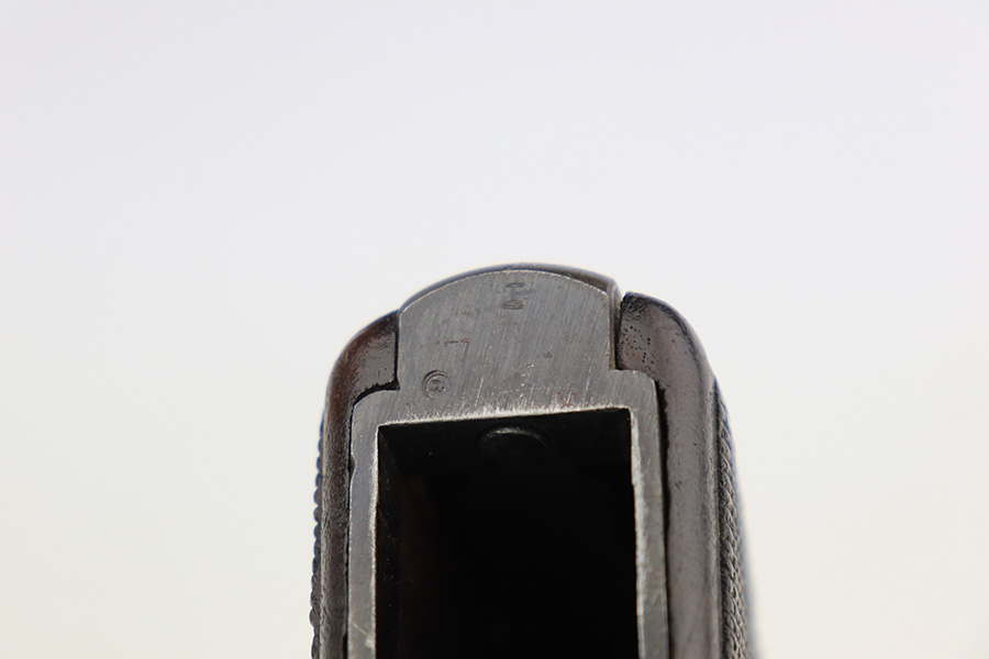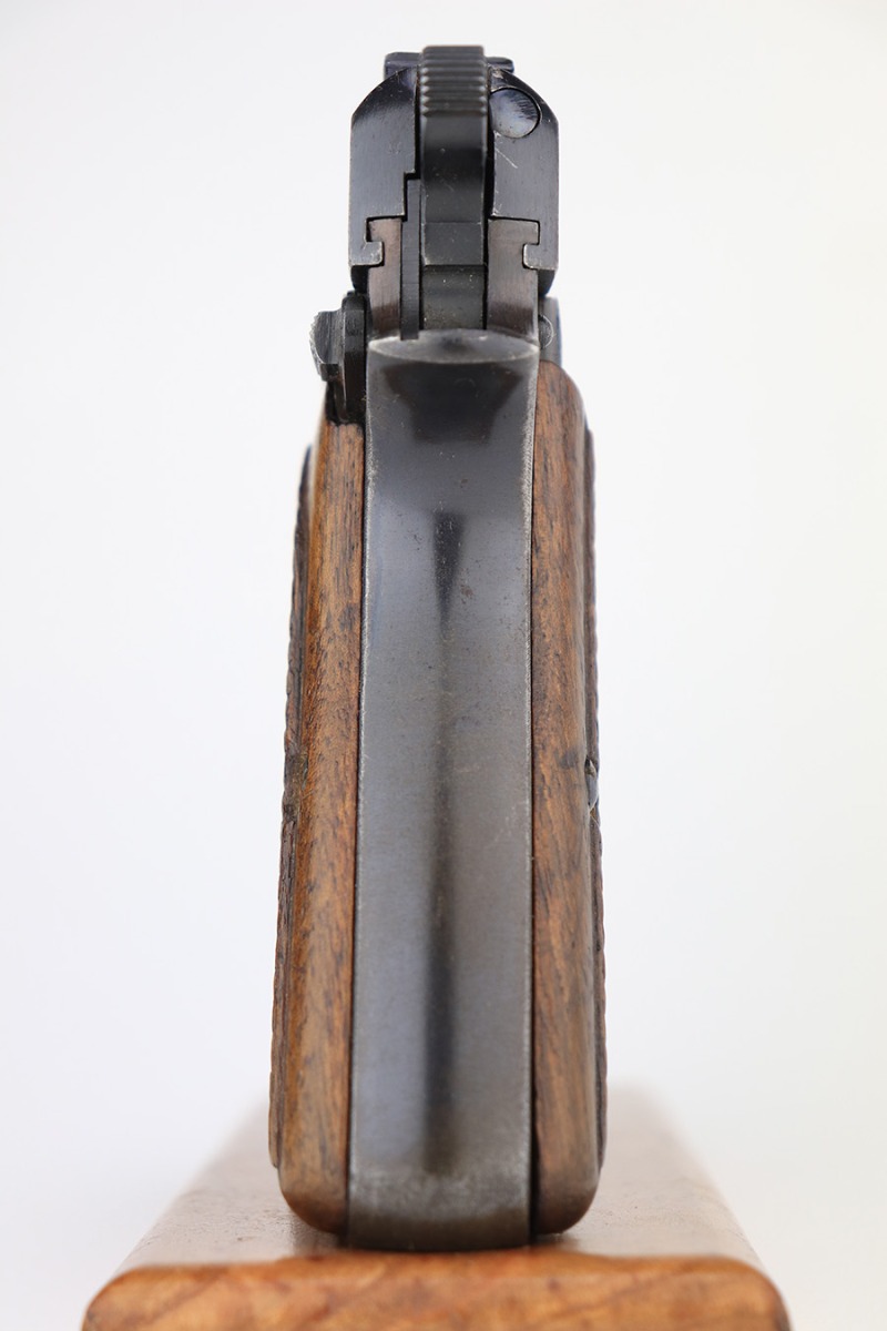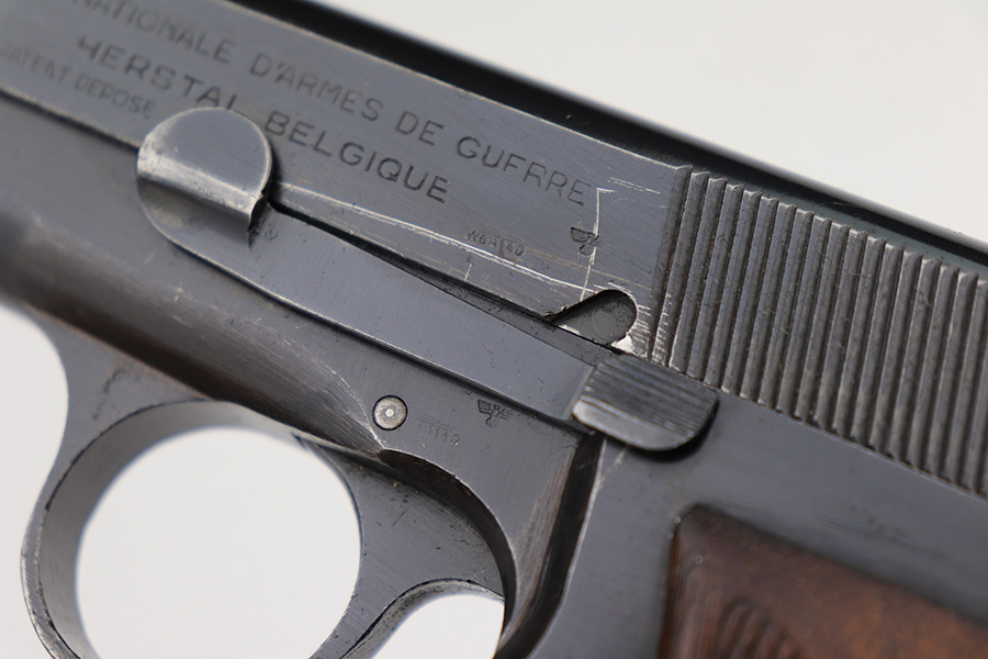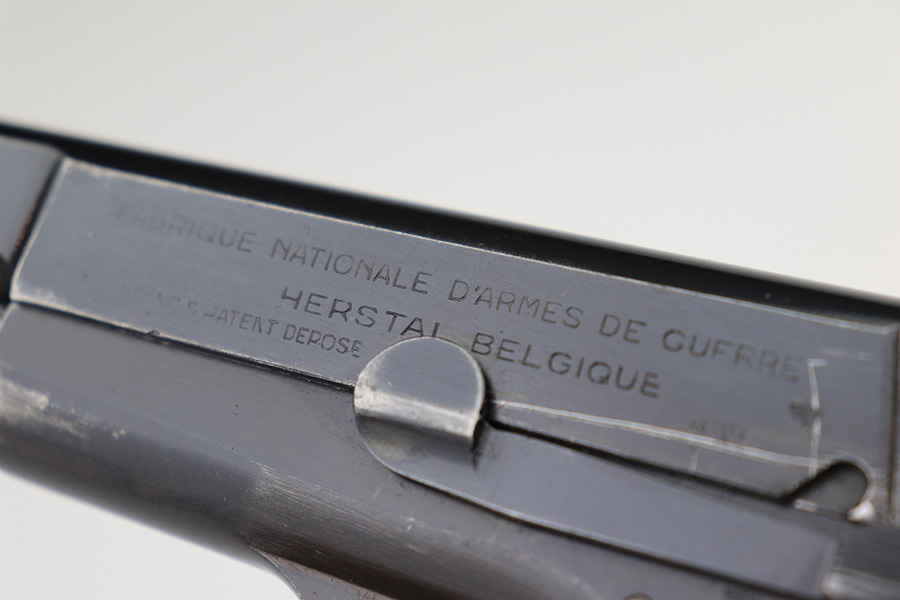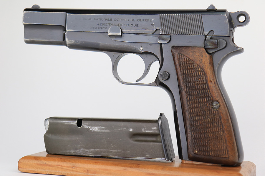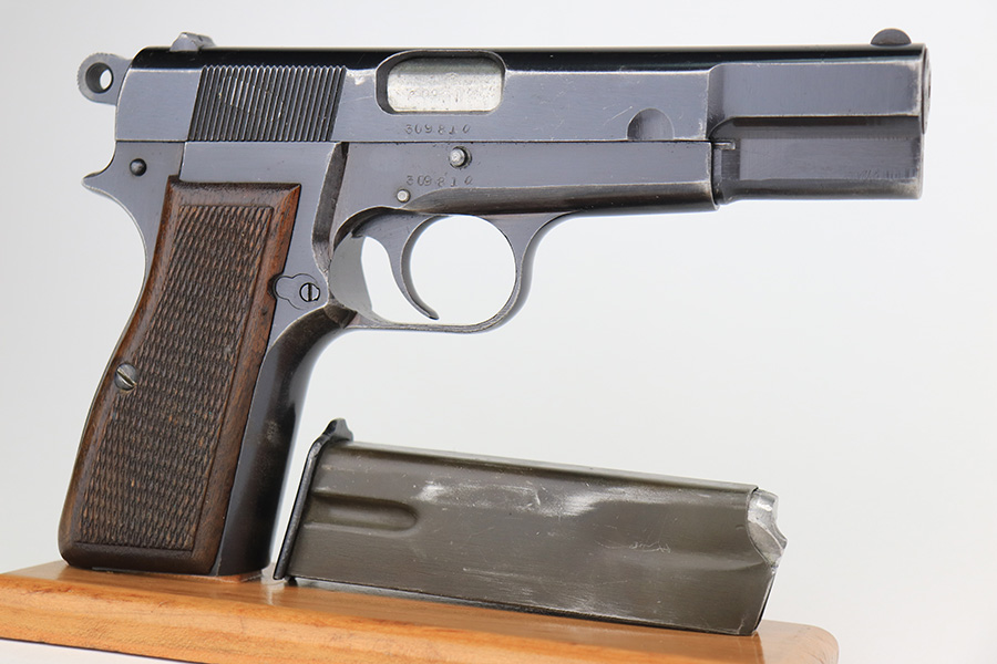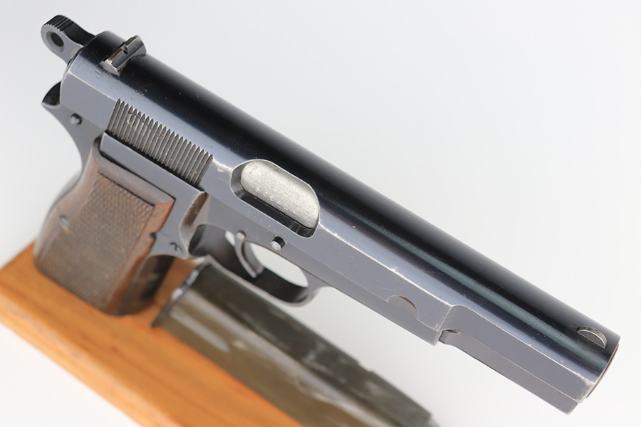 3/16/23 – This is an excellent example of an FN Browning High Power issued to the Nazi military during WW2. It is all matching and has the proper “Waffen 140” military proofs. It has retained about 96-97% of its original finish. There is very minor wear around the muzzle, wear on the high edges in general, some dulling on the grip straps, and some light scratches around the slide stop. Comes with wood grips – the left panel has been modified and re-checkered. Also comes with an un-marked magazine. Mint bore.