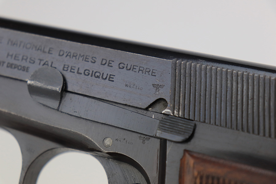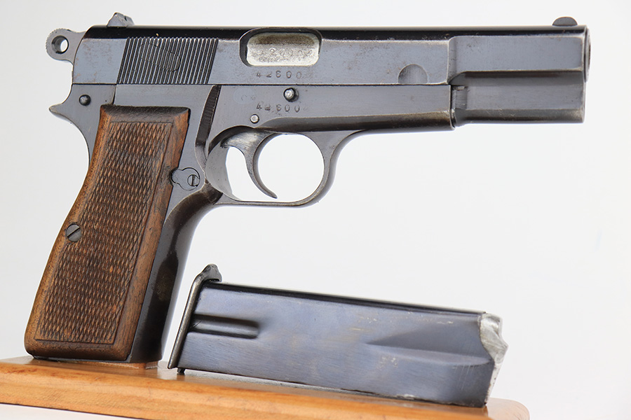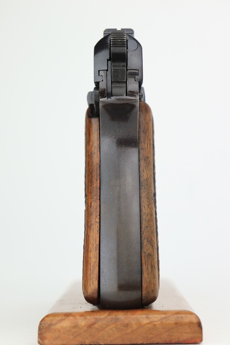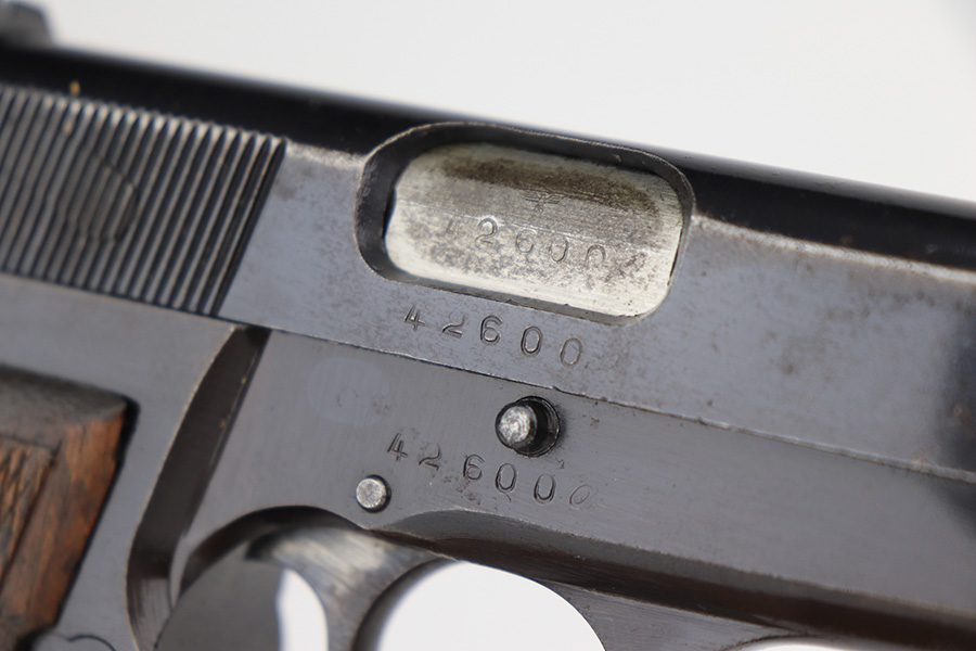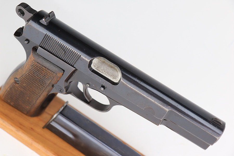 4/13/23 – The High Power was the first pistol to use a double stack mag that holds 13 rounds. This pistol was made in Belgium while under Nazi occupation while using Nazi-manufactured parts. It has two Nazi test proofs on the left side of the frame and slide above and below the lever. It has a “Waffen 140” just to the left of the test proofs and on the barrel ring. The magazine is “Waffen 140” proofed on the lower part of the spine. The gun ha a fixed front sight with no stock lug. It has retained about 96% of its original finish with very minor wear around the muzzle and on some of the high edges. One small area of minor wear on the front strap. Excellent period-correct wood grips. Excellent bore with strong rifling.