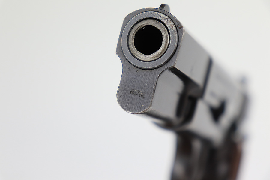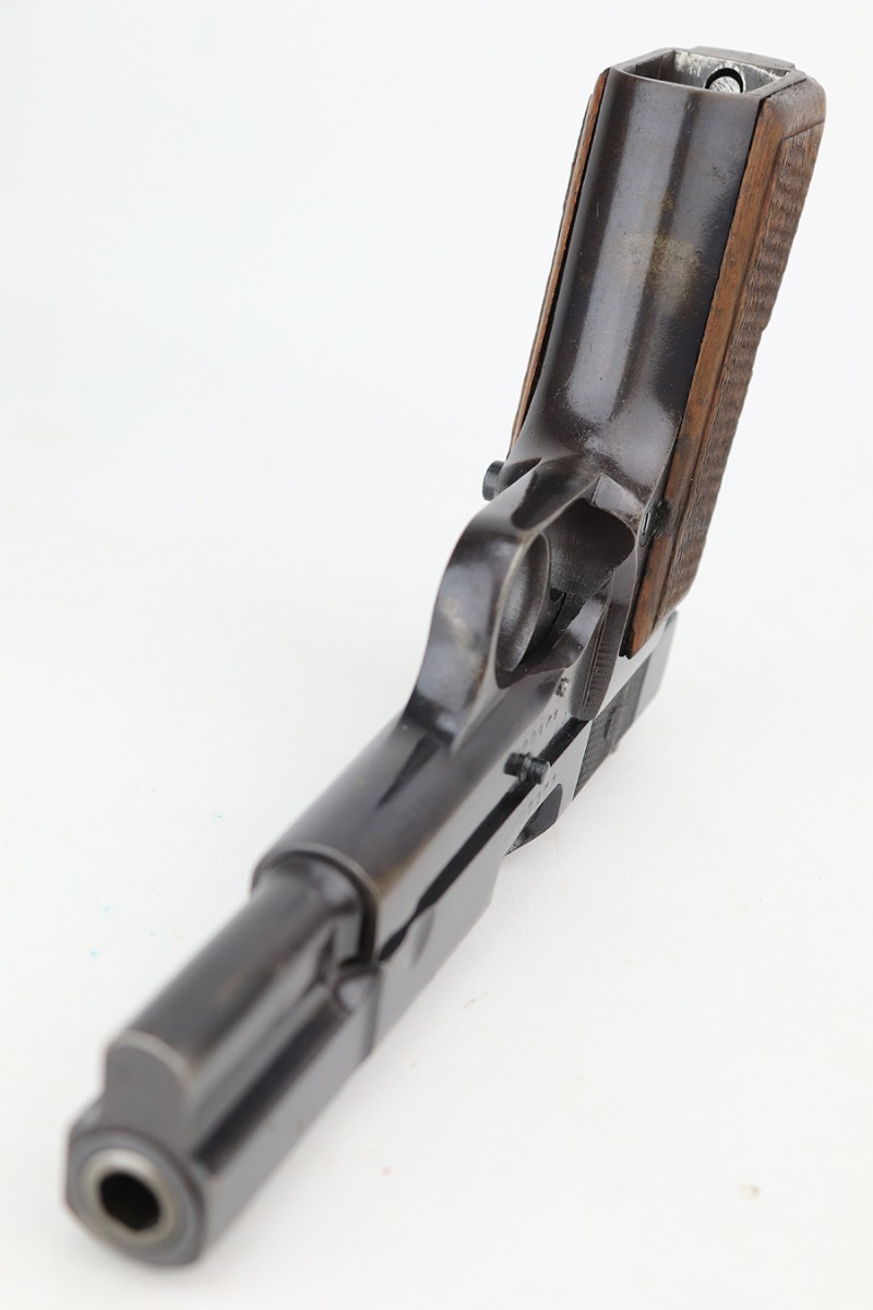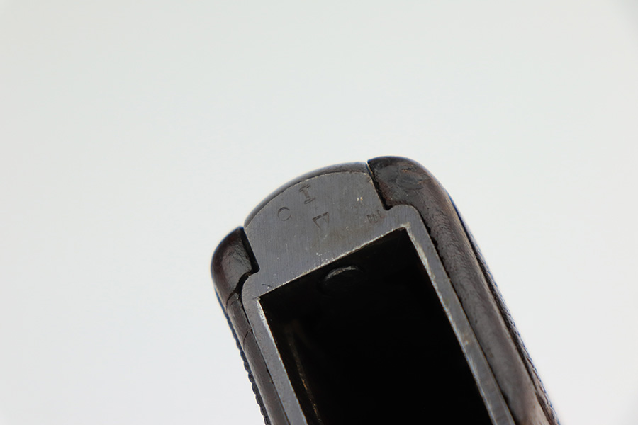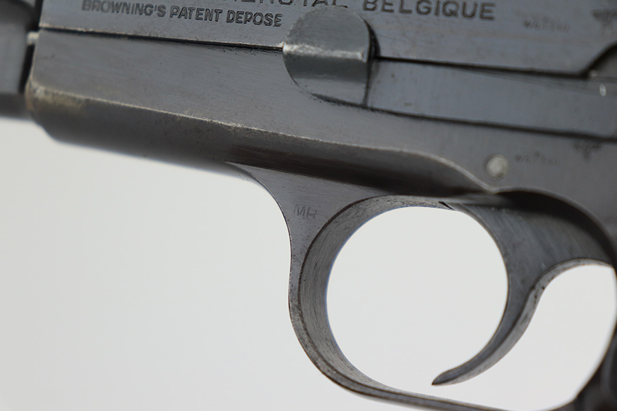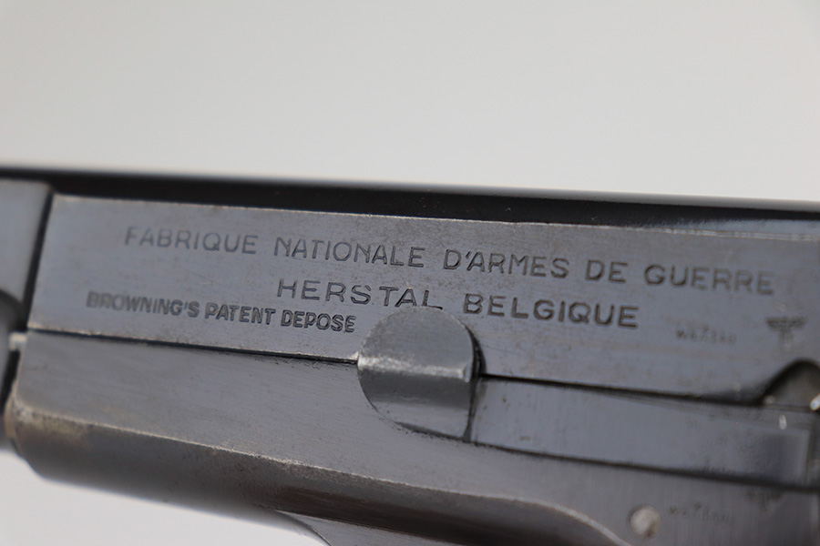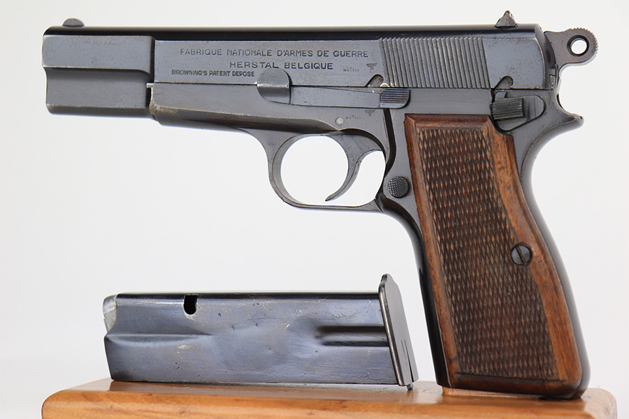 4/13/23 – The High Power was the first pistol to use a double stack mag that holds 13 rounds. This pistol was made in Belgium while under Nazi occupation while using Nazi-manufactured parts. It has two Nazi test proofs on the left side of the frame and slide above and below the lever. It has a “Waffen 140” just to the left of the test proofs and on the barrel ring. The magazine is “Waffen 140” proofed on the lower part of the spine. The gun ha a fixed front sight with no stock lug. It has retained about 96% of its original finish with very minor wear around the muzzle and on some of the high edges. One small area of minor wear on the front strap. Excellent period-correct wood grips. Excellent bore with strong rifling.