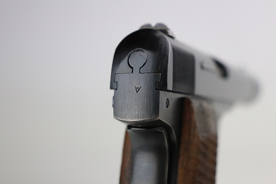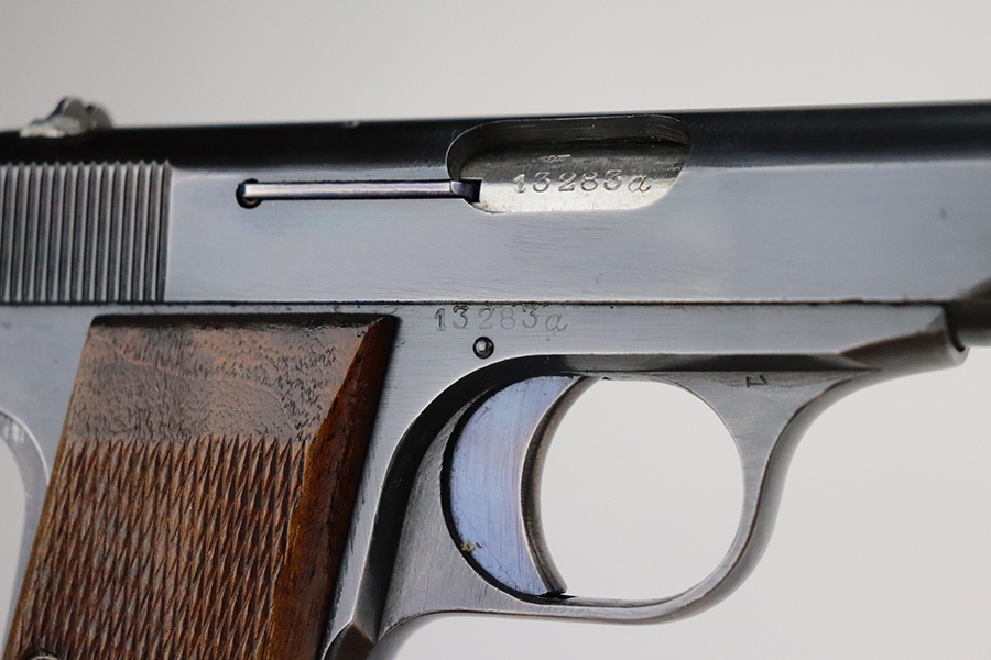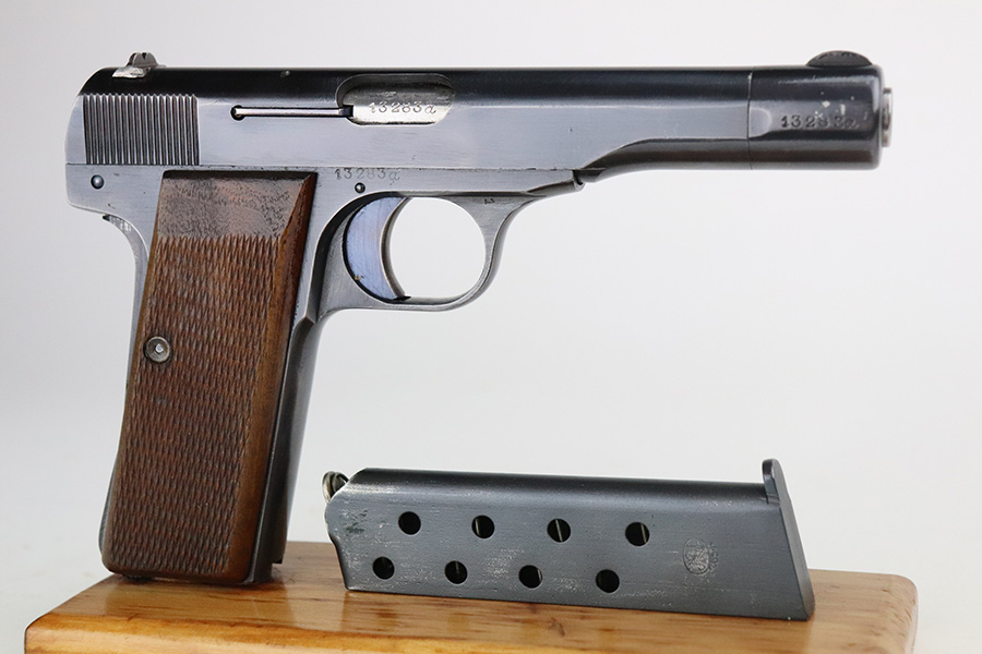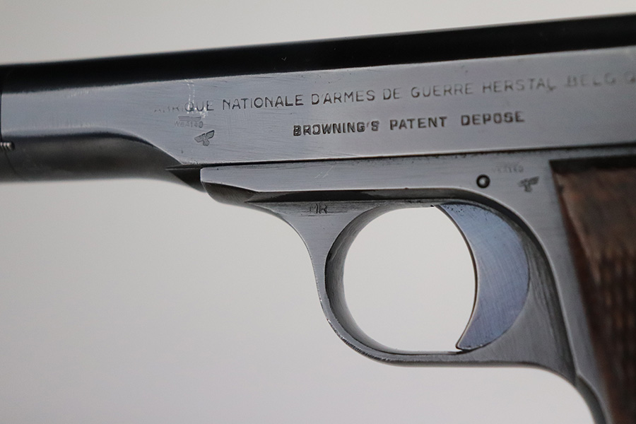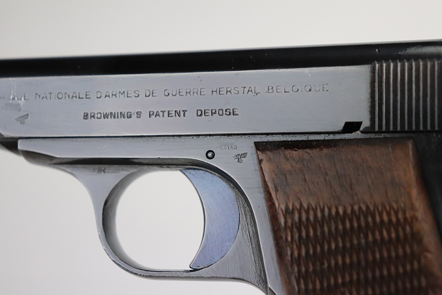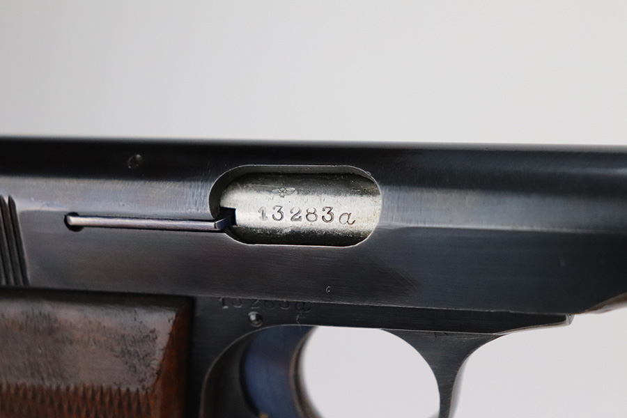 7/16/21 – This is an excellent example of an FN Browning Model 1922 issued to the Nazi military during WW2. It is all matching and has the proper “Waffen 140” military proofs. It has retained about 97-98% of its bluing. There is very minor wear around the high edges and minor thinning on the straps. There are a few dots of discoloration around the muzzle. Comes with excellent grips and a period-correct magazine. Mint bore.