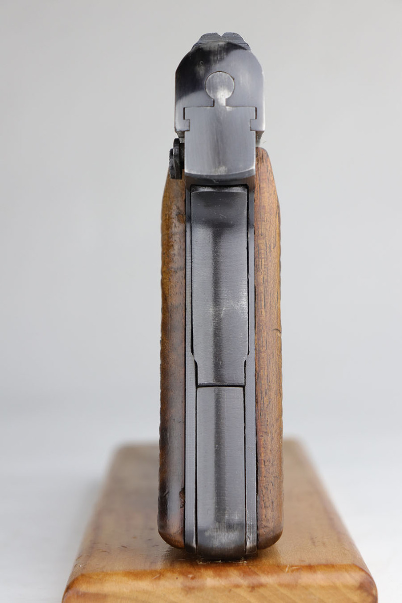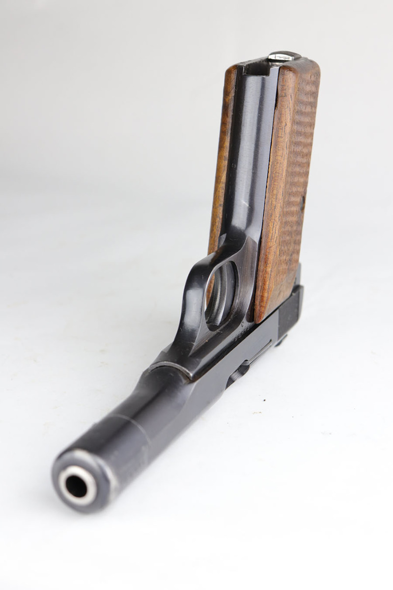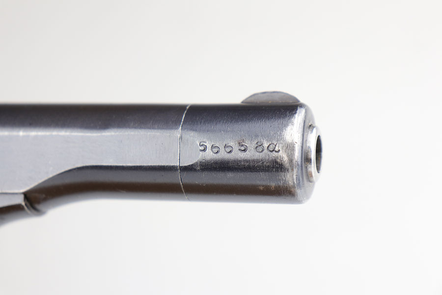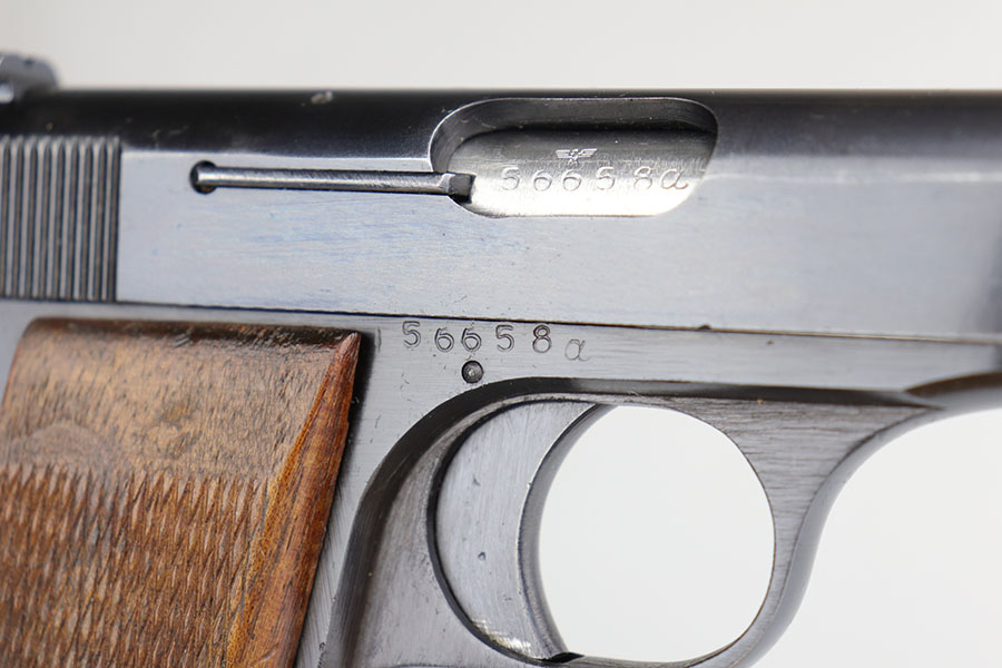 7/29/20 – This is an excellent and complete FN Browning M1922 rig that was issued to the German Army during the war. It has WaA140 proofs on slide and frame. The bluing is excellent with standard holster wear on the muzzle, and a bit of finish loss on the back of the frame/slide. It’s all matching and original with a mint bore and excellent wood grips. Serial dates the gun to about 1943, and the holster is also marked ’43 on the closure strap. Both magazines are original and also have WaA140 proofs on spine. The rig is completed by a minty holster that has internal Browning inkstamp.
