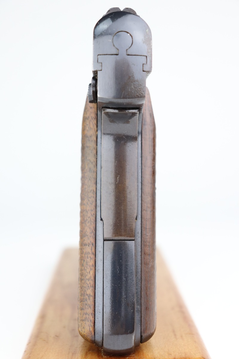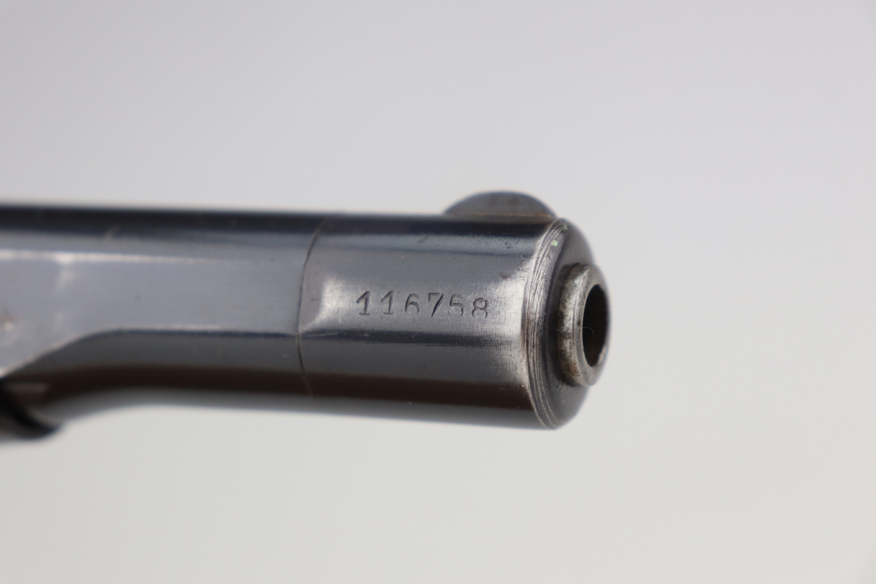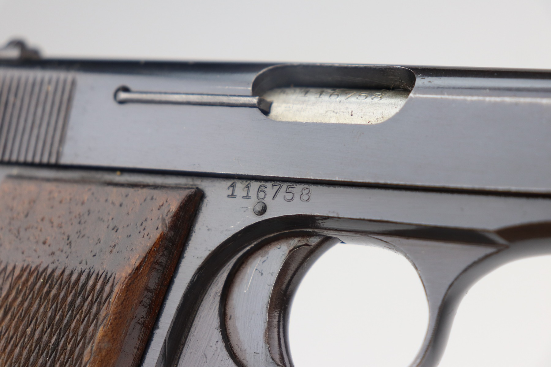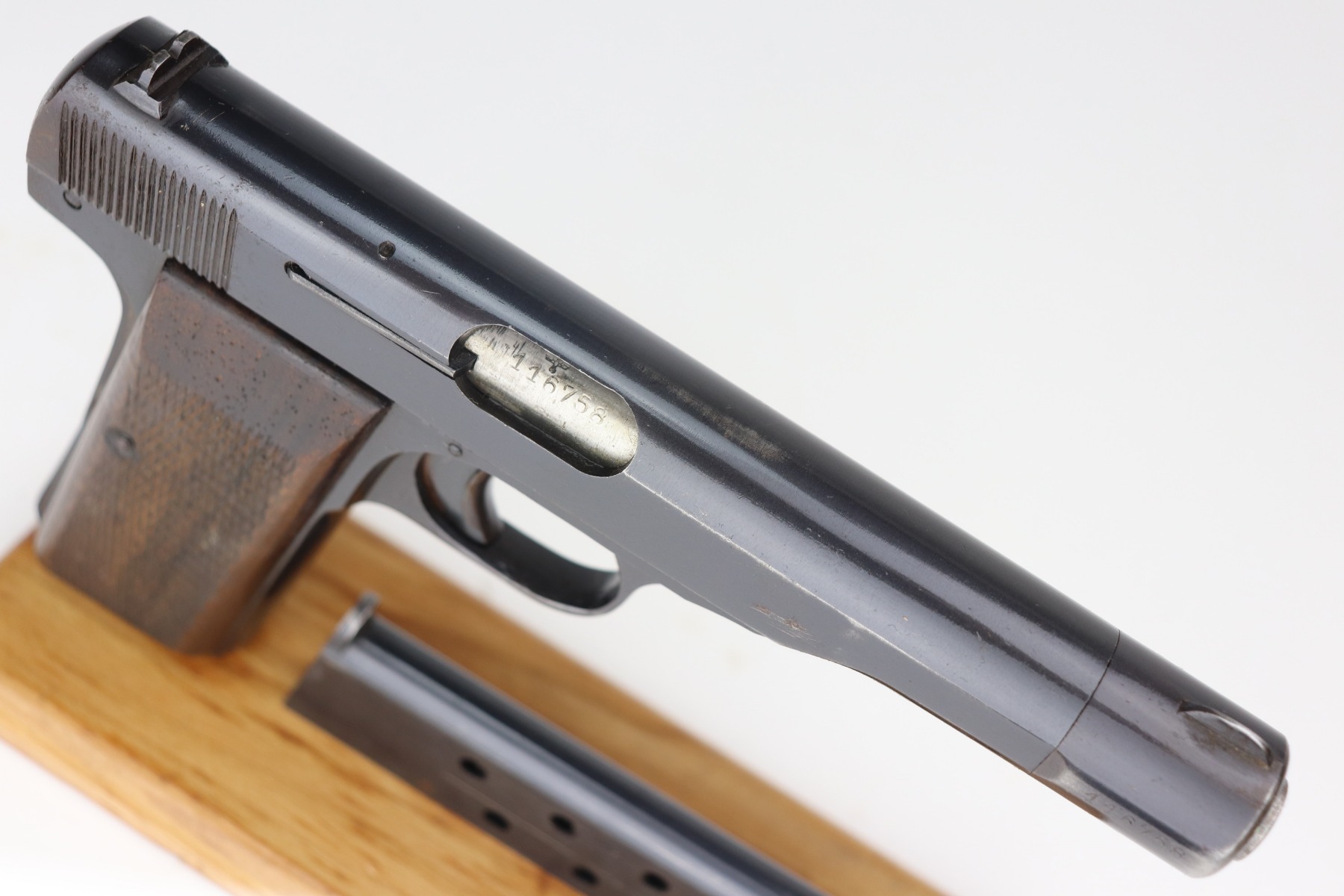 2/15/21 – This is an excellent example of an FN Browning Model 1922 Rig issued to the Nazi military during WW2. This one is all matching and has the proper “Waffen 140” military proofs. There is minor wear around the muzzle and high edges of the slide. Some patina on the straps. The rig comes with an excellent period-correct holster and two period-correct magazines. Excellent grips. The bore is near-mint.