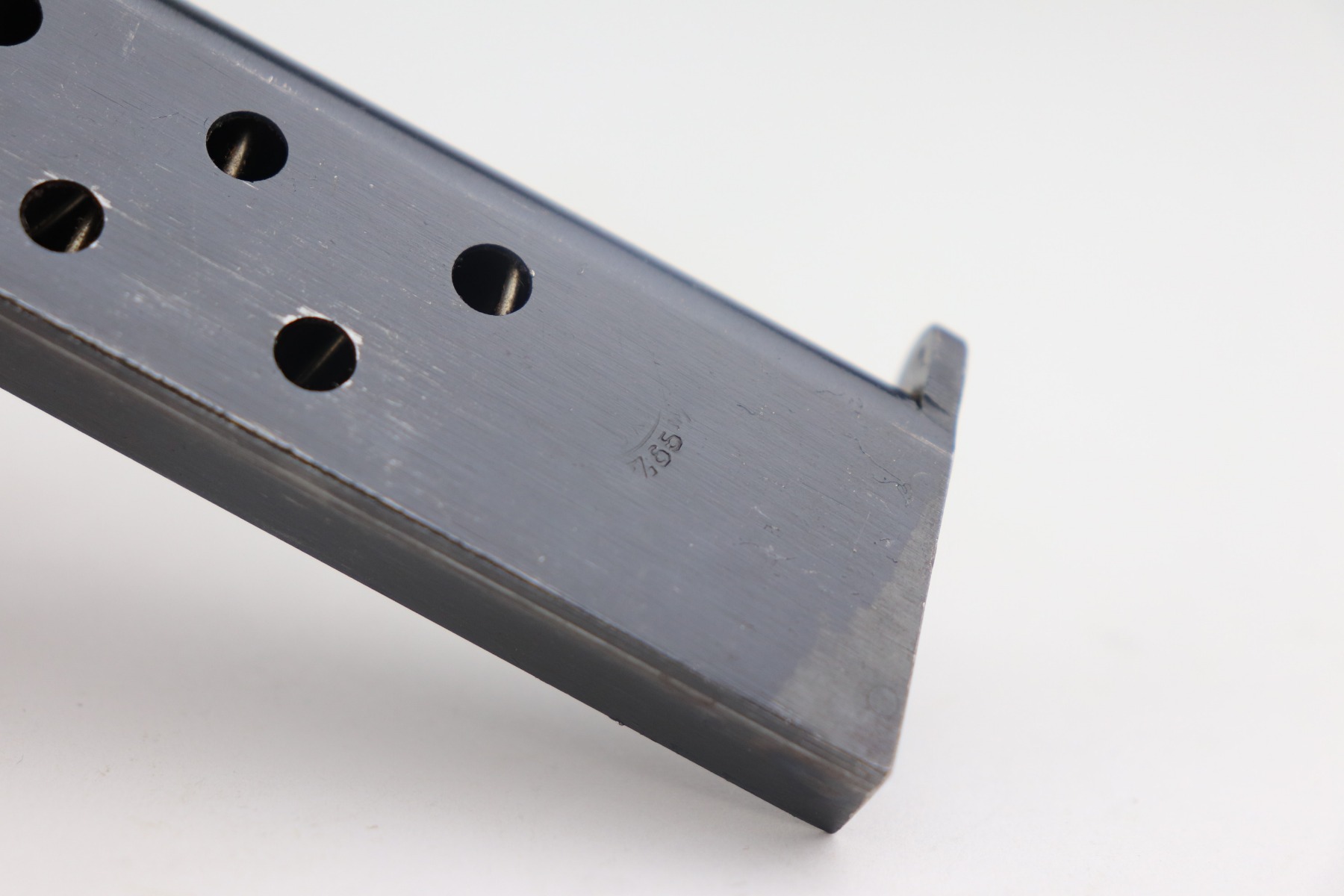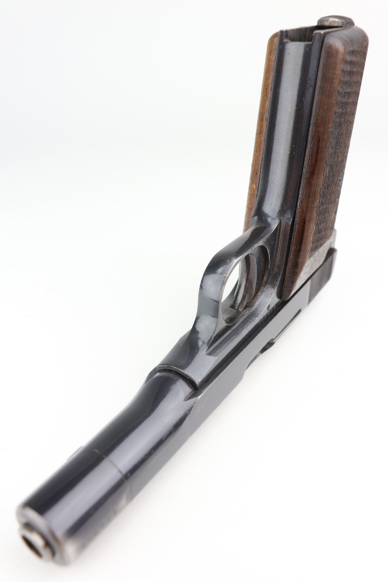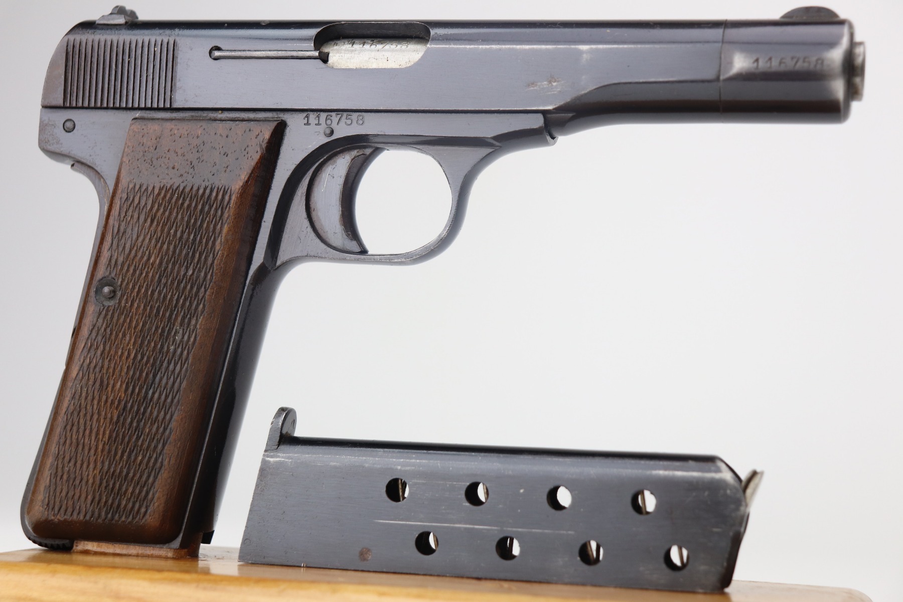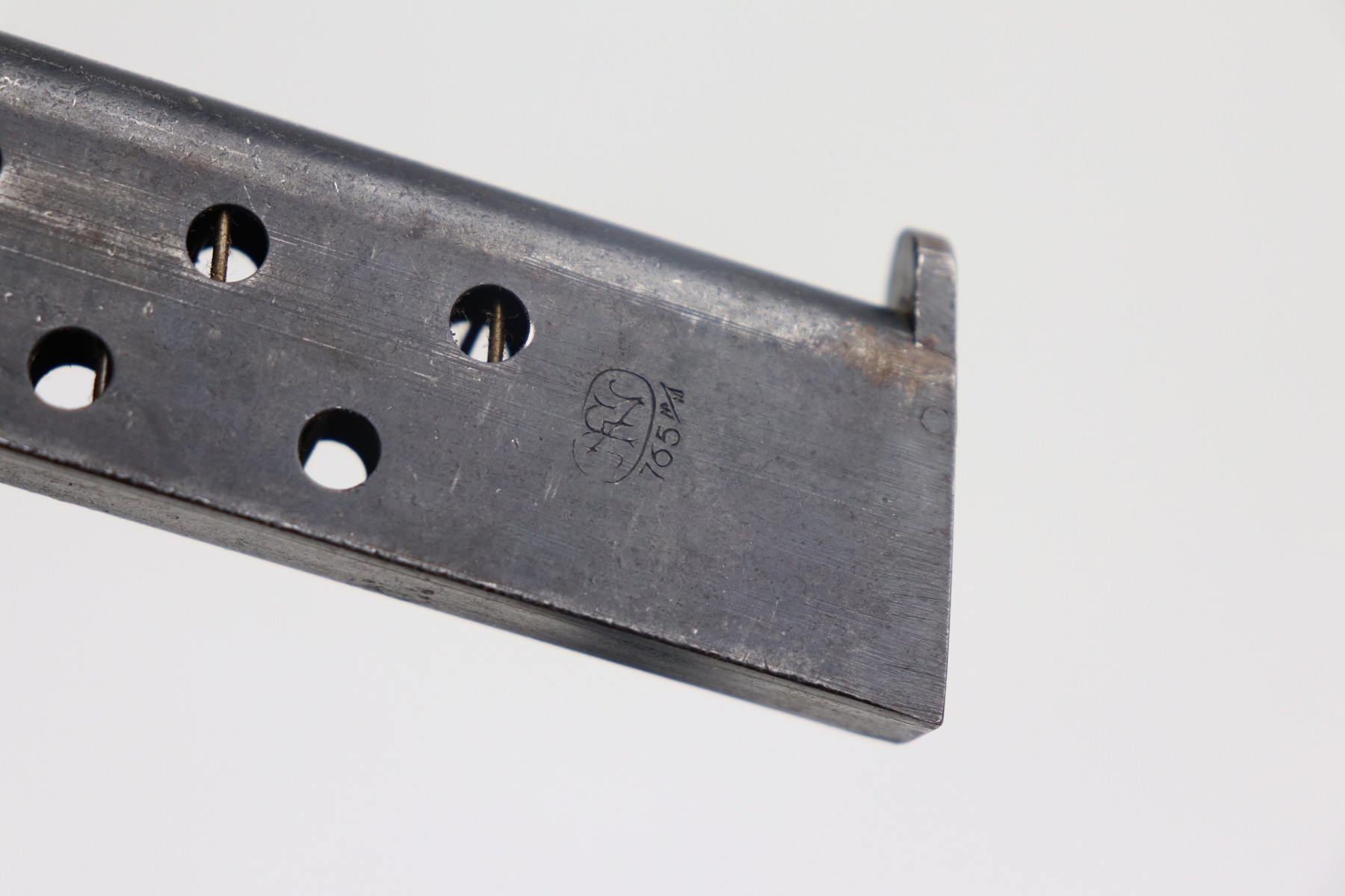 2/15/21 – This is an excellent example of an FN Browning Model 1922 Rig issued to the Nazi military during WW2. This one is all matching and has the proper “Waffen 140” military proofs. There is minor wear around the muzzle and high edges of the slide. Some patina on the straps. The rig comes with an excellent period-correct holster and two period-correct magazines. Excellent grips. The bore is near-mint.