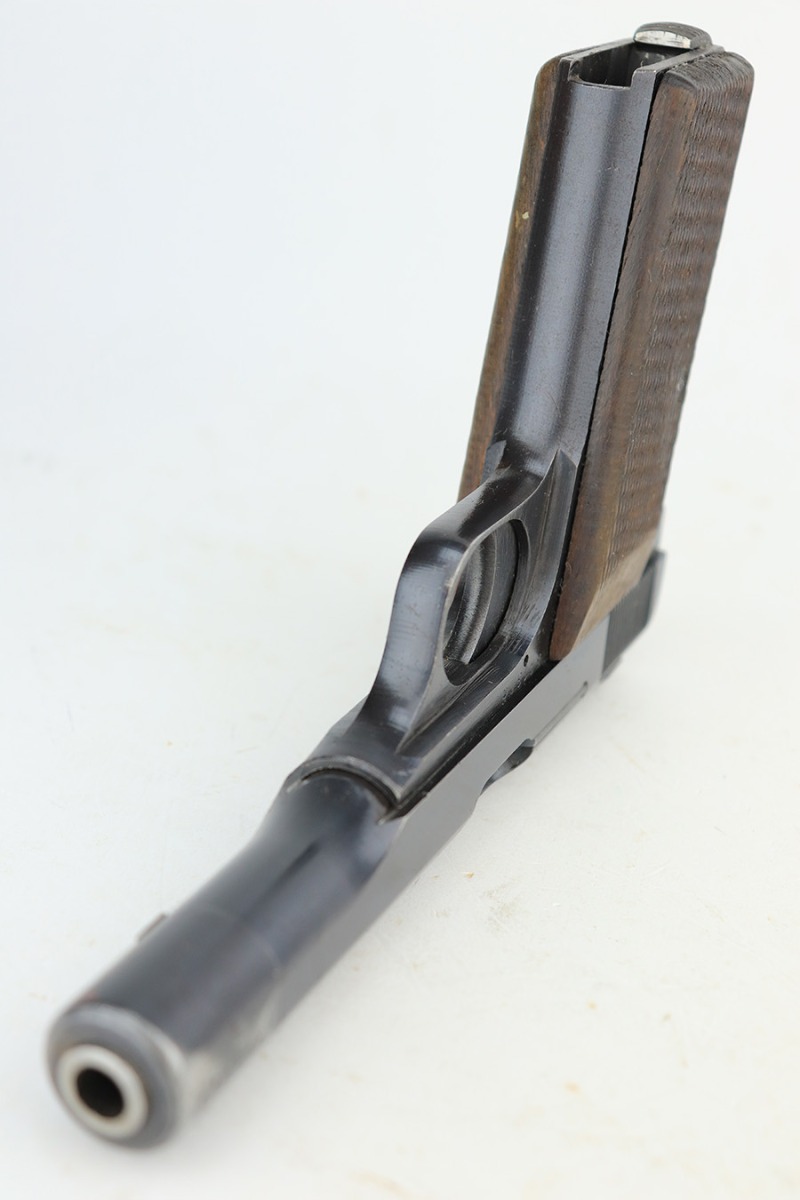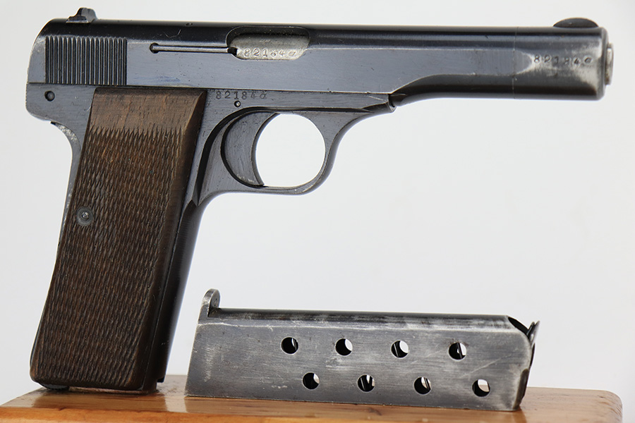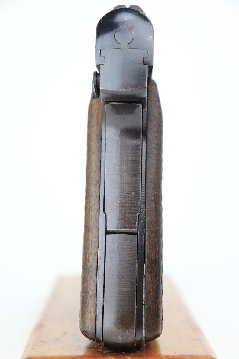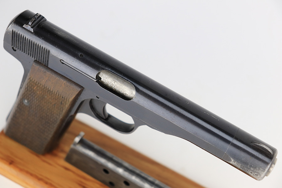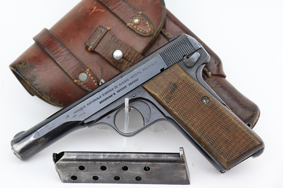 5/5/23 – This is an excellent example of an FN Browning Model 1922 issued to the Nazi military during WW2. It is all matching and has the proper “Waffen 140” military acceptance proofs. It comes as a rig with a nice period-correct holster and one proper magazine. The gun itself has retained about 96% of its original finish with most of the wear being around the muzzle. Fitted with nice period-correct wood grips. Mint bore.