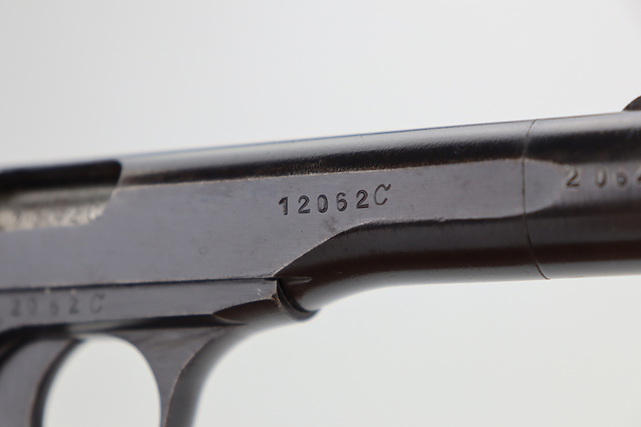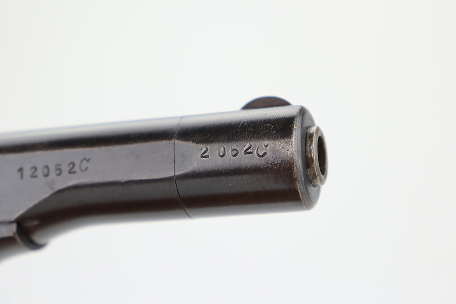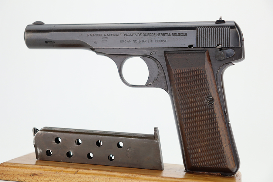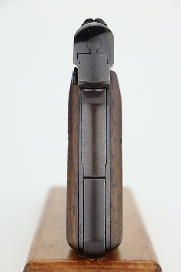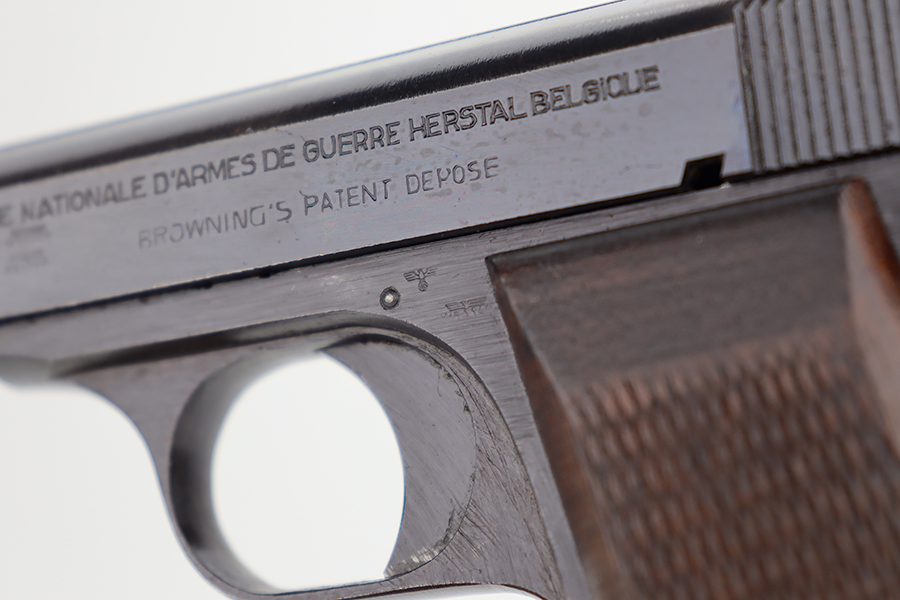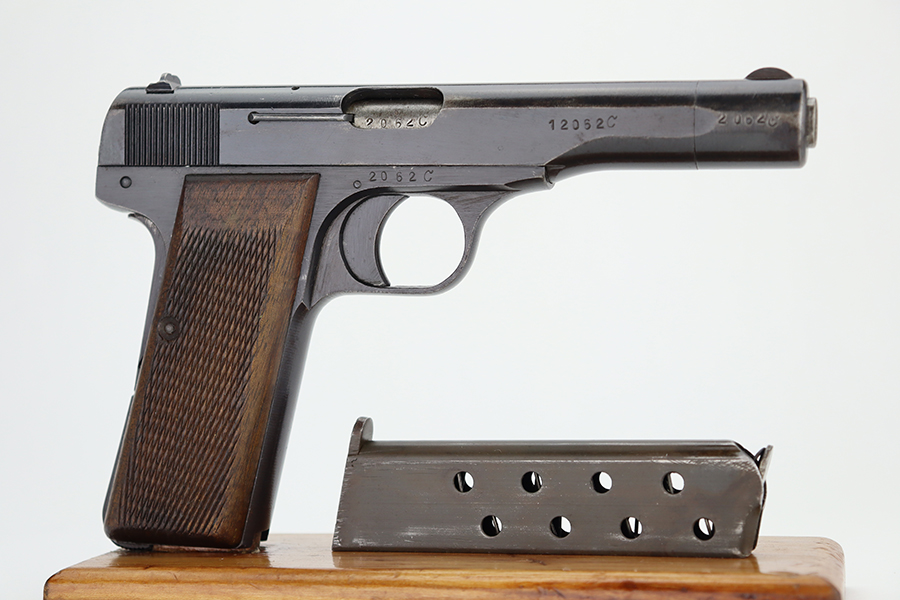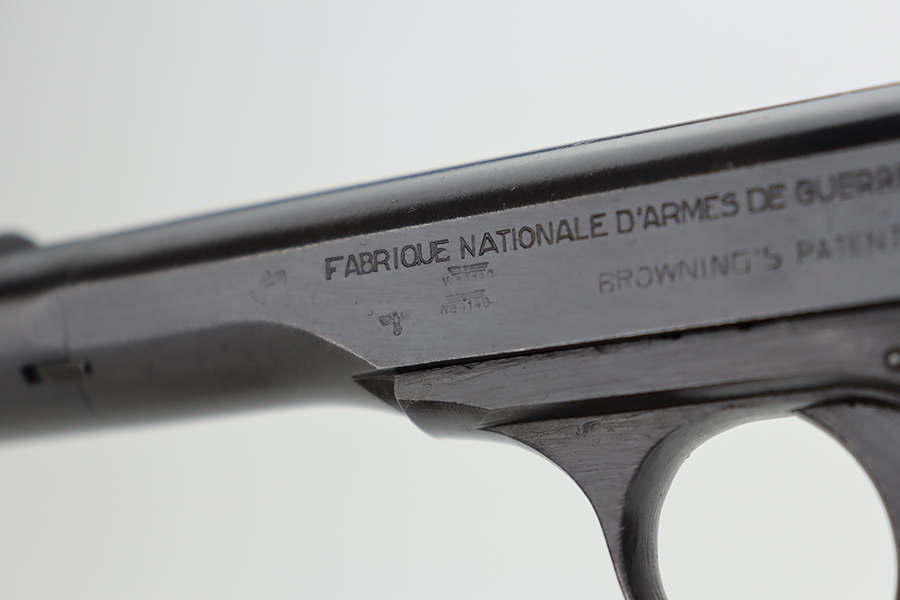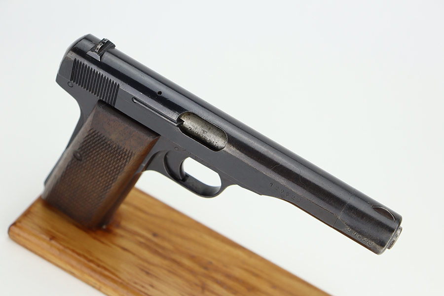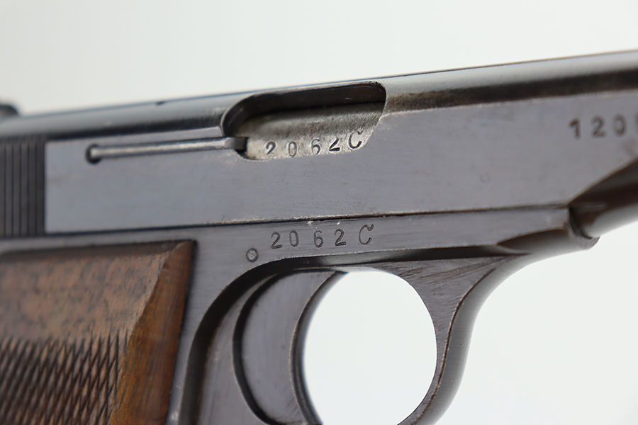 6/11/24 – This is an excellent example of an FN Browning Model 1922 issued to the Nazi military during WW2. All matching with the proper “Waffen 140” military acceptance proofs. It has retained about 97% of its original wartime finish with just very minor muzzle and high edge wear. Fitted with excellent period-correct wood grips and comes with one proper magazine. Minty bore.