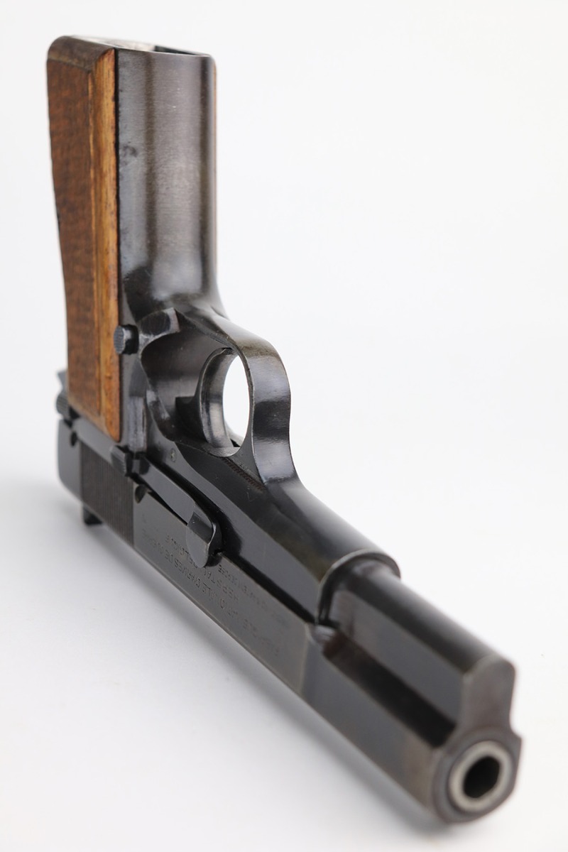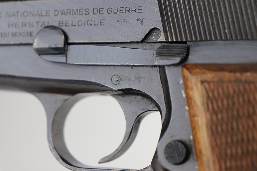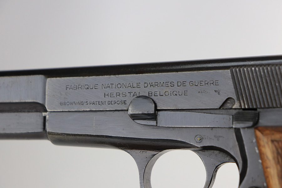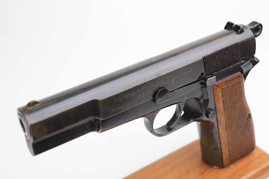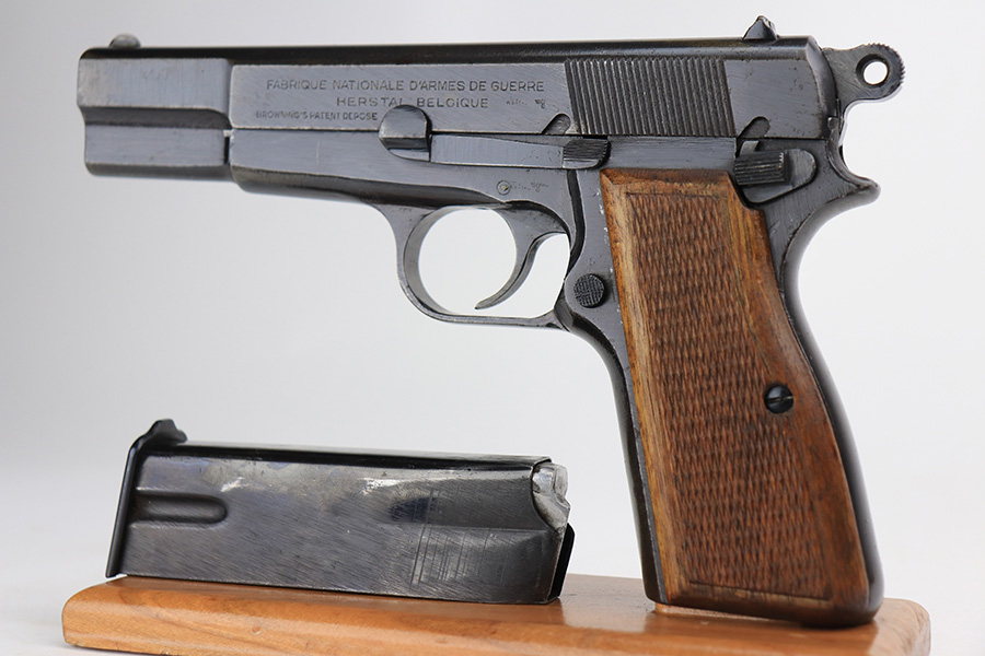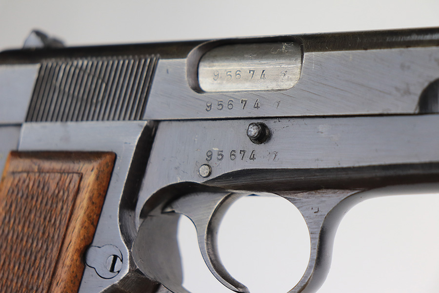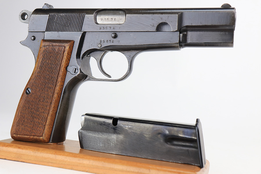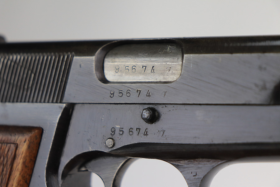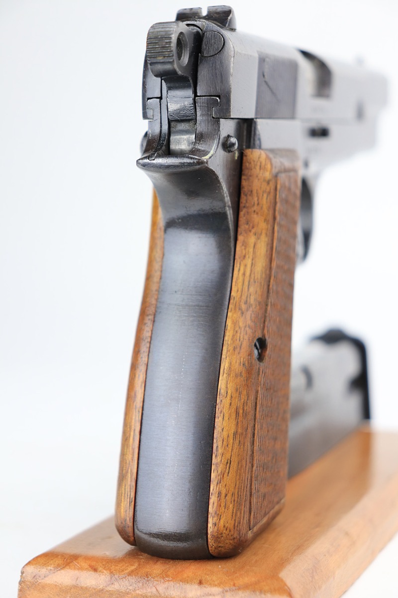 2/18/22 – This is an excellent, original Nazi FN High Power that was made late in the war. All matching and original with WaA140 proofs on slide and frame. Great bluing overall, with minor thinning and patina on the front strap. Also a couple very minor areas of pinpricking. Bore has strong rifling but freckling and frost through the grooves. Excellent wood grips. Period original magazine.
