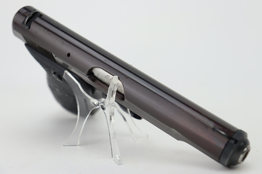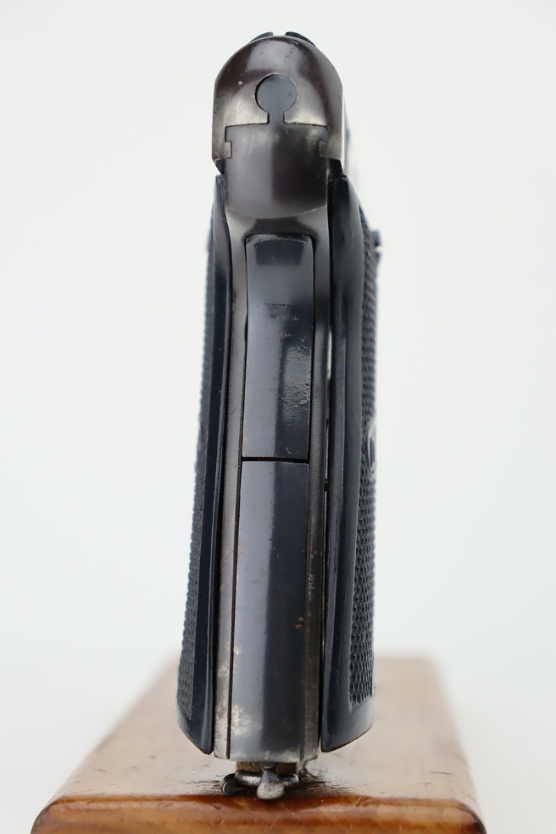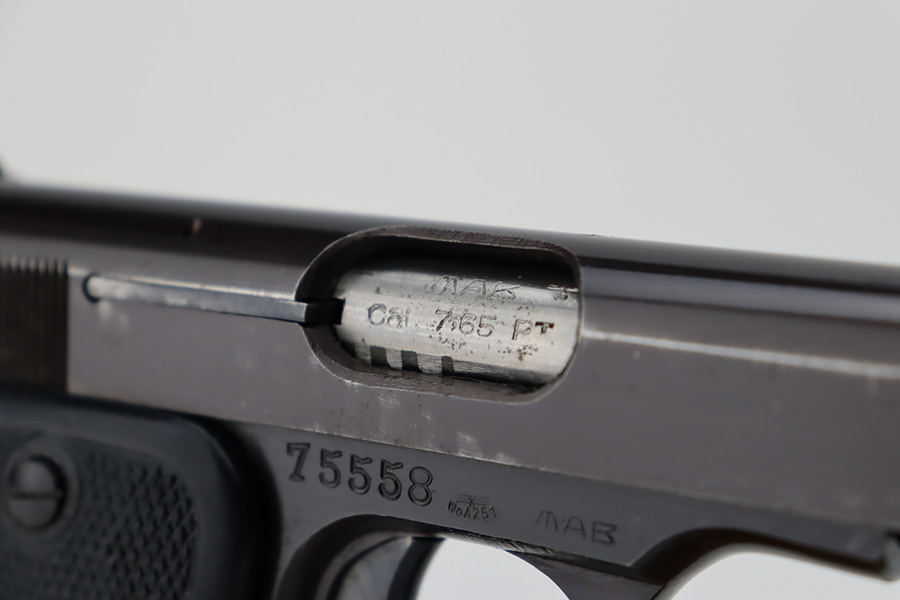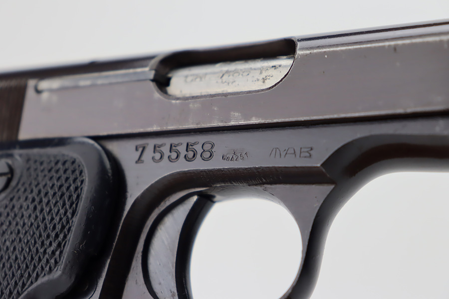 10/12/23 – This is an excellent example of a French MAB Model D issued to the Nazi military during WW2. It is all matching and has the proper “Waffen 251” military acceptance proof on the right side of the frame. It has retained about 96% of its original plum-colored finish. There is just very minor high edge wear and some small areas of minor wear on the slide. Fitted with excellent period-correct black bakelite grips and comes with one proper magazine. Mint bore.