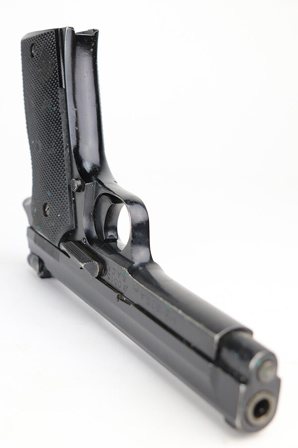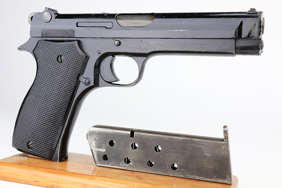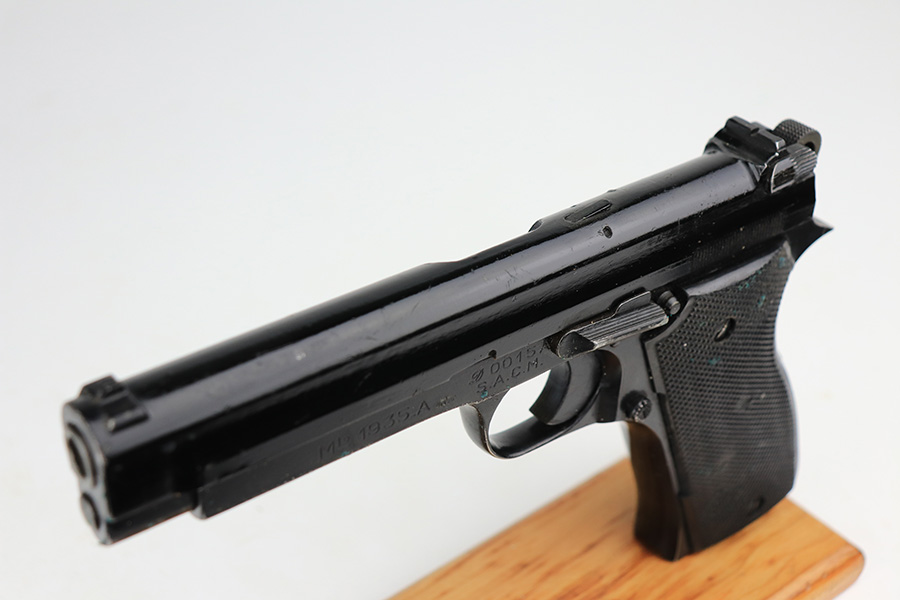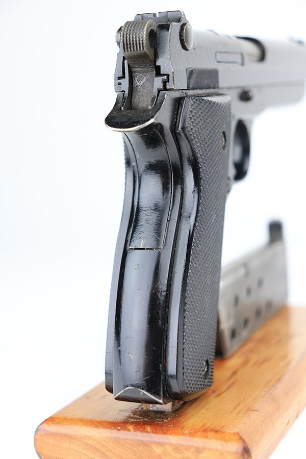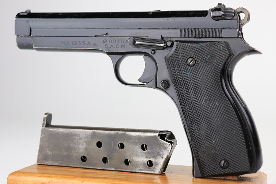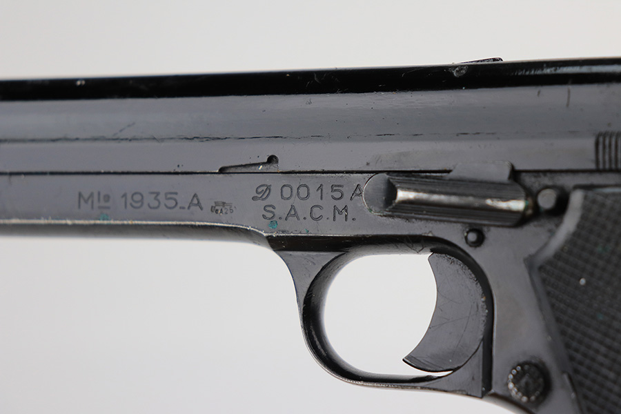 12/13/22 – This is an excellent example of a French SACM 1935-A issued to the Nazi military during WW2. The gun is all matching and has the proper “Waffen 251” Nazi military acceptance proof on the left side of the frame. The gun has retained about 97% of its original black painted finish. There isn’t much actual finish loss, but there are noticeable handling marks/light scratches throughout – most obvious on the slide and grip straps. It comes with nice black bakelite grips – the left grip panel has a couple of areas of wear and one small chip. The bore is mint.