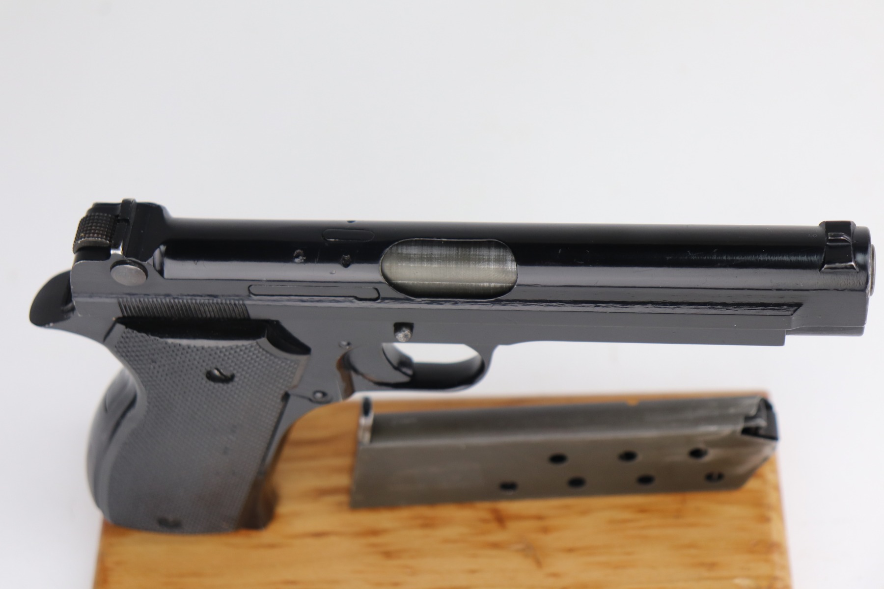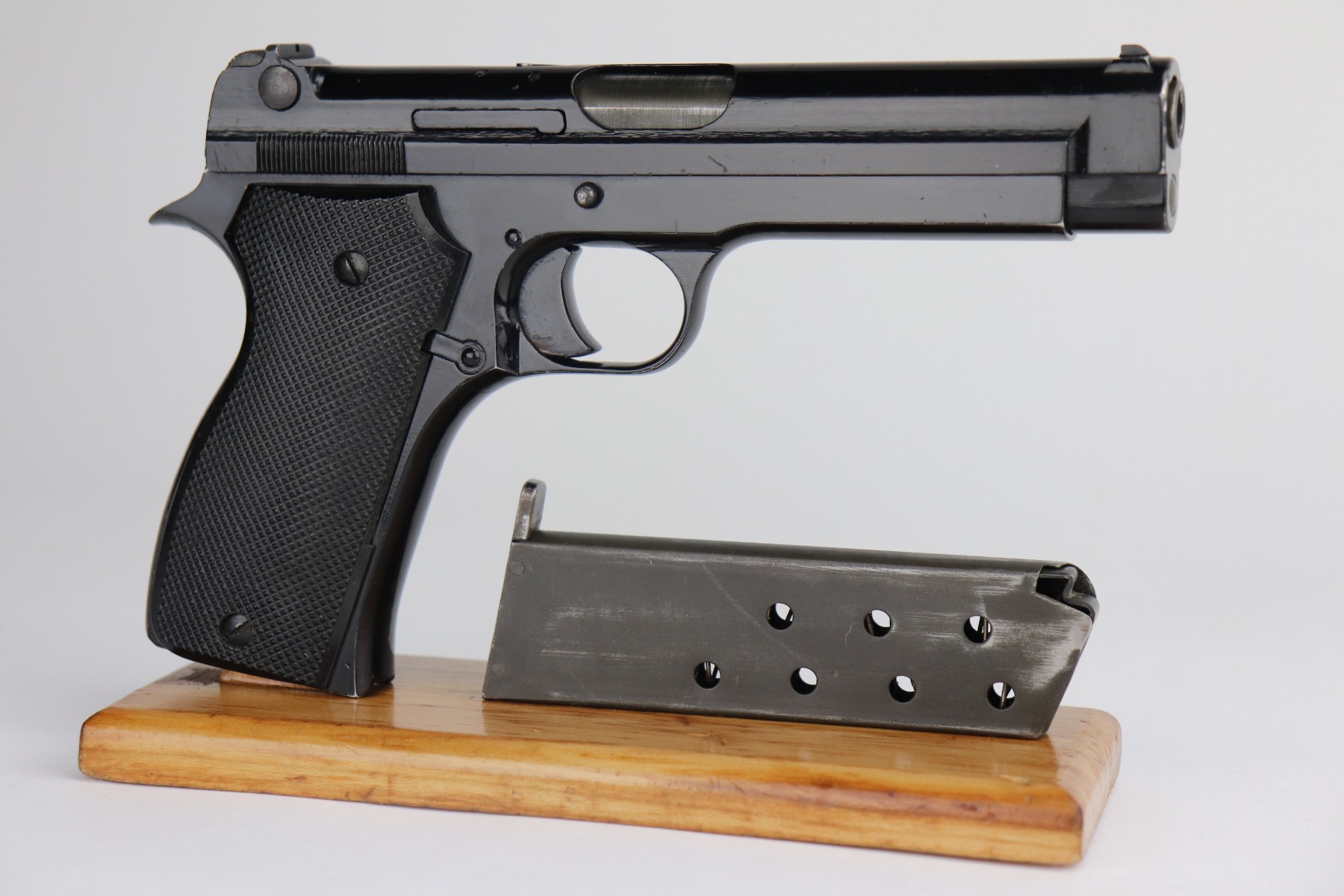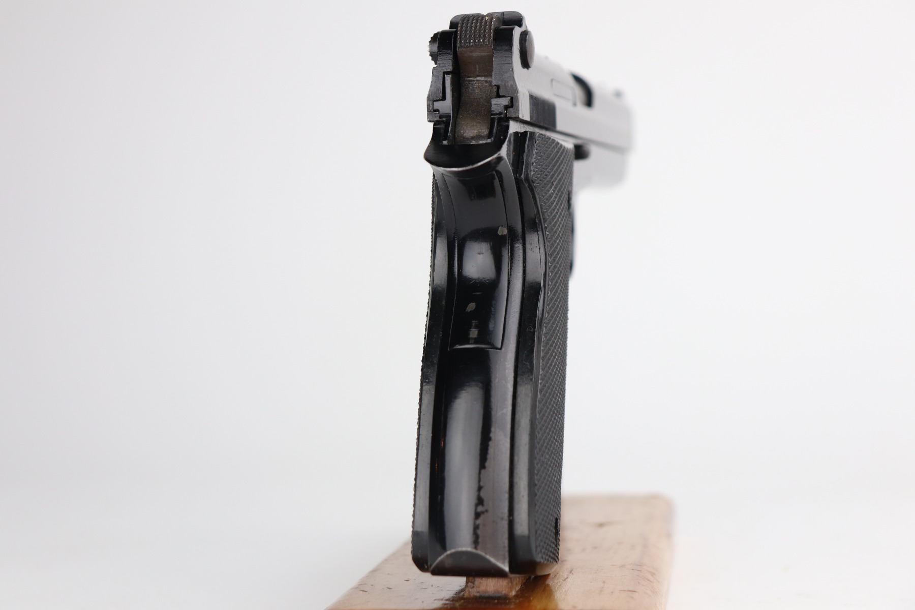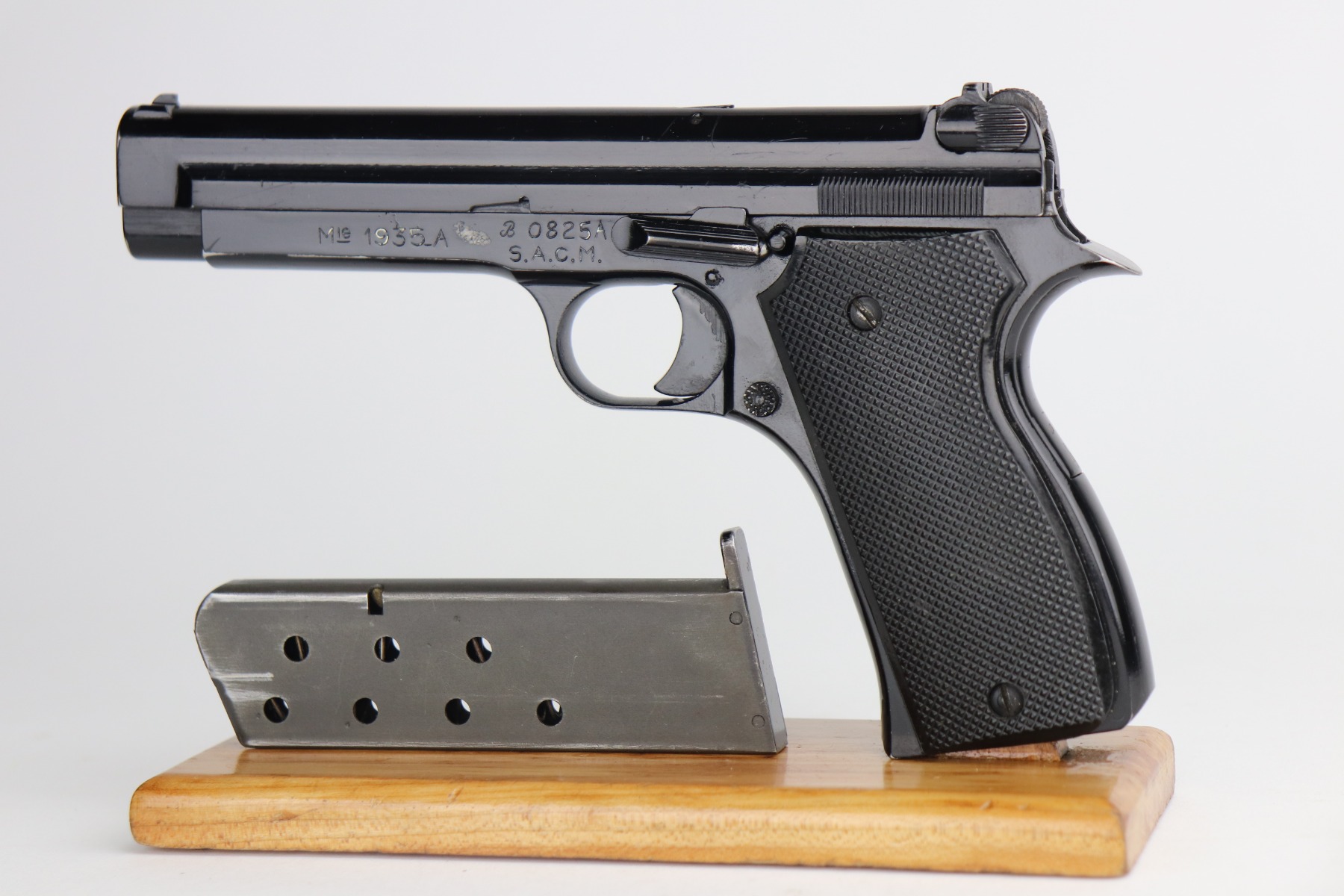 4/29/21 – This is an excellent example of a French SACM Model 1935A issued to the Nazi military during WW2. The gun is all matching and has the proper waffen military proof. The gun has retained about 95-96% of its black enamel paint finish. There are light handling marks here and there and some chipping in the paint on the back strap. Comes with excellent grips and a period-correct magazine. The bore is mint.