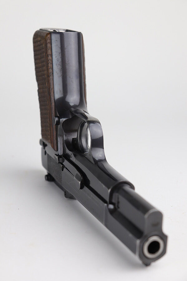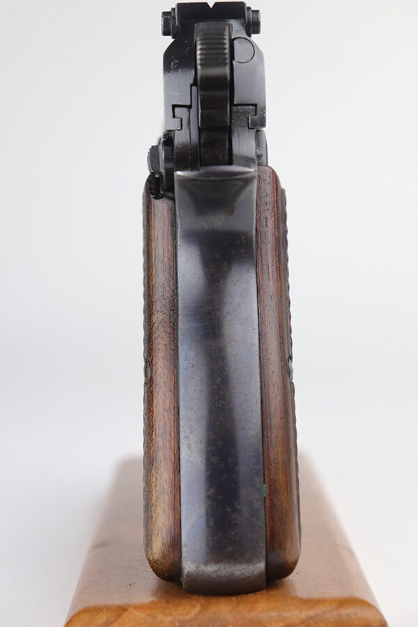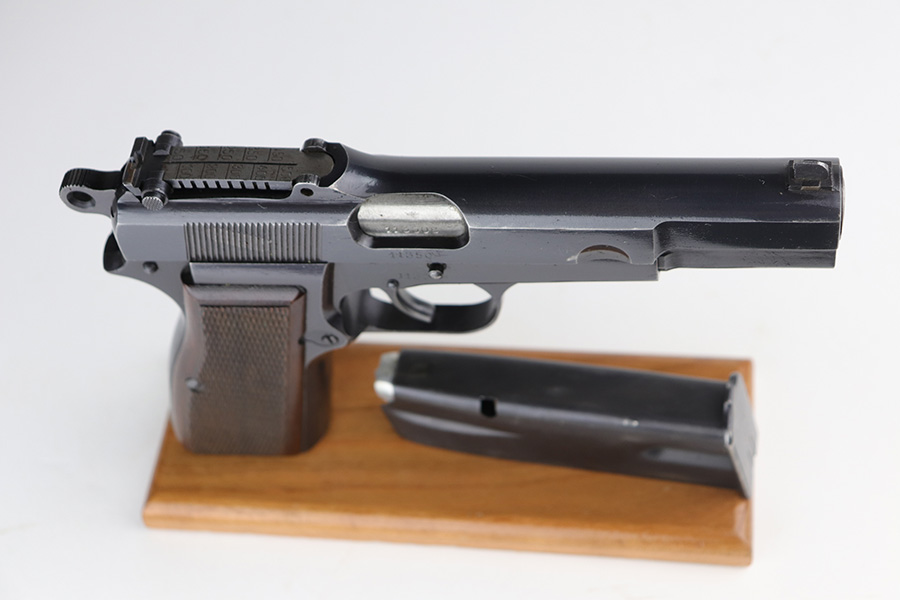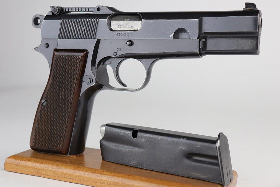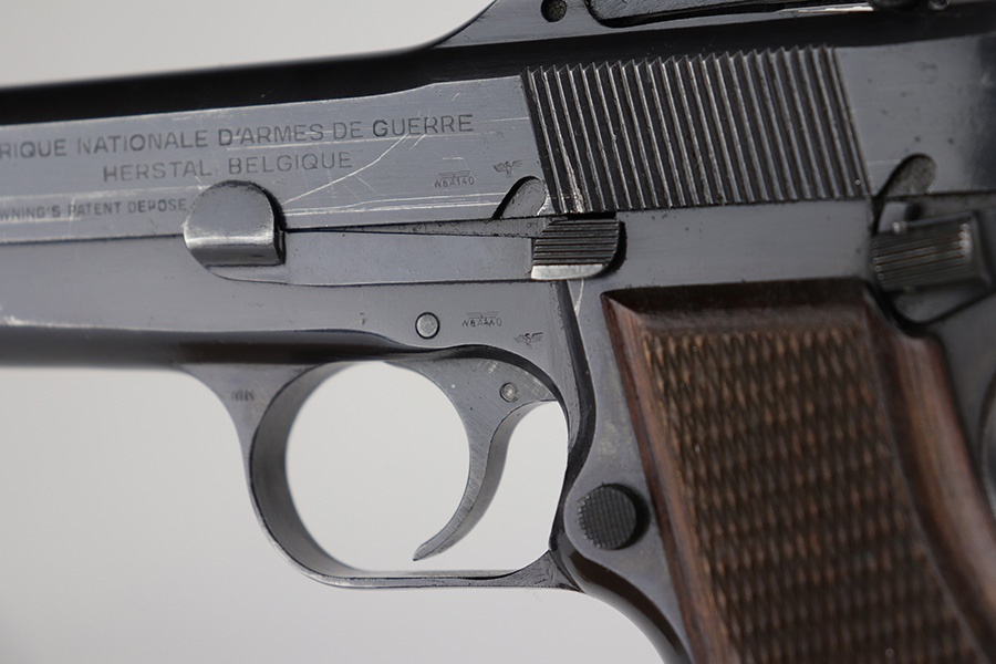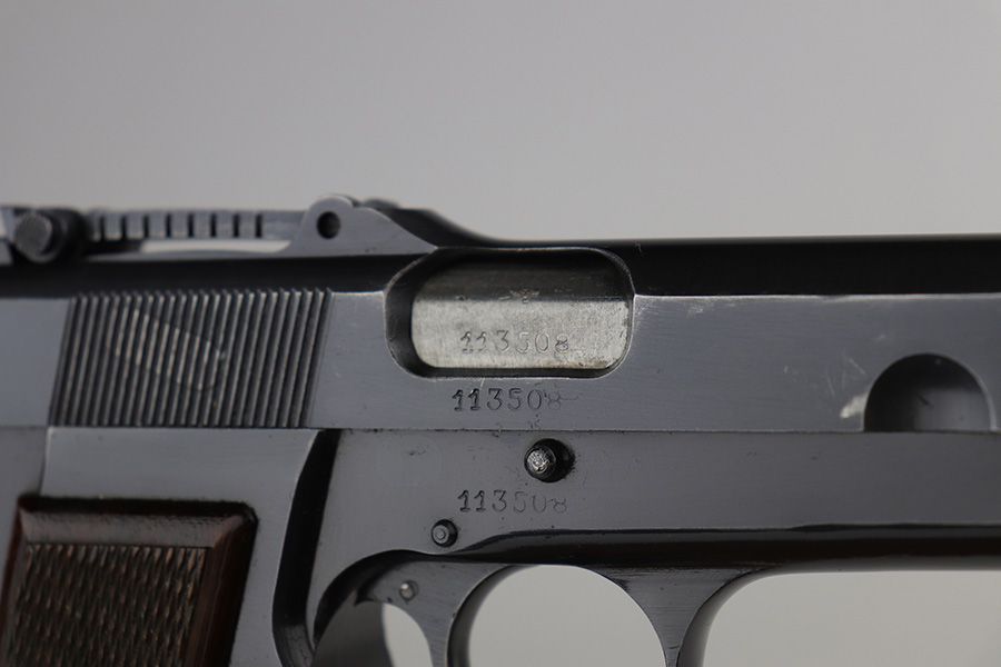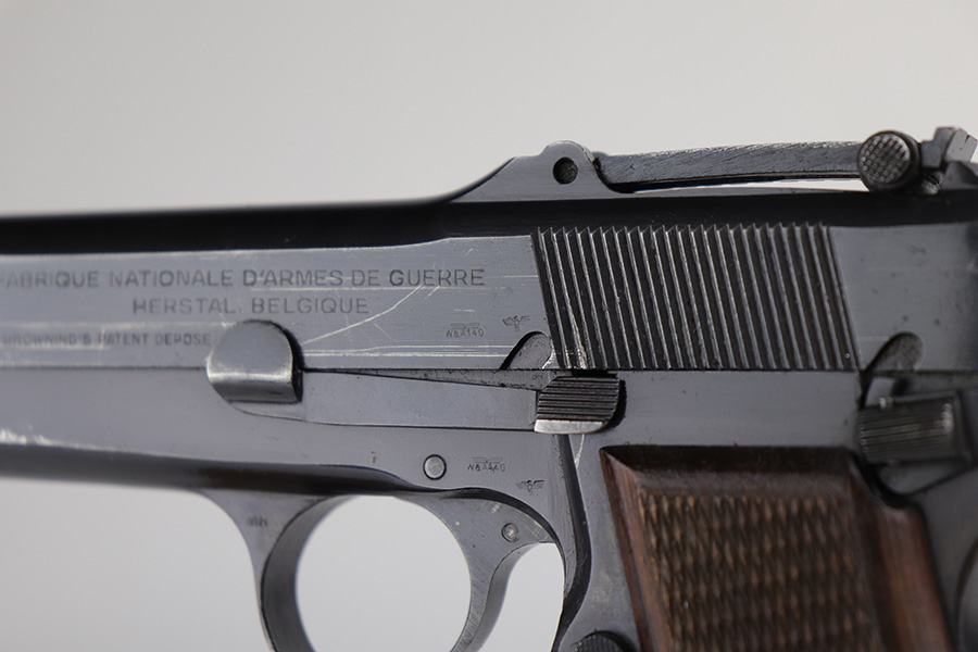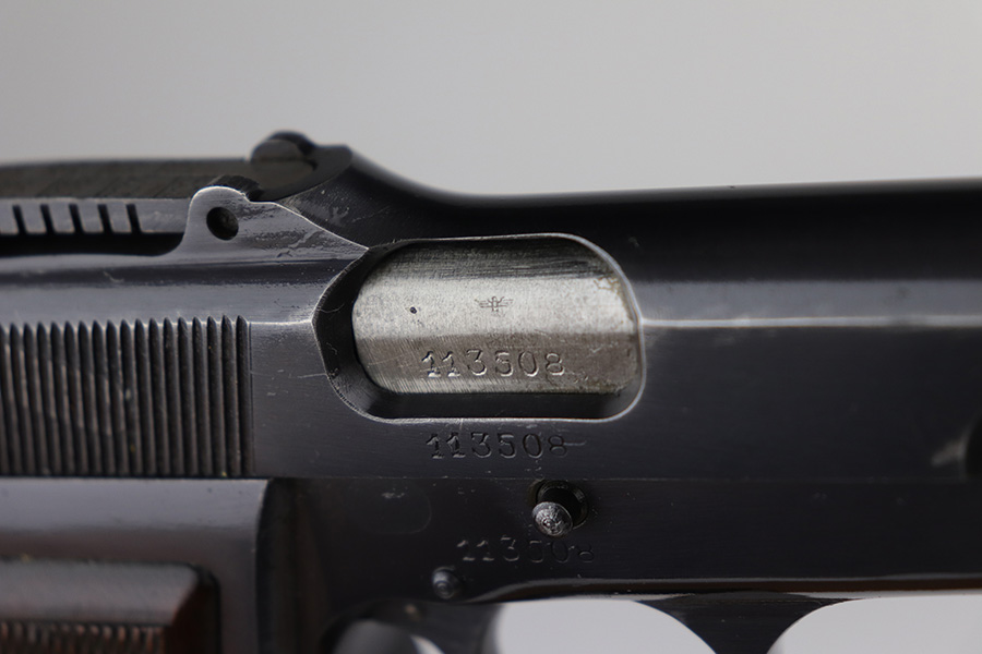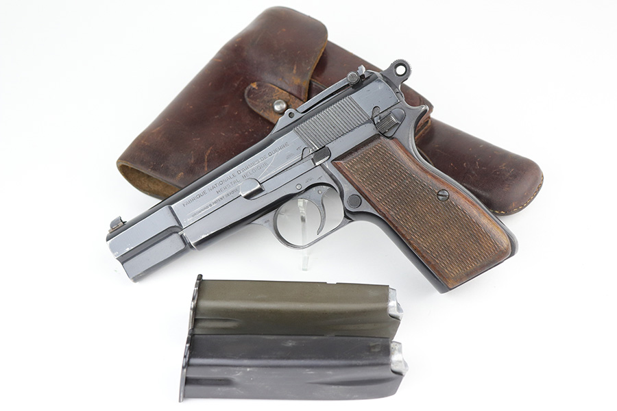 9/1/21 – This is an excellent example of an FN Browning Hi Power issued to the Nazi military during WW2. It is all matching and has the proper “Waffen 140” military proofs throughout. It has an earlier adjustable tangent rear sight. The rig comes with a nice 1942-dated waffen-proofed brown leather holster, one scarce “Waffen 103” proofed magazine, and one un-marked phosphate magazine. Excellent wood grips. The gun has retained about 95% of its original finish. There is very minor wear around the high edges of the slide and around the muzzle. A few spots of wear on both sides of the slide. Some light scratches on the left from the take-down lever. Spotty freckling on the straps. Stone-mint bore.
