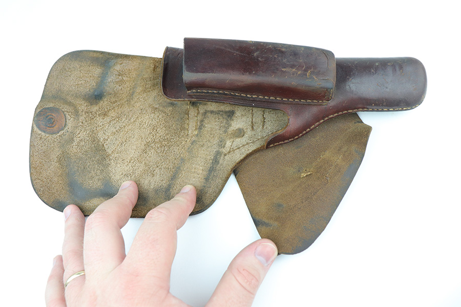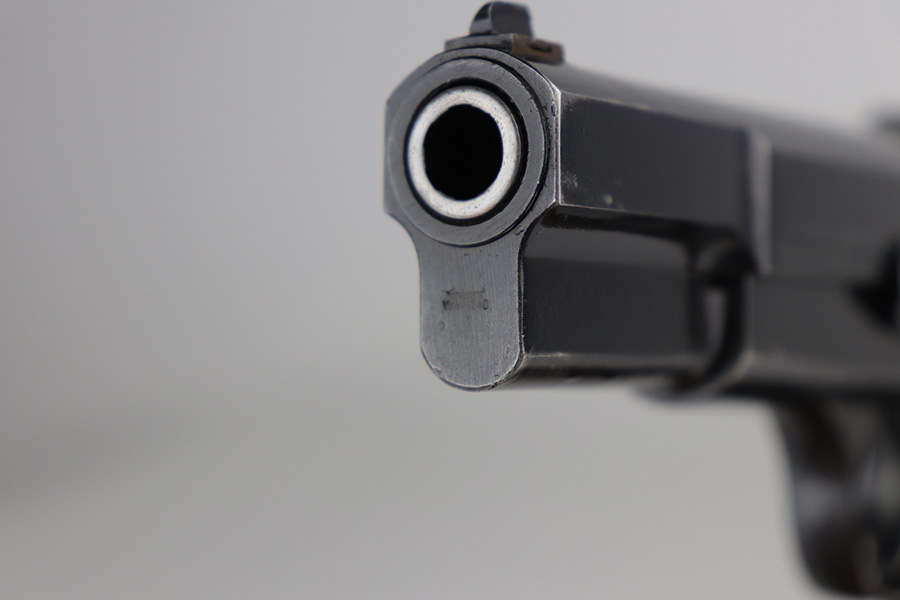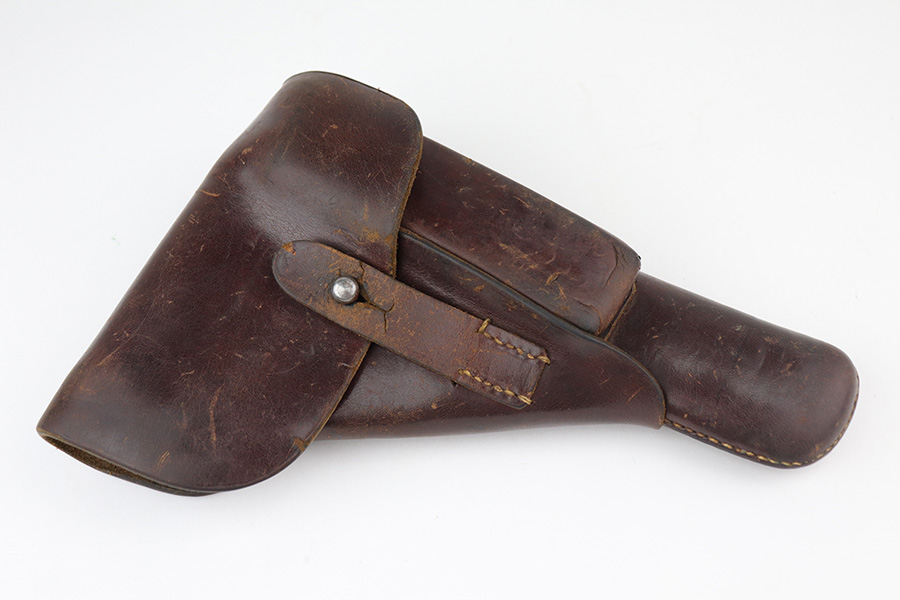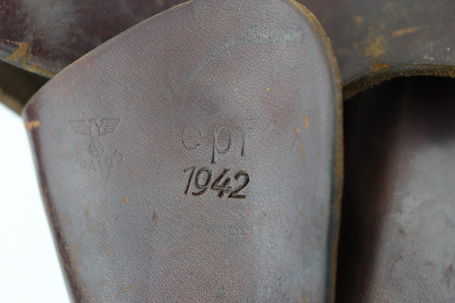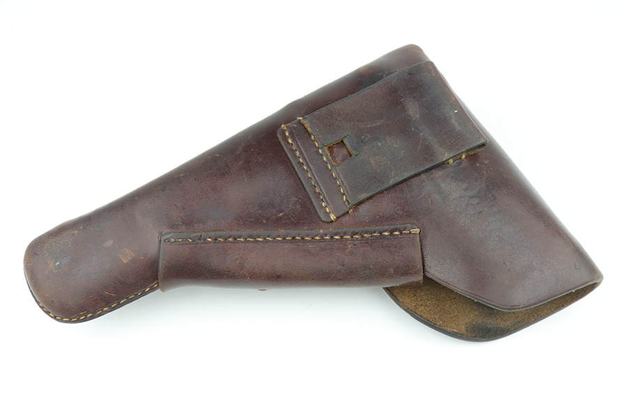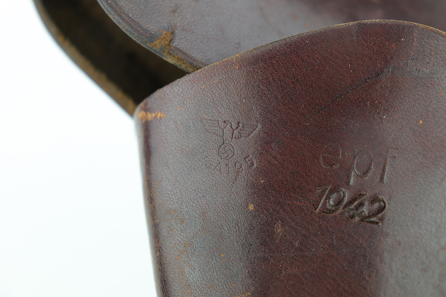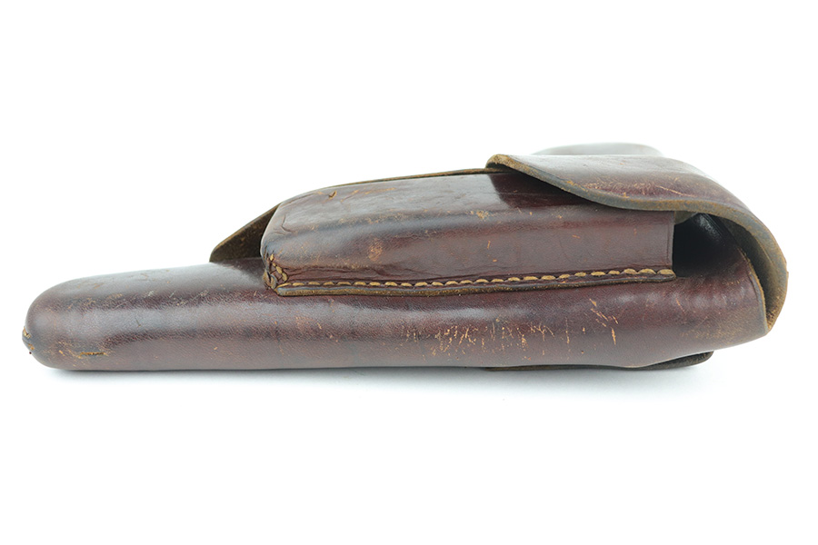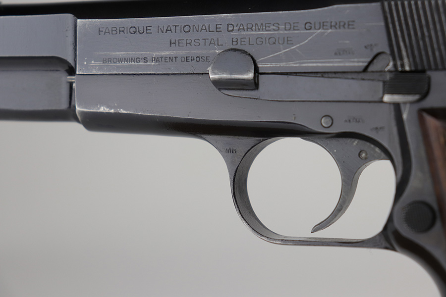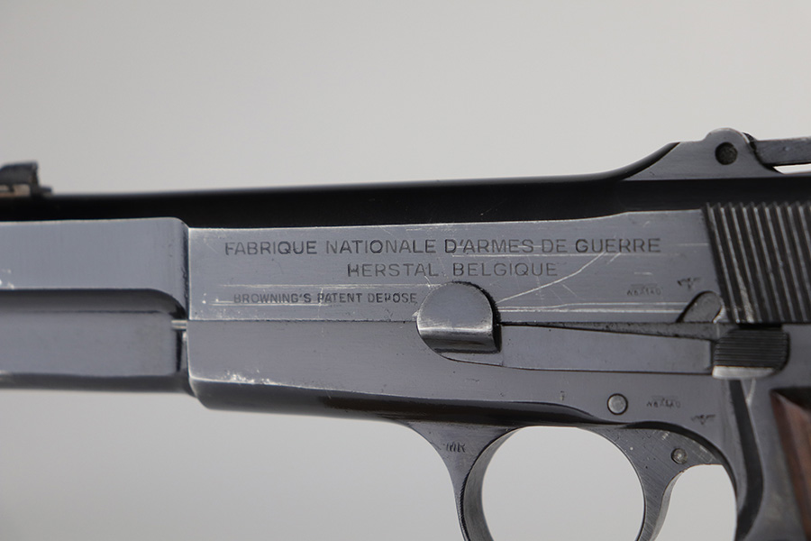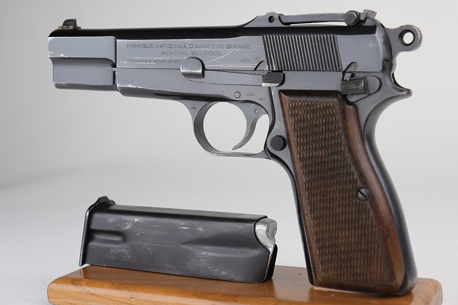 9/1/21 – This is an excellent example of an FN Browning Hi Power issued to the Nazi military during WW2. It is all matching and has the proper “Waffen 140” military proofs throughout. It has an earlier adjustable tangent rear sight. The rig comes with a nice 1942-dated waffen-proofed brown leather holster, one scarce “Waffen 103” proofed magazine, and one un-marked phosphate magazine. Excellent wood grips. The gun has retained about 95% of its original finish. There is very minor wear around the high edges of the slide and around the muzzle. A few spots of wear on both sides of the slide. Some light scratches on the left from the take-down lever. Spotty freckling on the straps. Stone-mint bore.