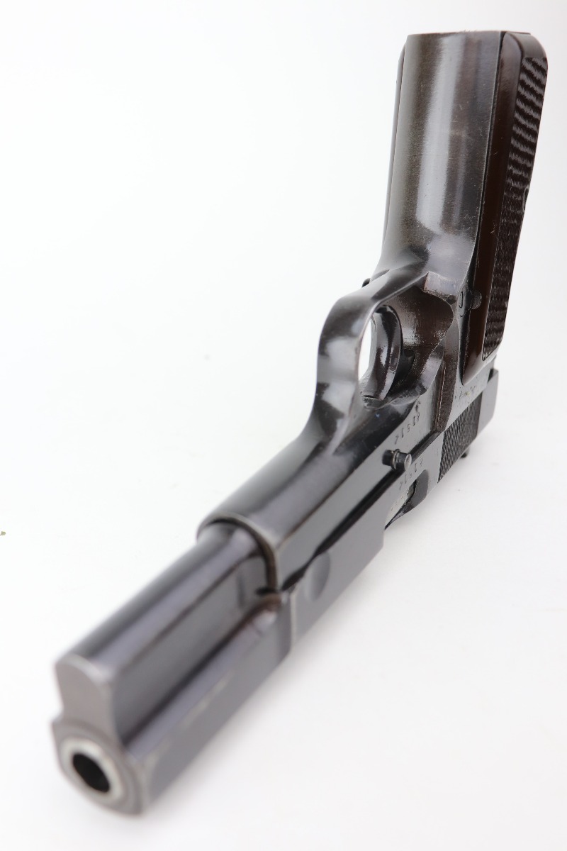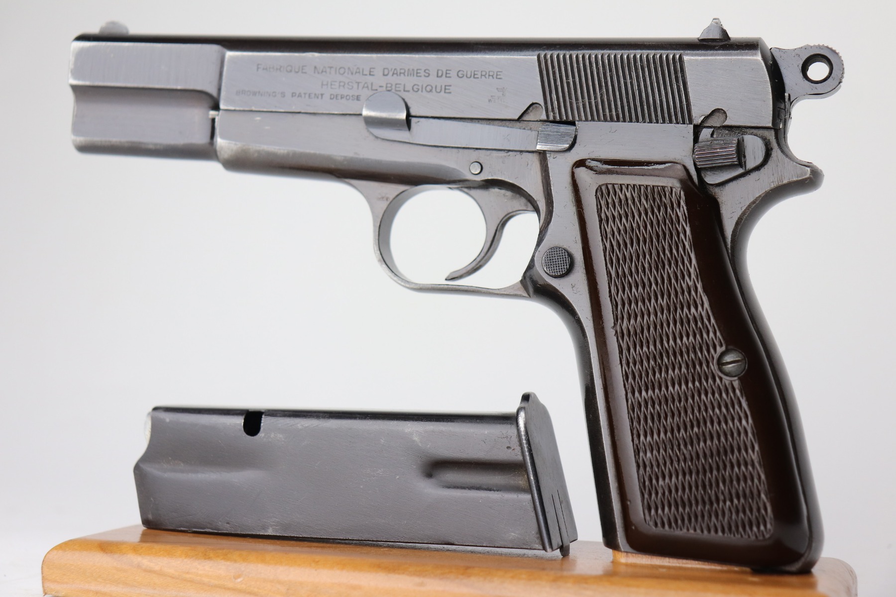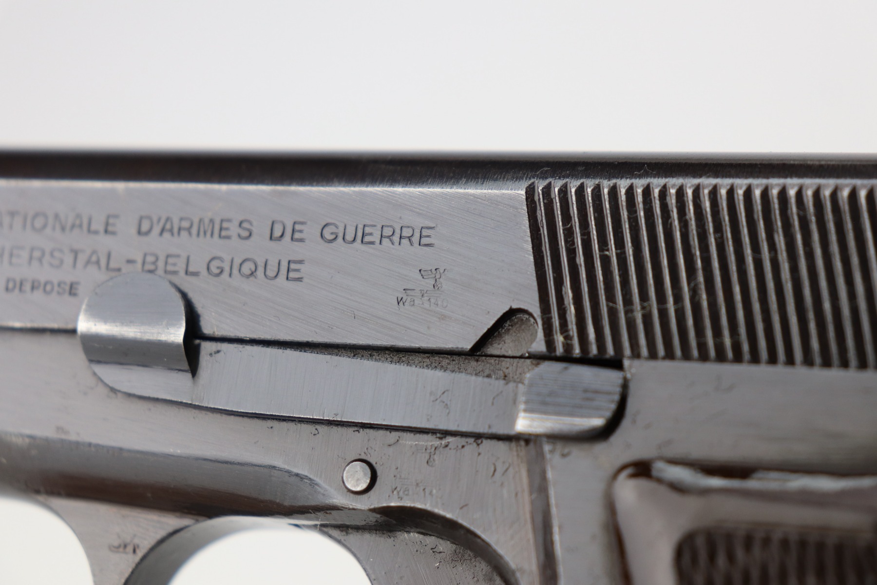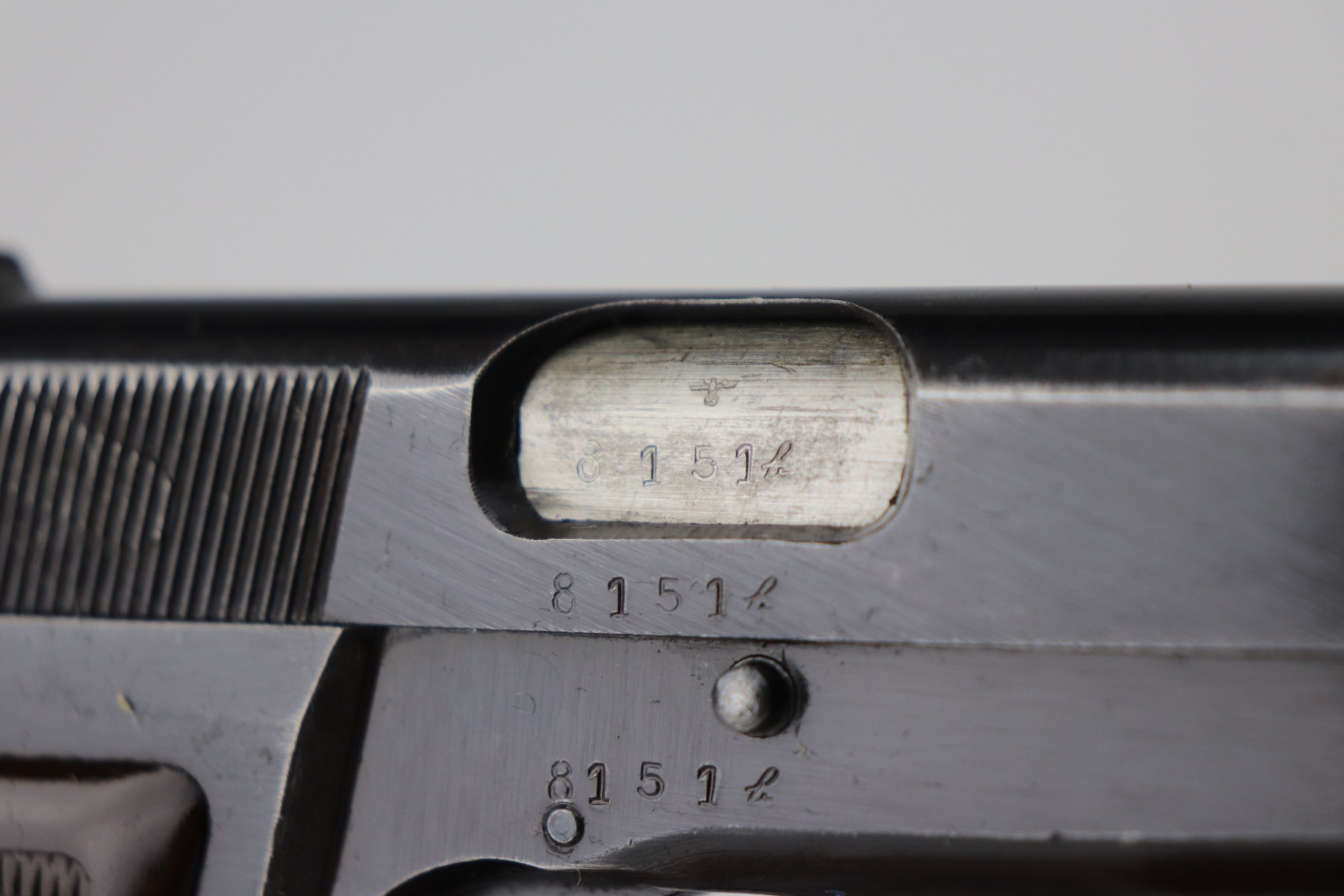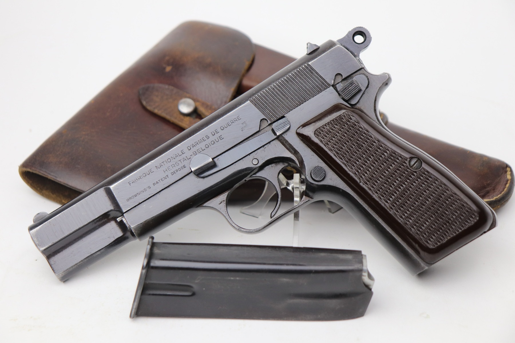 3/17/21 – This is an excellent example of an FN Browning High Power rig issued to the Nazi military during WW2. The gun is all matching and has the proper “Waffen 140” military proofs. The rig comes with an excellent 1943-dated holster and a period-correct magazine. The gun has retained about 96% of its original finish. There is just a hint of thinning on the straps and very minor wear around the muzzle and high edges of the slide. It has excellent bakelite grips. Excellent bore – shiny with strong rifling and very minor freckling in the grooves.