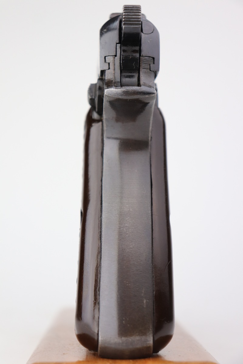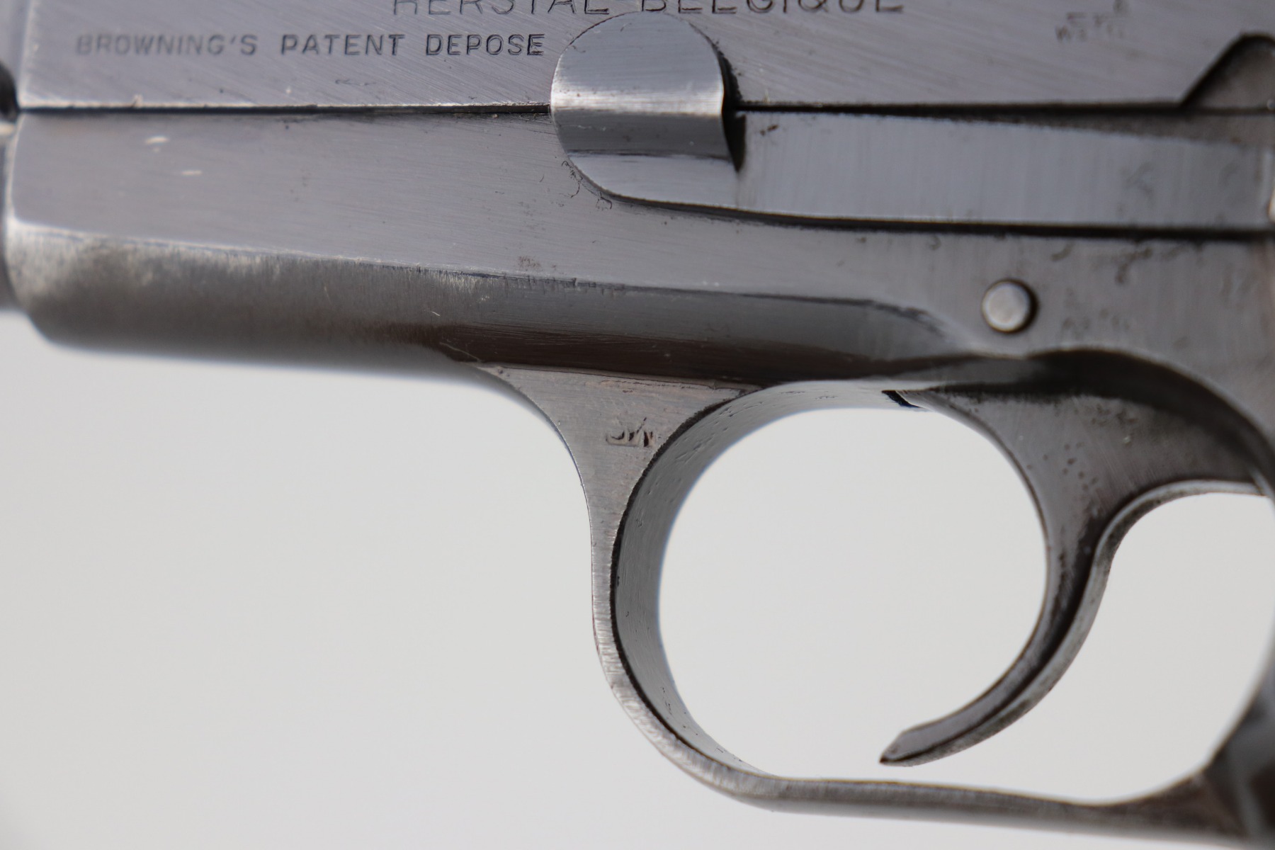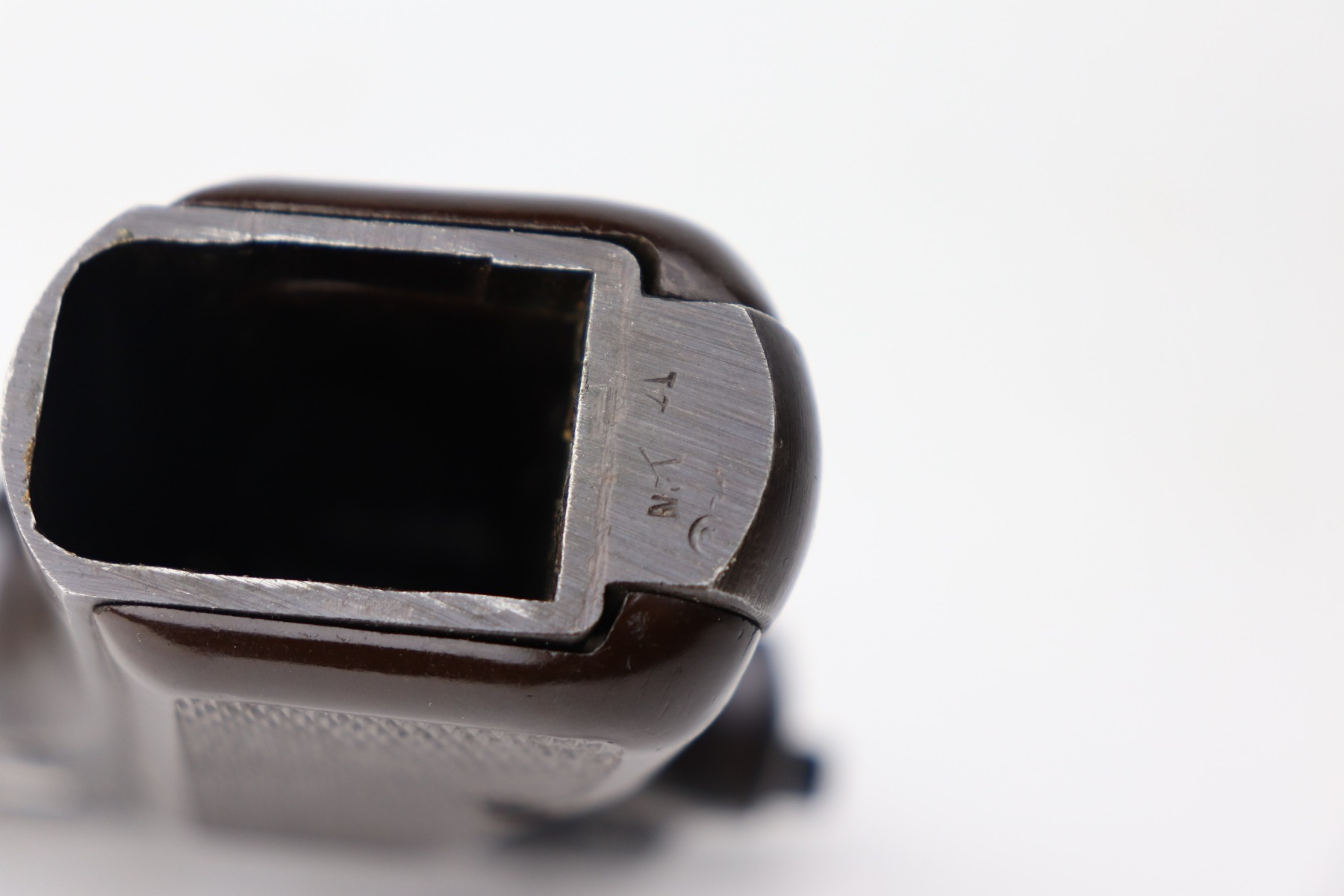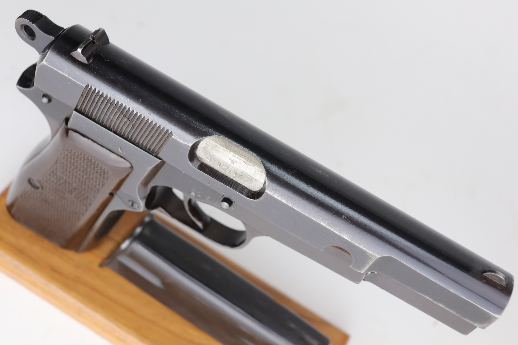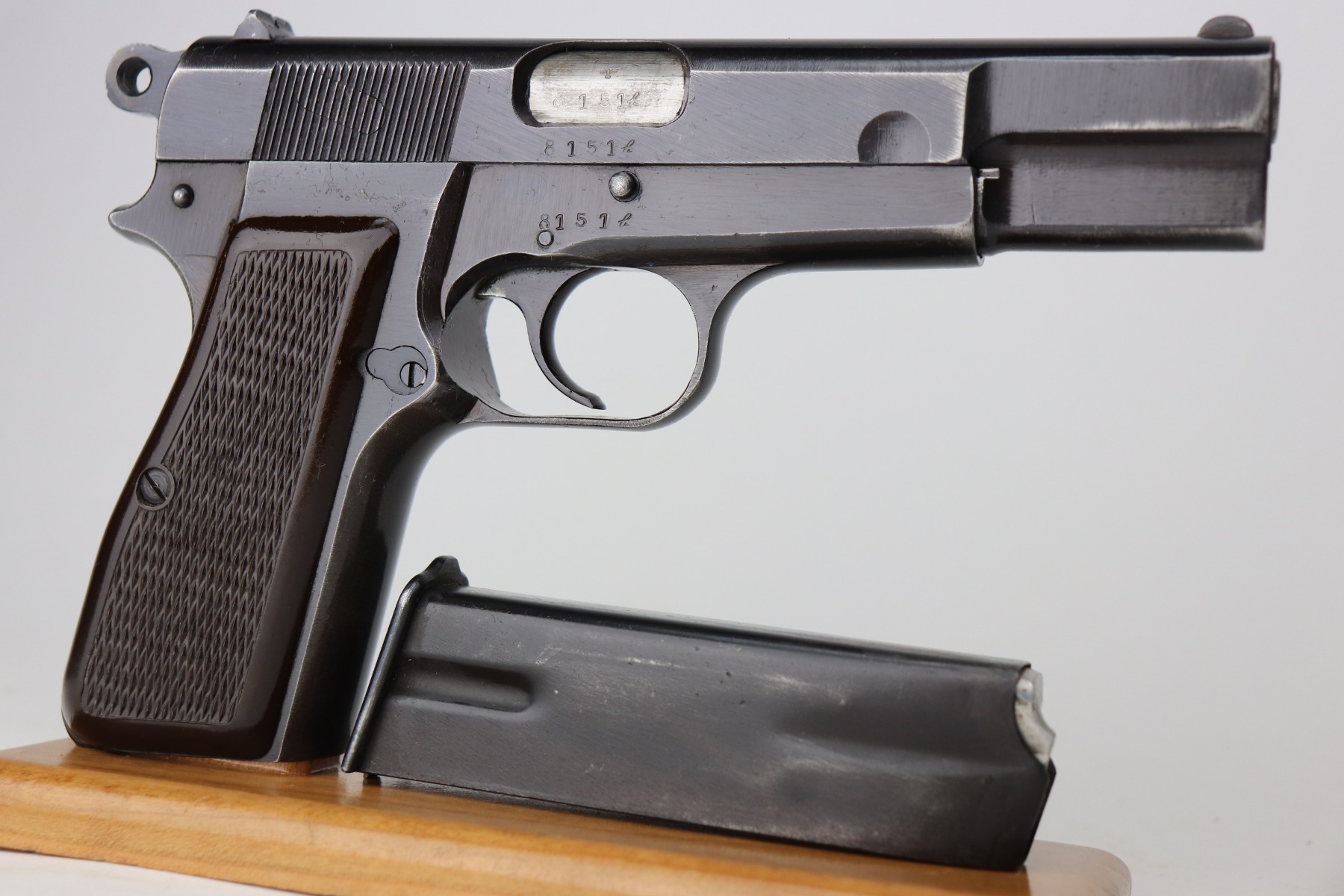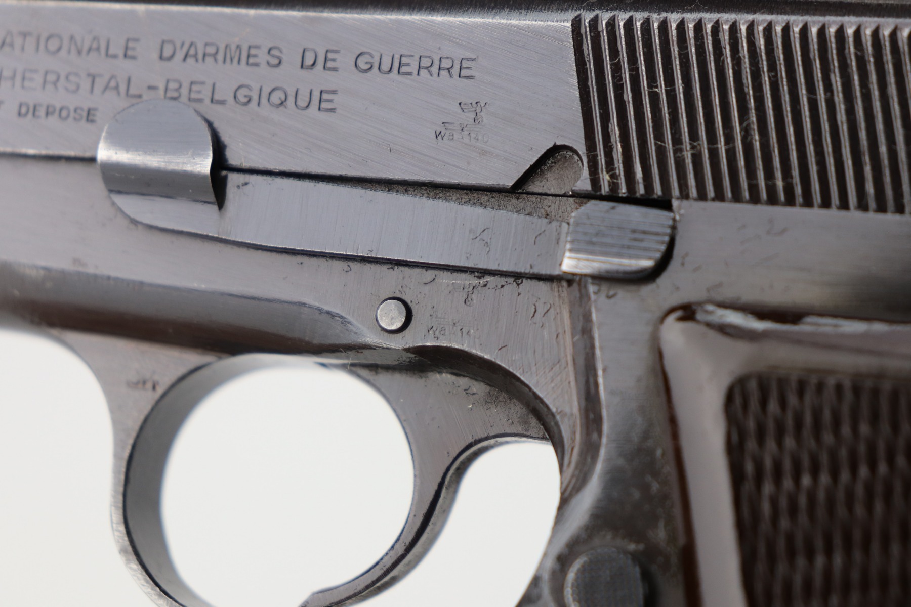 3/17/21 – This is an excellent example of an FN Browning High Power rig issued to the Nazi military during WW2. The gun is all matching and has the proper “Waffen 140” military proofs. The rig comes with an excellent 1943-dated holster and a period-correct magazine. The gun has retained about 96% of its original finish. There is just a hint of thinning on the straps and very minor wear around the muzzle and high edges of the slide. It has excellent bakelite grips. Excellent bore – shiny with strong rifling and very minor freckling in the grooves.