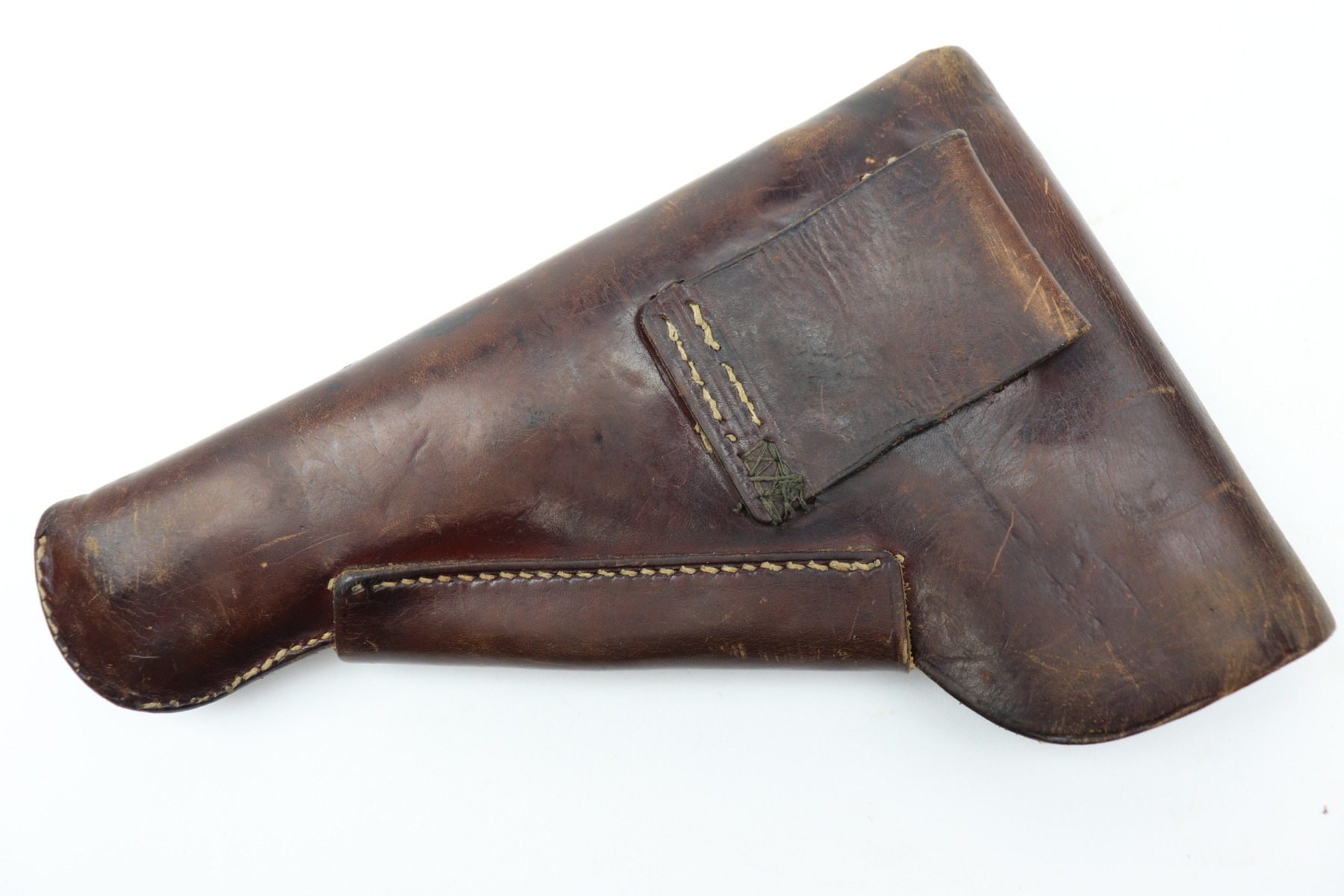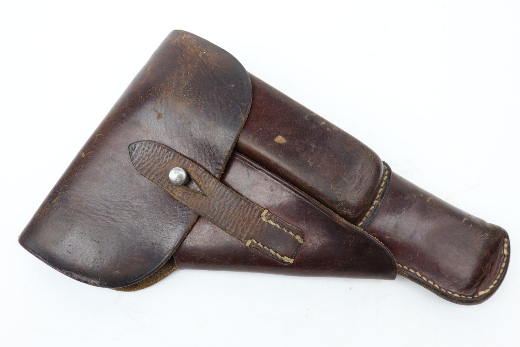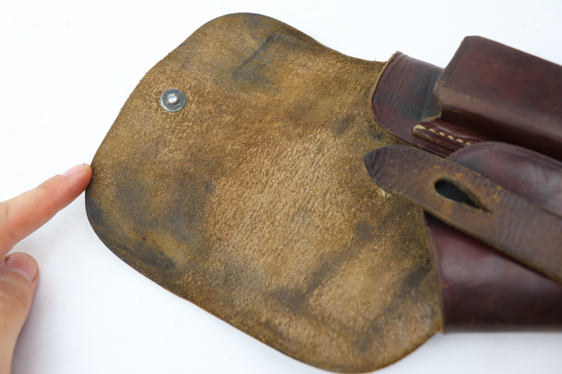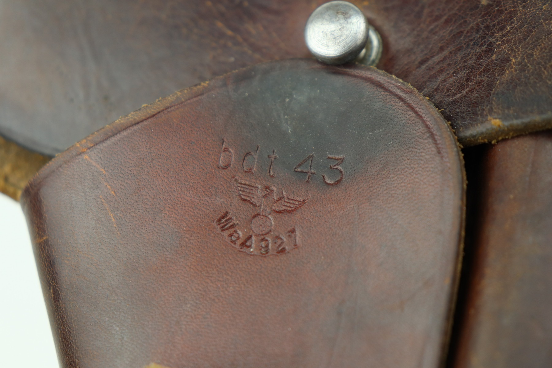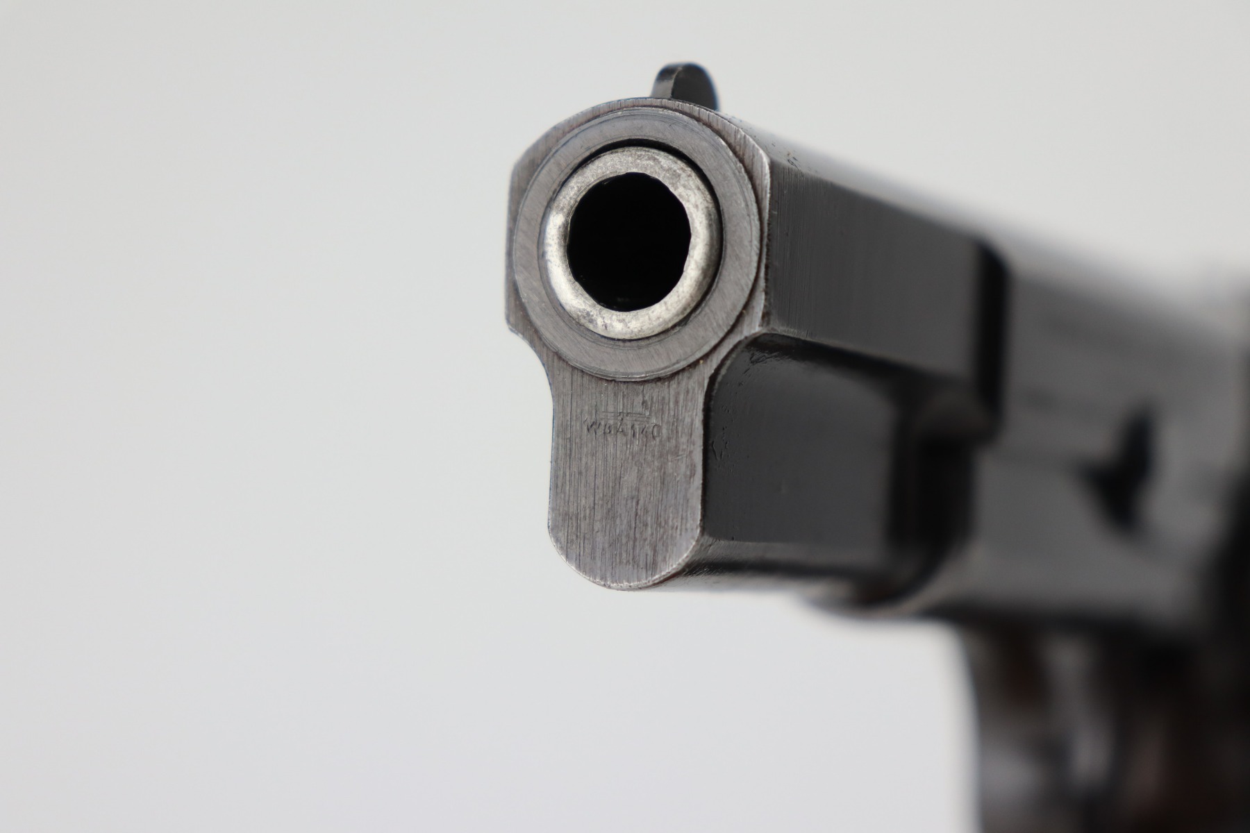 3/17/21 – This is an excellent example of an FN Browning High Power rig issued to the Nazi military during WW2. The gun is all matching and has the proper “Waffen 140” military proofs. The rig comes with an excellent 1943-dated holster and a period-correct magazine. The gun has retained about 96% of its original finish. There is just a hint of thinning on the straps and very minor wear around the muzzle and high edges of the slide. It has excellent bakelite grips. Excellent bore – shiny with strong rifling and very minor freckling in the grooves.
