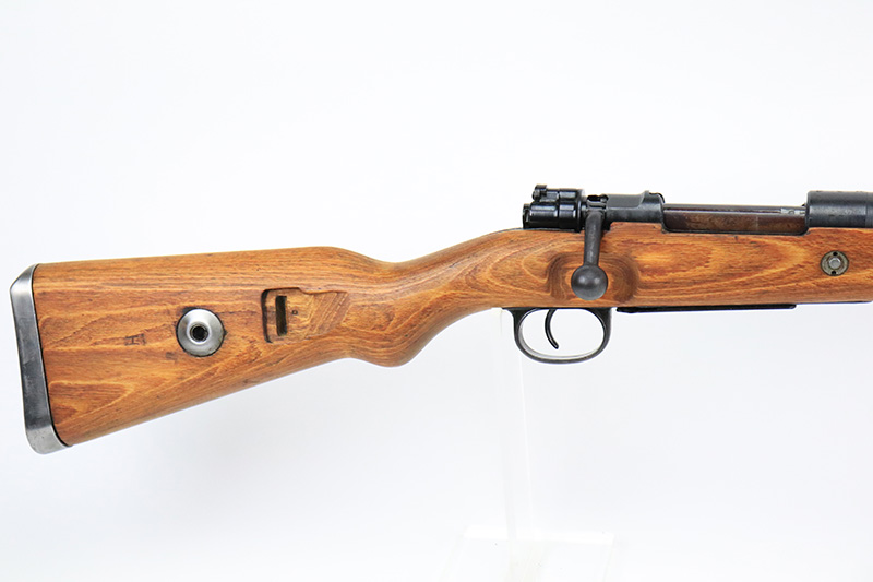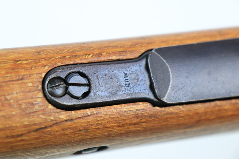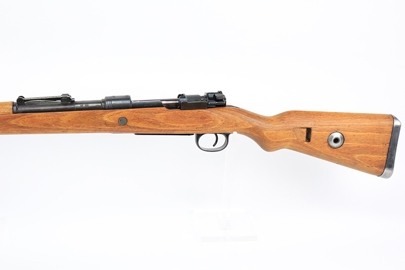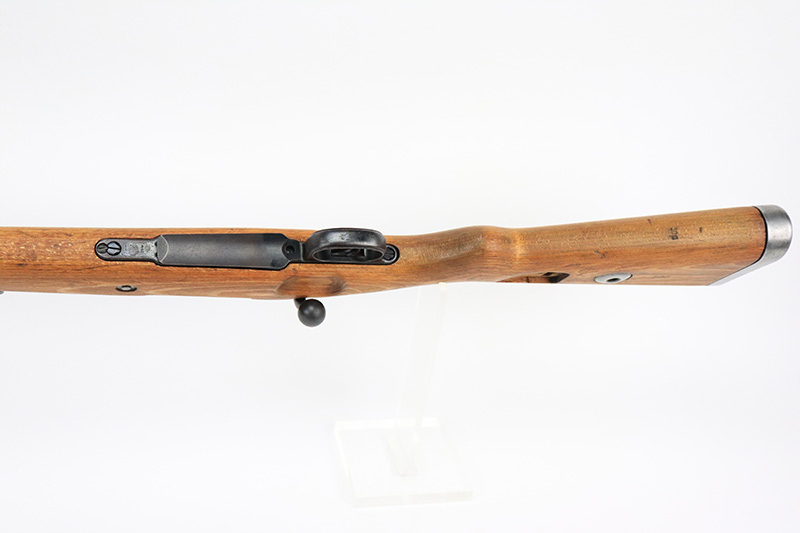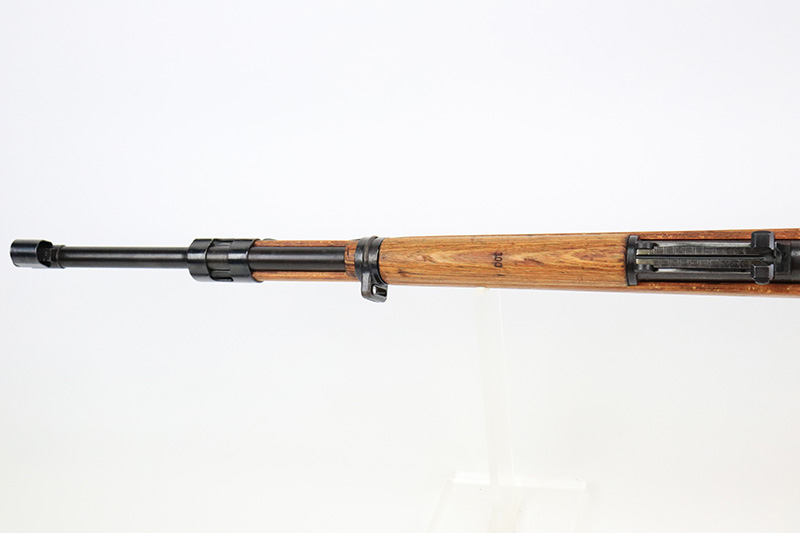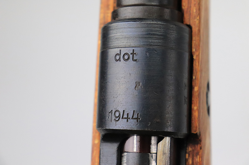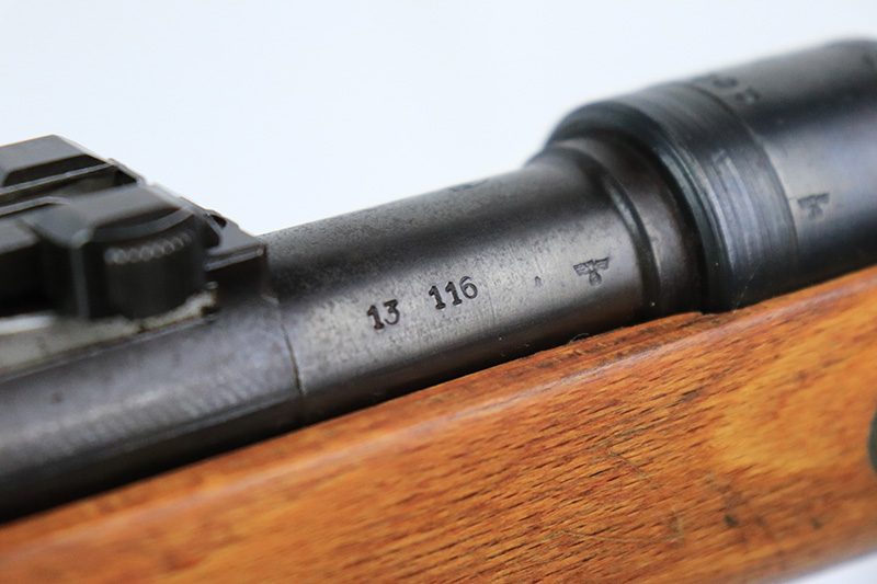 10/12/22 – This is an excellent example of a Nazi K8 that was made in 1944 at the Waffen-Werke Brunn factory. A comparable example from Karem/Steves K98 book shows shared features, such as: dot marked stock and handguard, unnumbered bands, trigger guard and safety, locking screws provision in trigger guard, red glue laminate stock, armorers spare safety, and 5 digital serial range. This particular example is a little earlier than the one shown in the book, and does have the allotment for the cleaning rod. All numbered parts match. The stock is in very good condition but has been sanded, and some initials are lightly scratched in the left side. The markings are still vey clear and visible though. Mint bore.