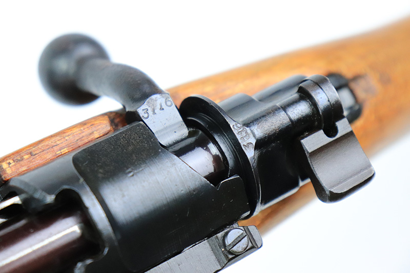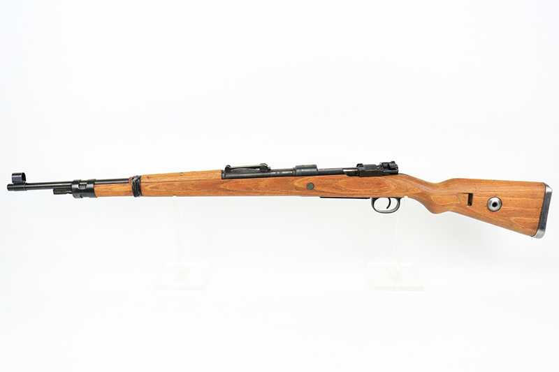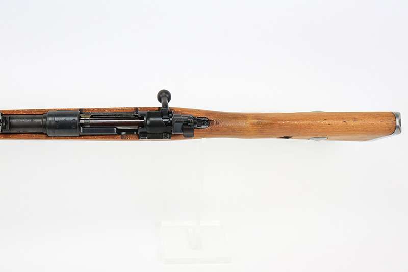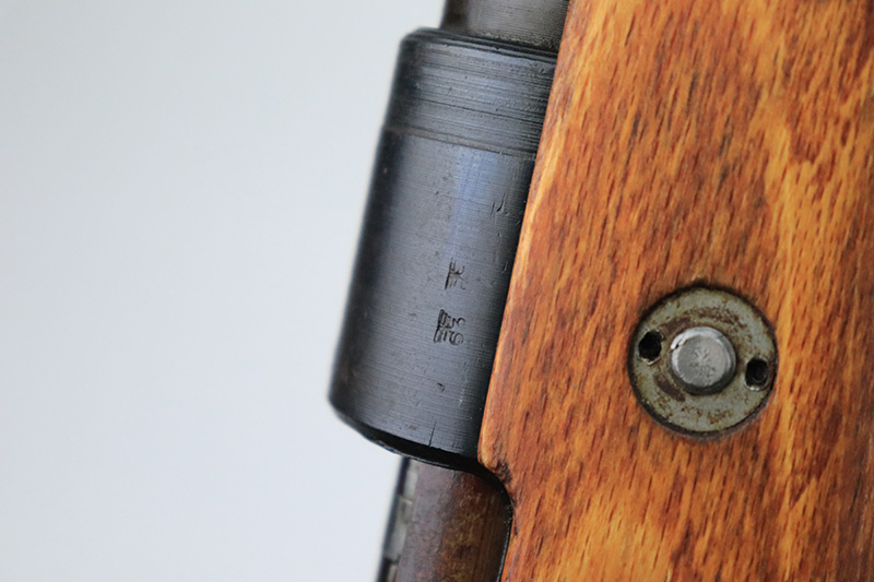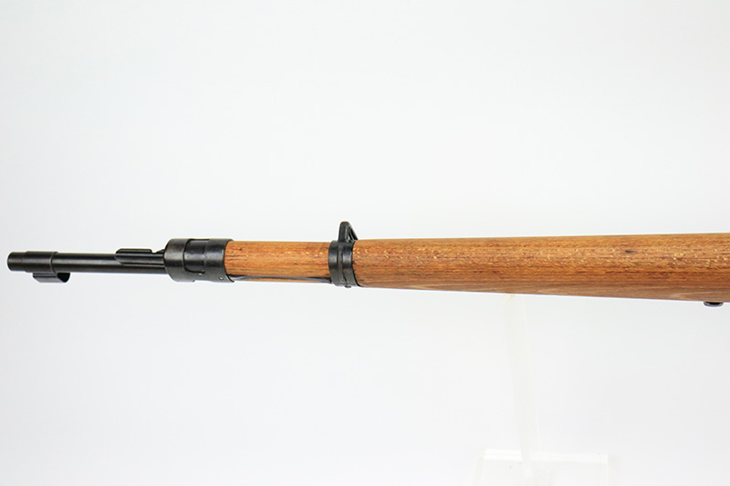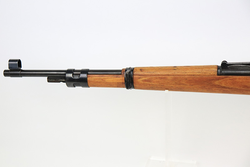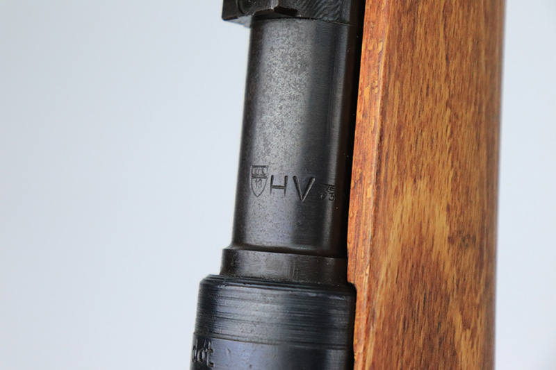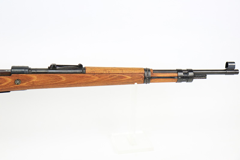 10/12/22 – This is an excellent example of a Nazi K8 that was made in 1944 at the Waffen-Werke Brunn factory. A comparable example from Karem/Steves K98 book shows shared features, such as: dot marked stock and handguard, unnumbered bands, trigger guard and safety, locking screws provision in trigger guard, red glue laminate stock, armorers spare safety, and 5 digital serial range. This particular example is a little earlier than the one shown in the book, and does have the allotment for the cleaning rod. All numbered parts match. The stock is in very good condition but has been sanded, and some initials are lightly scratched in the left side. The markings are still vey clear and visible though. Mint bore.
