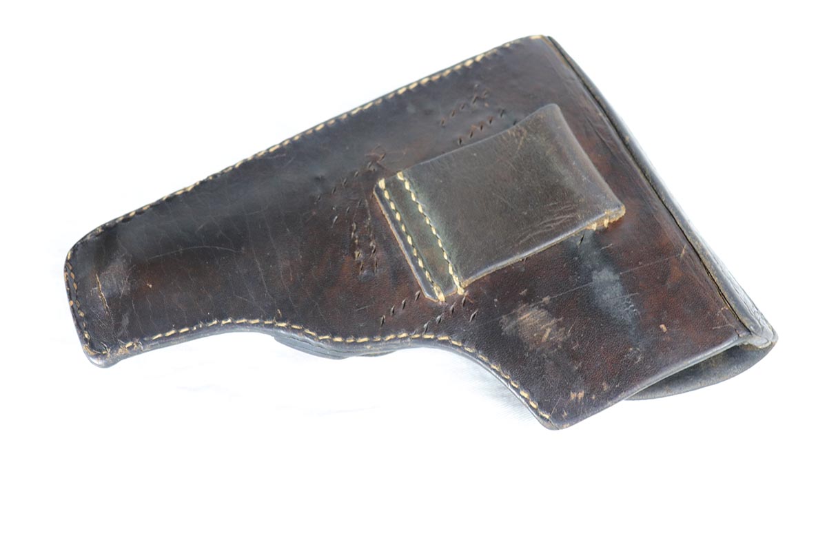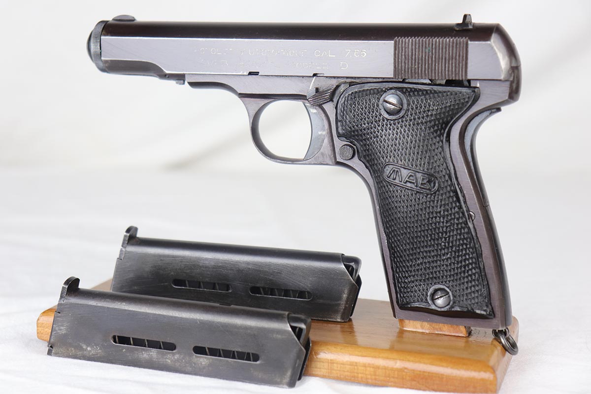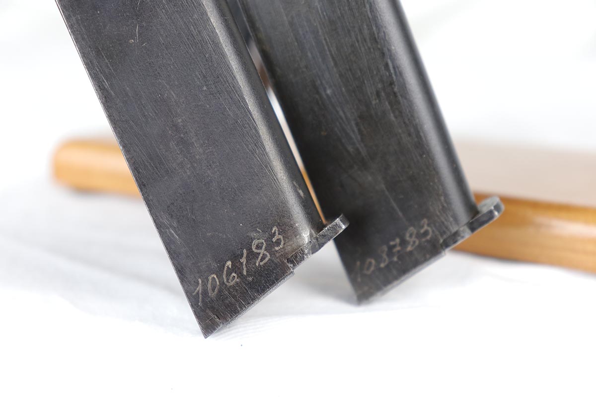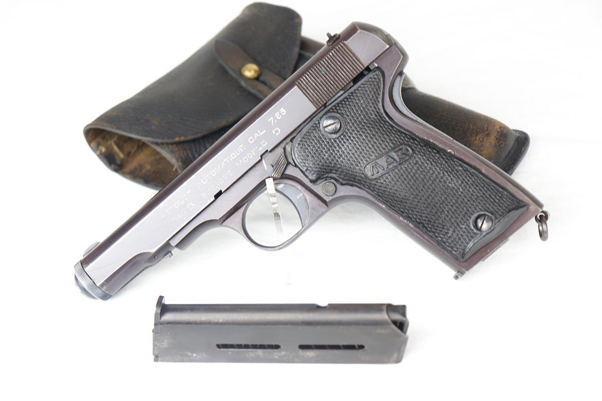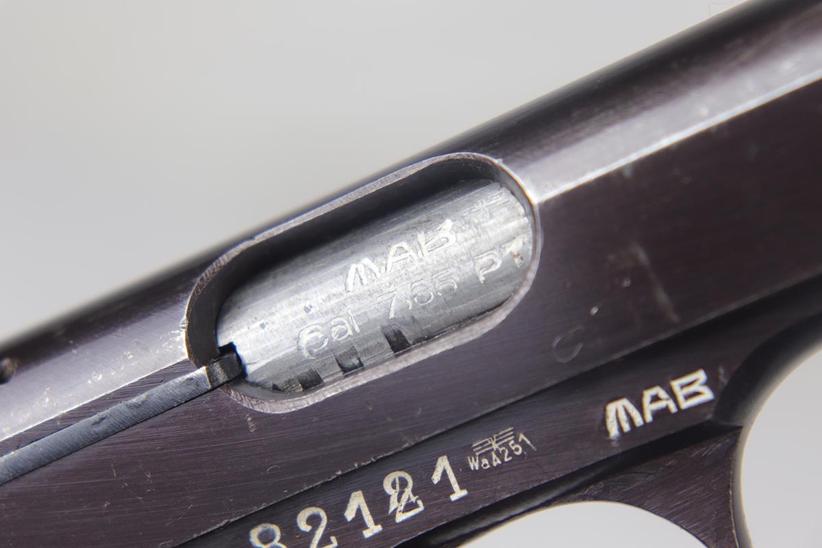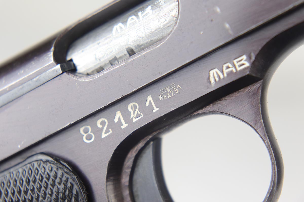 7/17/18 – This is a very nice and hard-to-find French MAB Model D rig that was manufactured for the German Army following their occupation of France.  It has proper WaA251 proofs on the frame, and comes with two total original magazines and an original holster that is Nazi Eagle marked.  The bluing rates at about 96-97% with holster wear on the edges, and some finish loss along back of the slide.  The finish has a nice plum hue to it throughout.  The grips show some age and have two minor chips on the right panel.  Excellent bore.  The holster is original but fairly worn, with small patterned holes in a few areas.  The brass knob is also loosely fitted into the top flap.