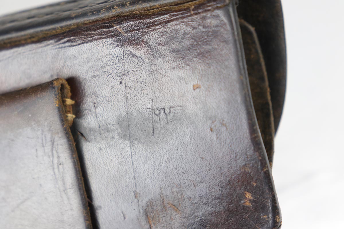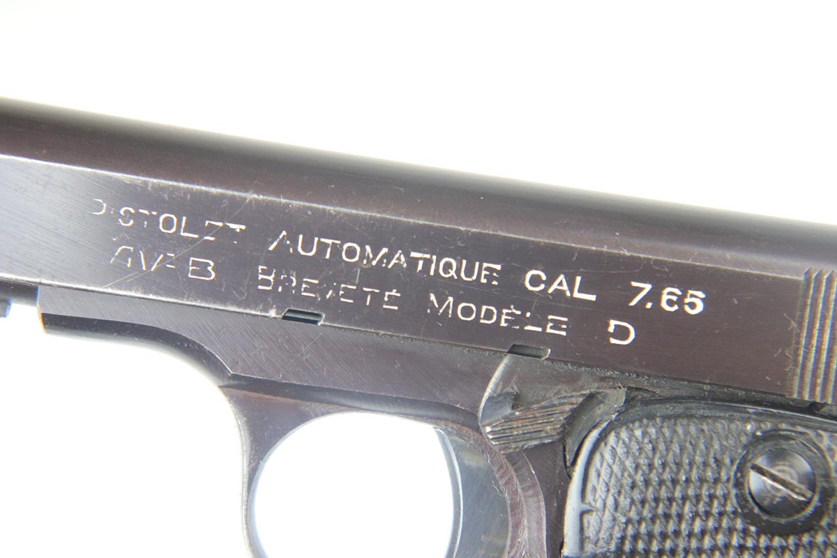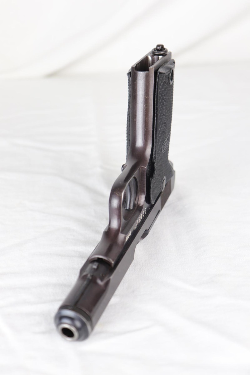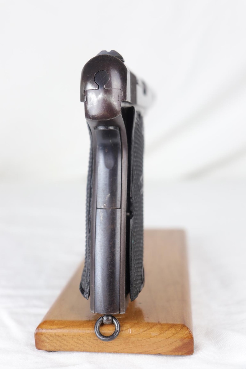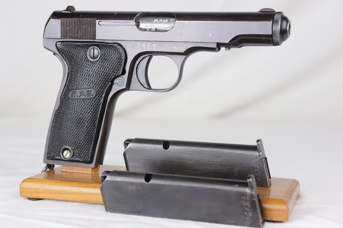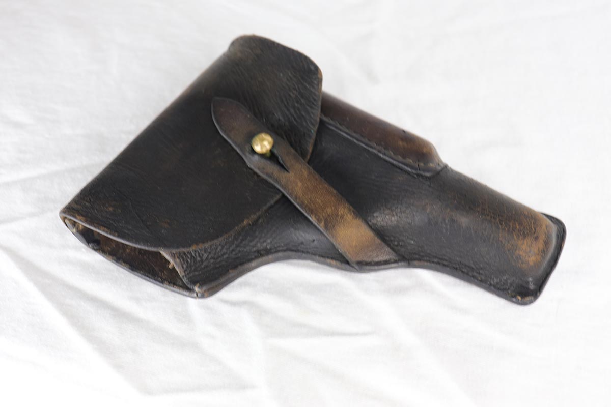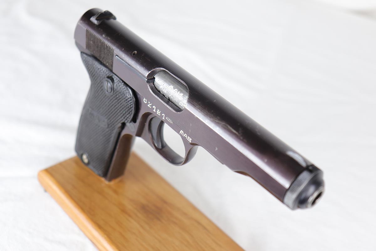 7/17/18 – This is a very nice and hard-to-find French MAB Model D rig that was manufactured for the German Army following their occupation of France.  It has proper WaA251 proofs on the frame, and comes with two total original magazines and an original holster that is Nazi Eagle marked.  The bluing rates at about 96-97% with holster wear on the edges, and some finish loss along back of the slide.  The finish has a nice plum hue to it throughout.  The grips show some age and have two minor chips on the right panel.  Excellent bore.  The holster is original but fairly worn, with small patterned holes in a few areas.  The brass knob is also loosely fitted into the top flap.