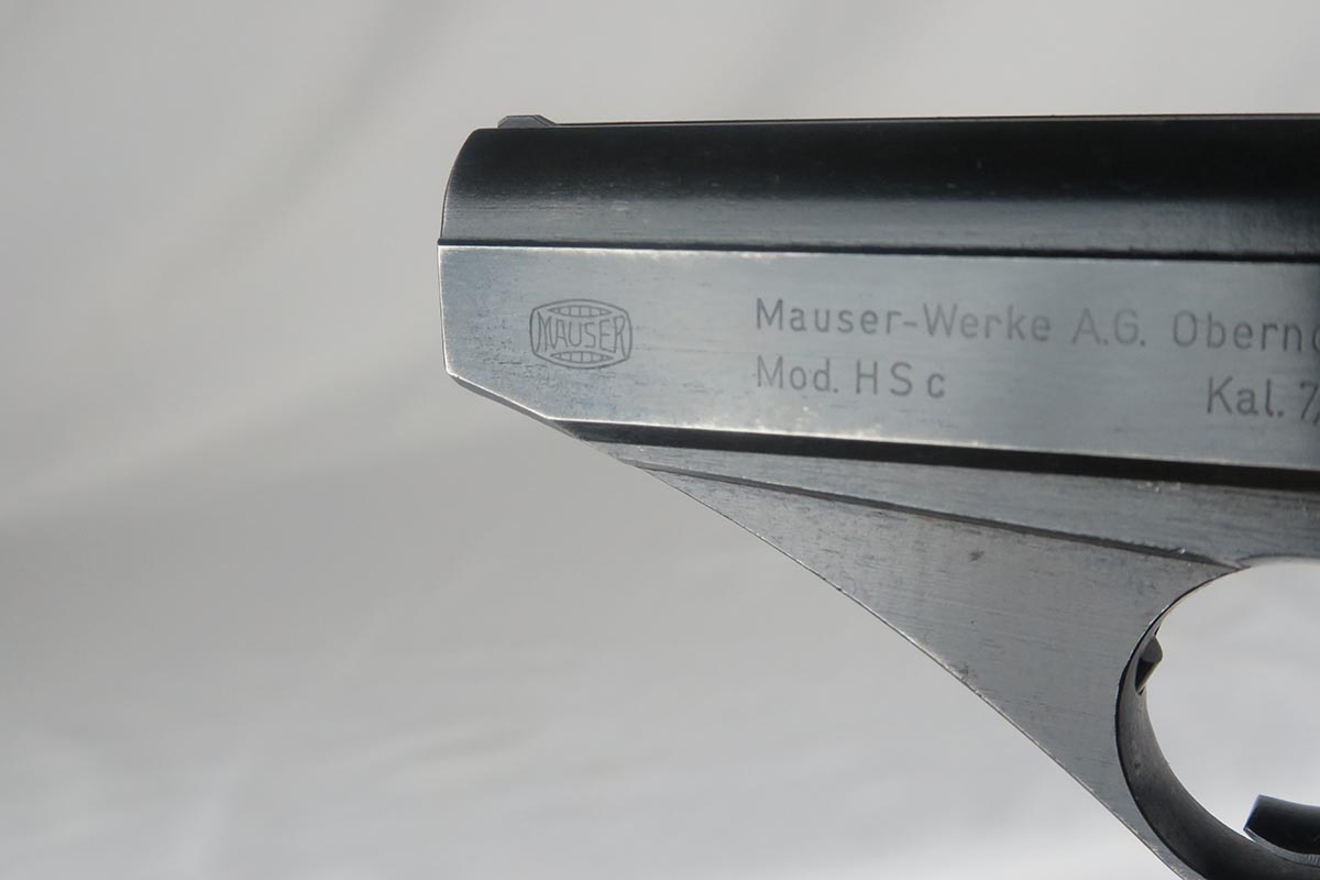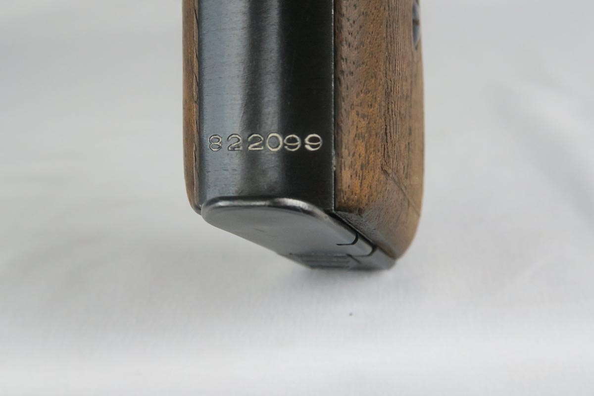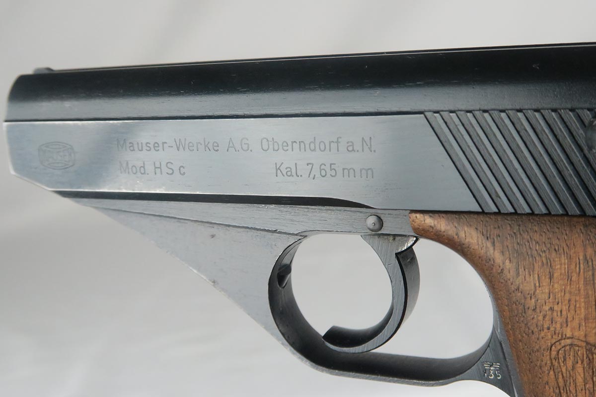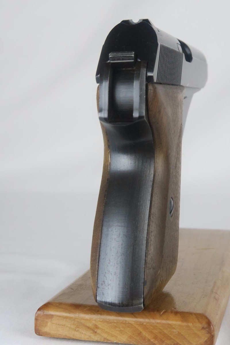 11/2/17 – This is an excellent Mauser HSc with Eagle/135 Nazi acceptance proof.  The original bluing rates at 98+% with minor wear on the edge of the trigger guard and bottom of the back strap.  Nice wood grips with no chips or cracks.  Blank bottom magazine.  Excellent bore.