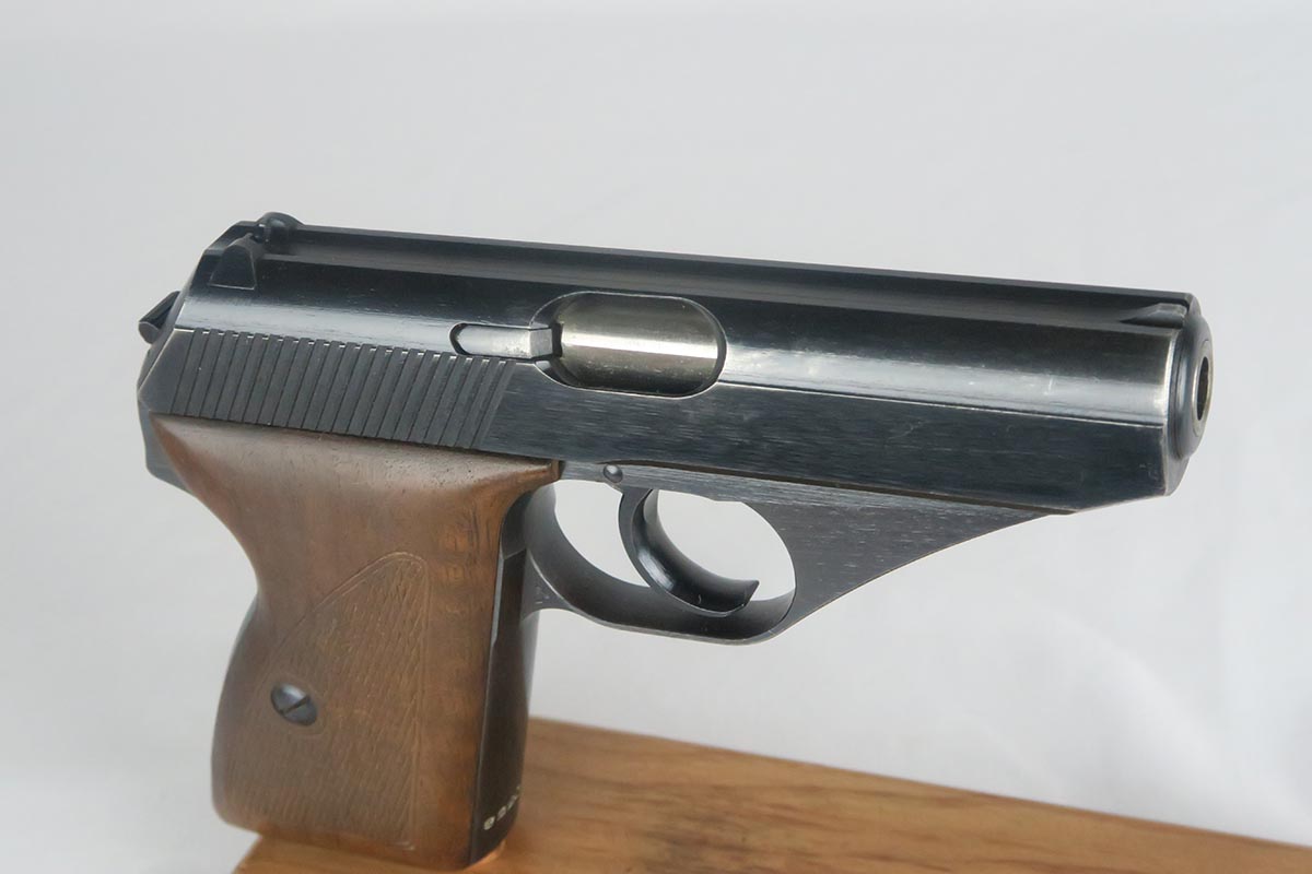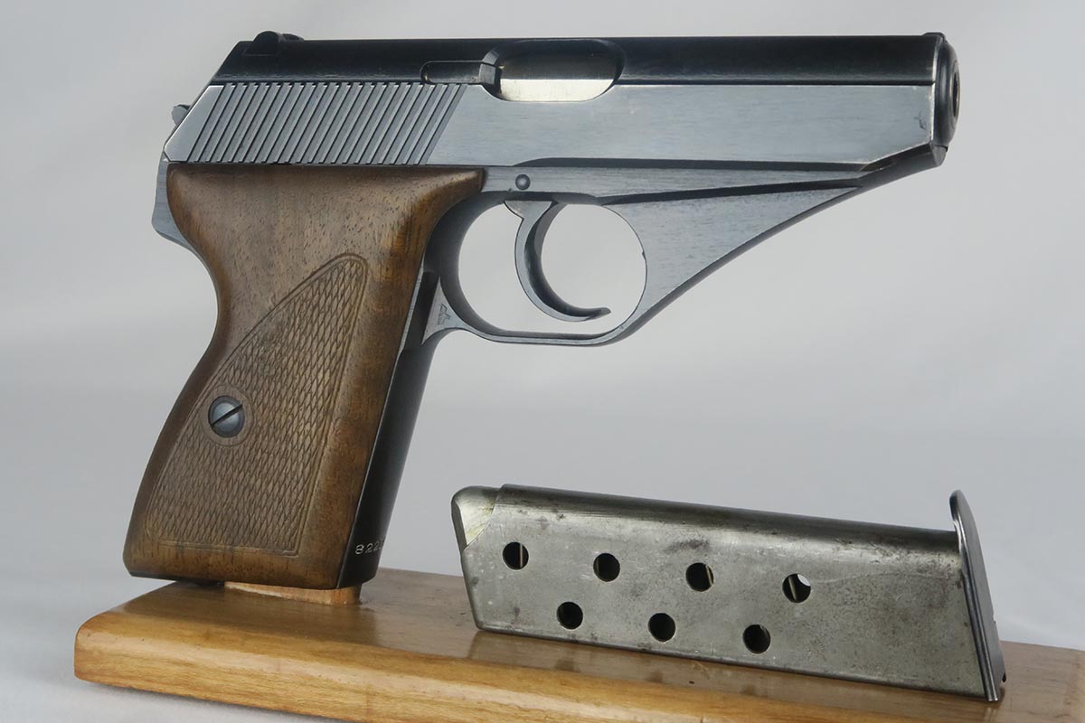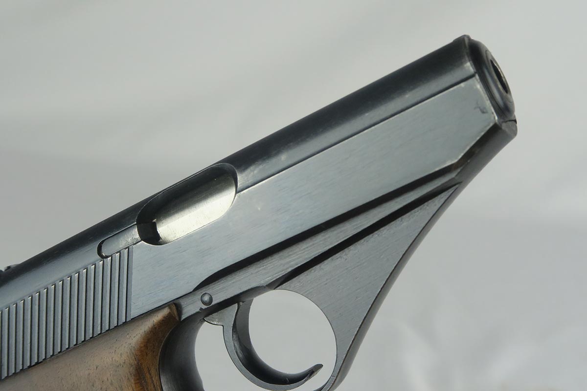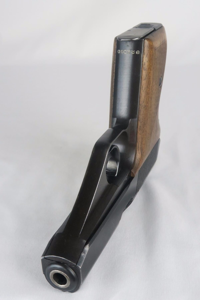 11/2/17 – This is an excellent Mauser HSc with Eagle/135 Nazi acceptance proof.  The original bluing rates at 98+% with minor wear on the edge of the trigger guard and bottom of the back strap.  Nice wood grips with no chips or cracks.  Blank bottom magazine.  Excellent bore.