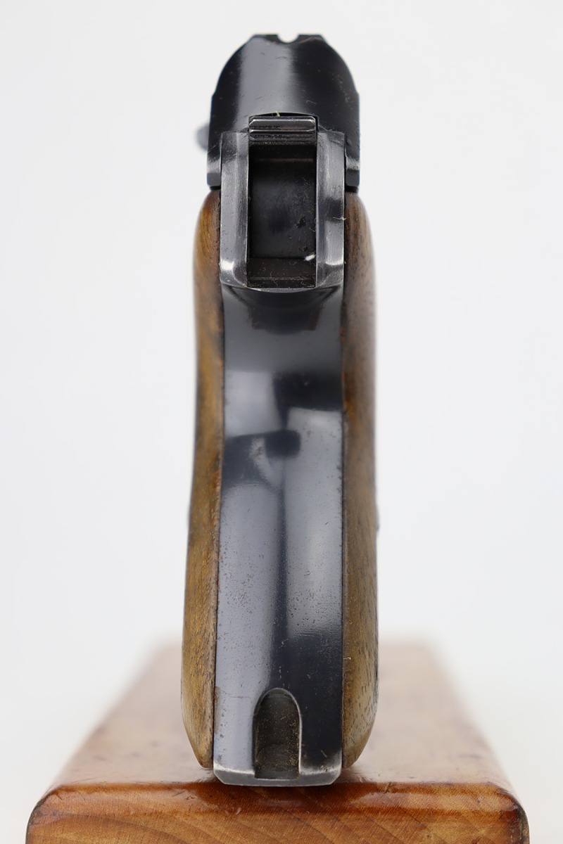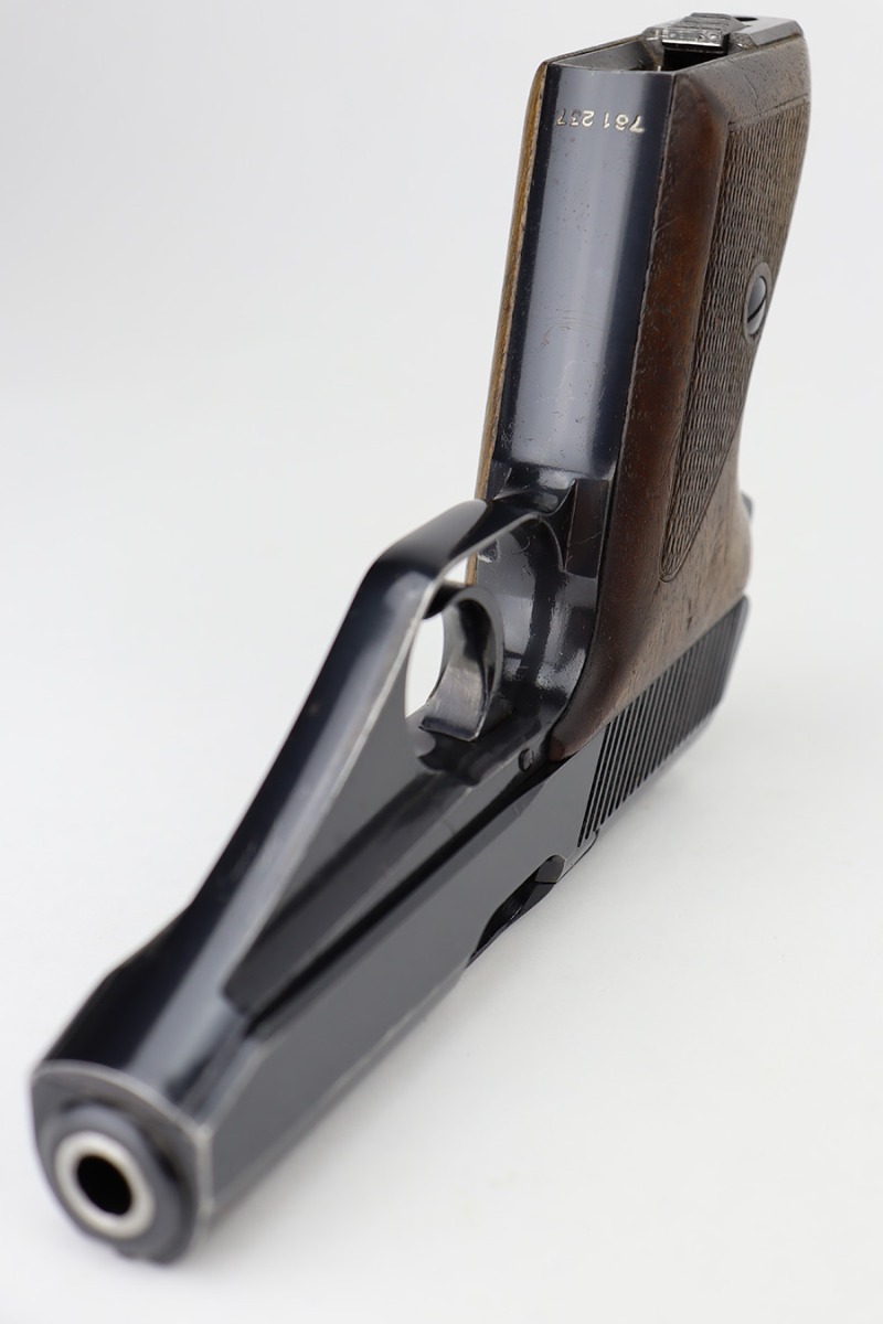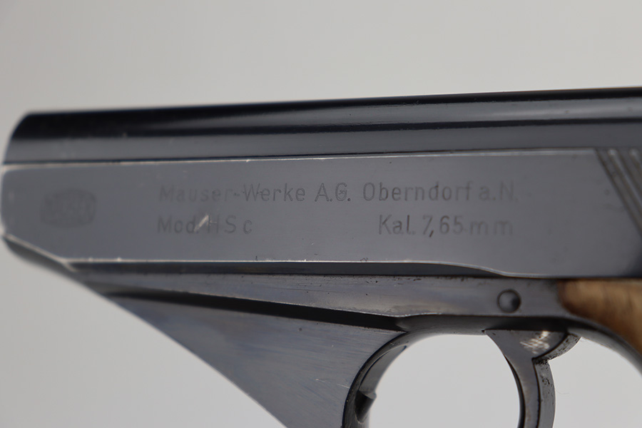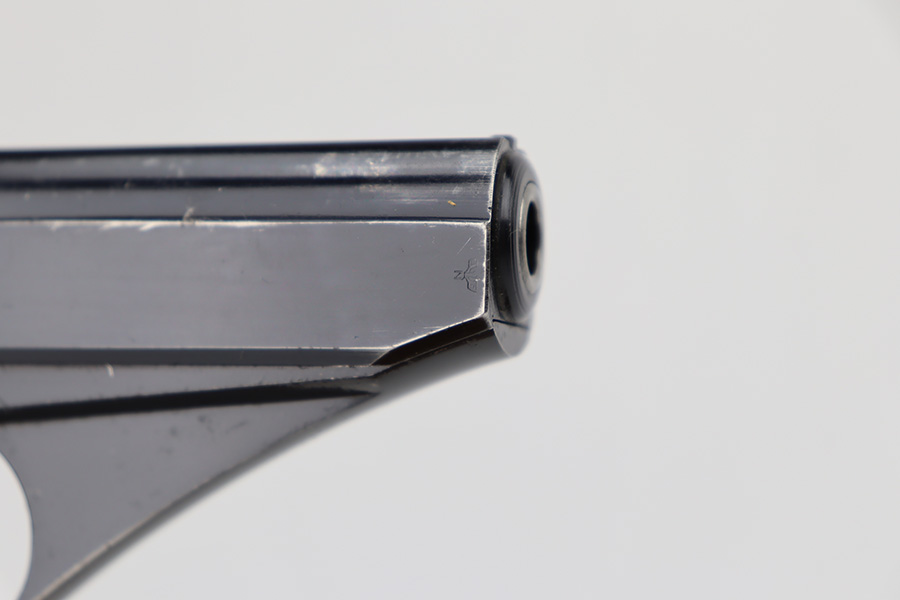 6/12/23 – This is an excellent example of an earlier Mauser HSC issued to the Nazi military in 1942. All matching with the proper “Eagle 135” military acceptance proof on the trigger guard. It has retained about 96% of its original high polish finish. Very minor muzzle wear and wear along the round edge of the right side of the slide. Hints of freckling on the grip straps and a couple of very light scratches on the front strap. Fitted with nice period-correct wood grips – some minor bruising here and there. Comes with a period-correct Mauser banner magazine. Mint bore.