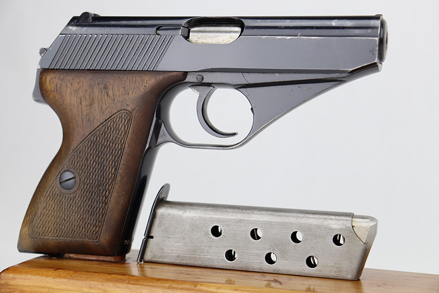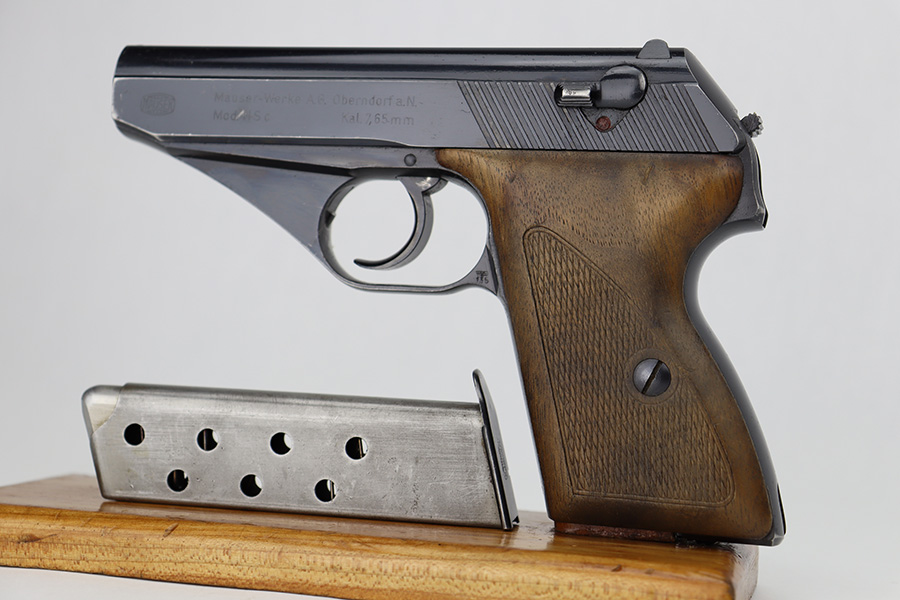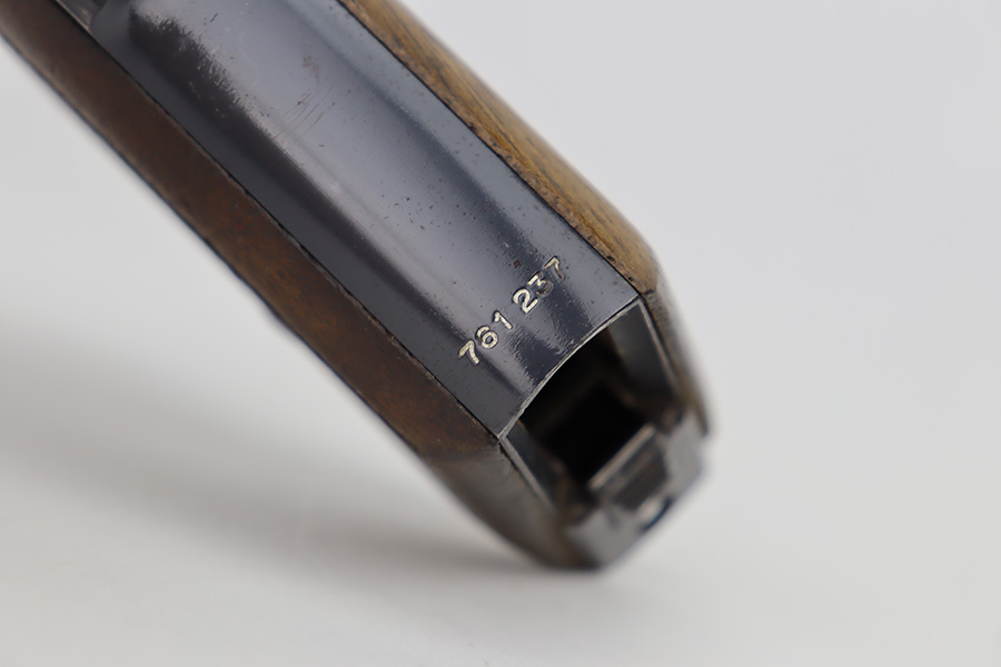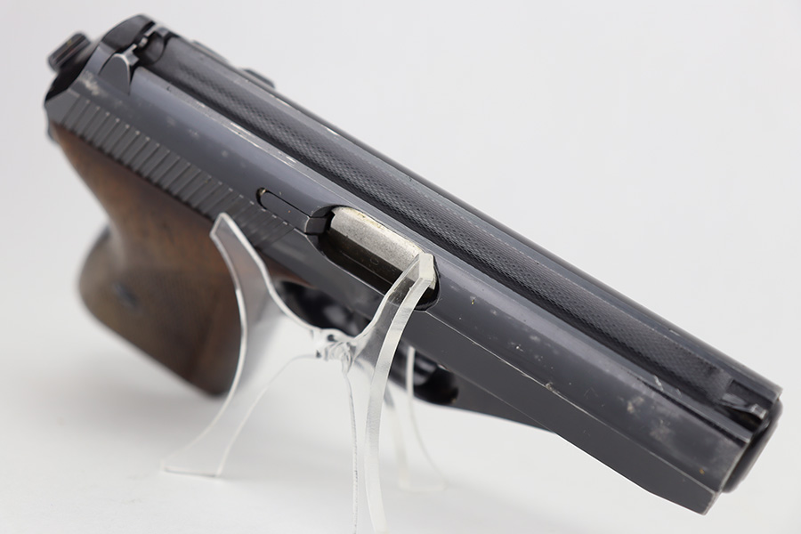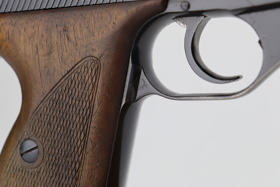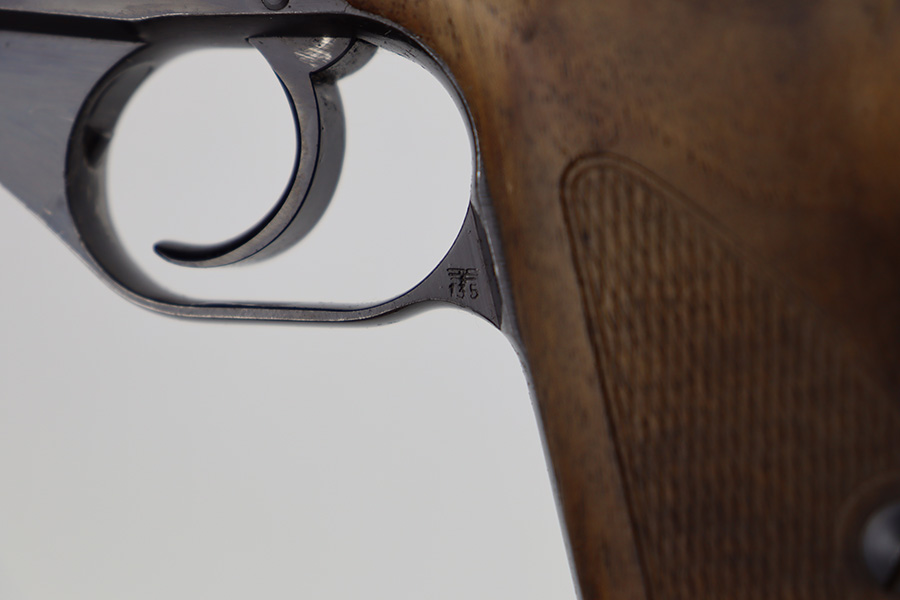 6/12/23 – This is an excellent example of an earlier Mauser HSC issued to the Nazi military in 1942. All matching with the proper “Eagle 135” military acceptance proof on the trigger guard. It has retained about 96% of its original high polish finish. Very minor muzzle wear and wear along the round edge of the right side of the slide. Hints of freckling on the grip straps and a couple of very light scratches on the front strap. Fitted with nice period-correct wood grips – some minor bruising here and there. Comes with a period-correct Mauser banner magazine. Mint bore.