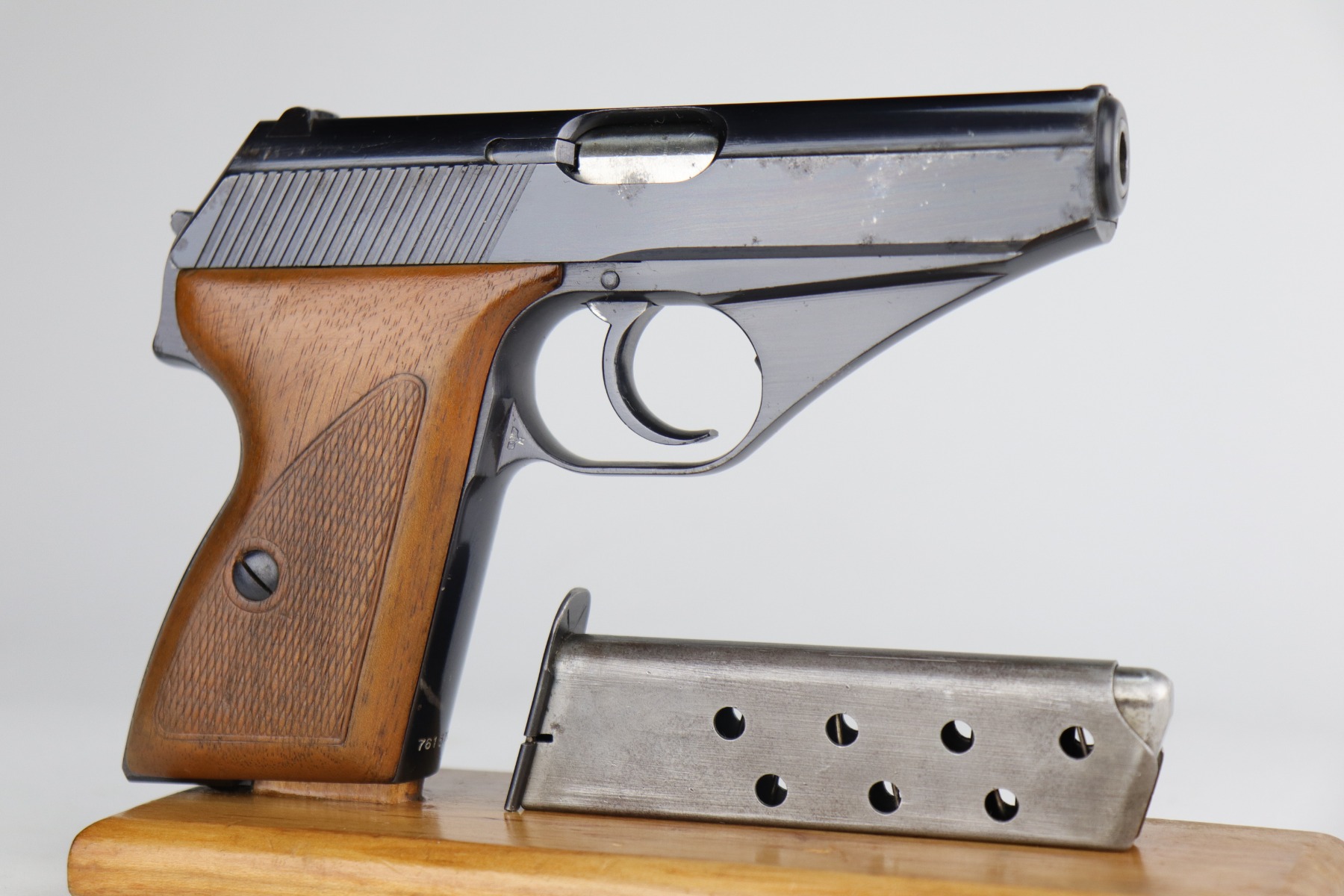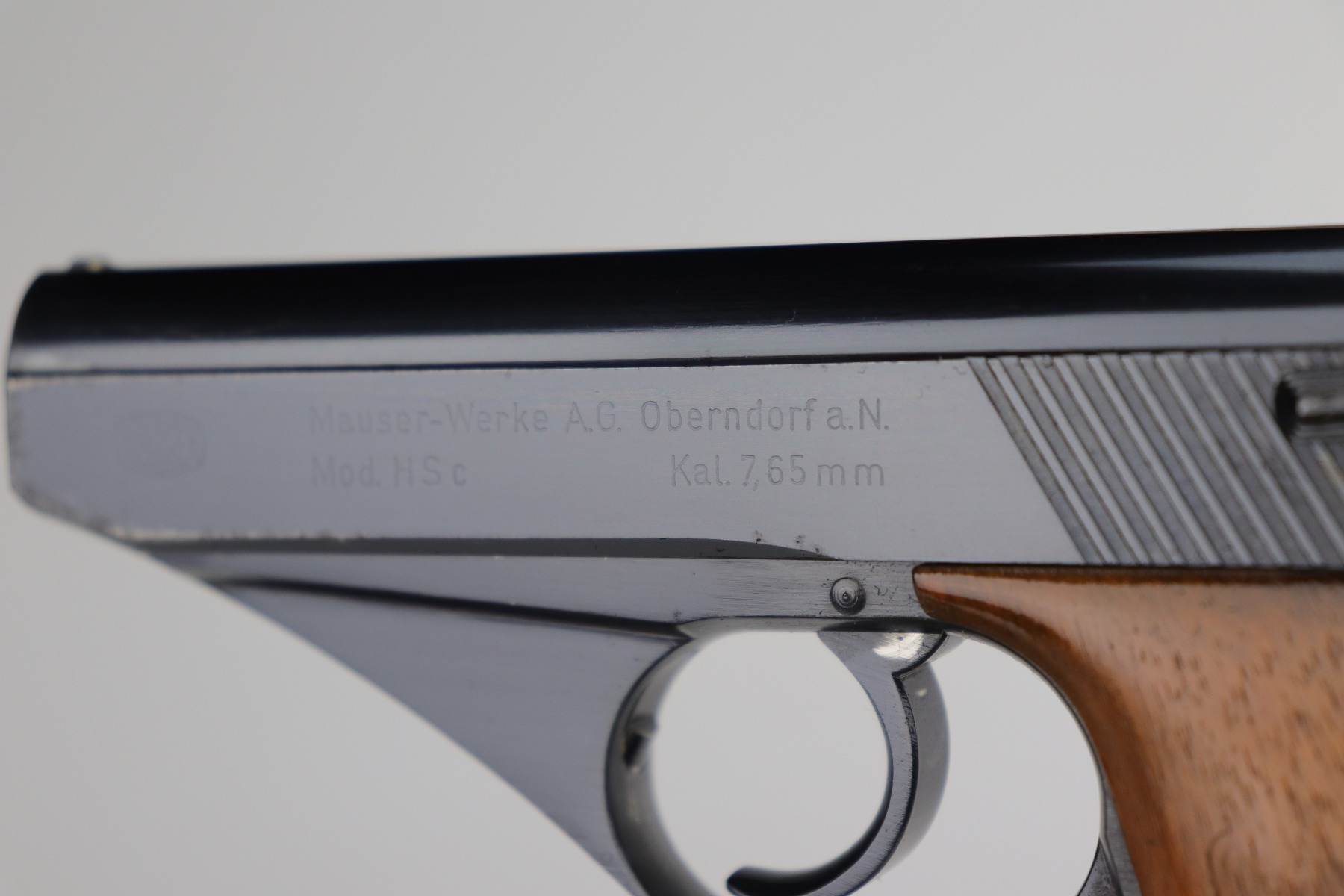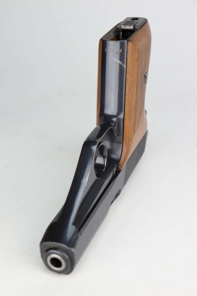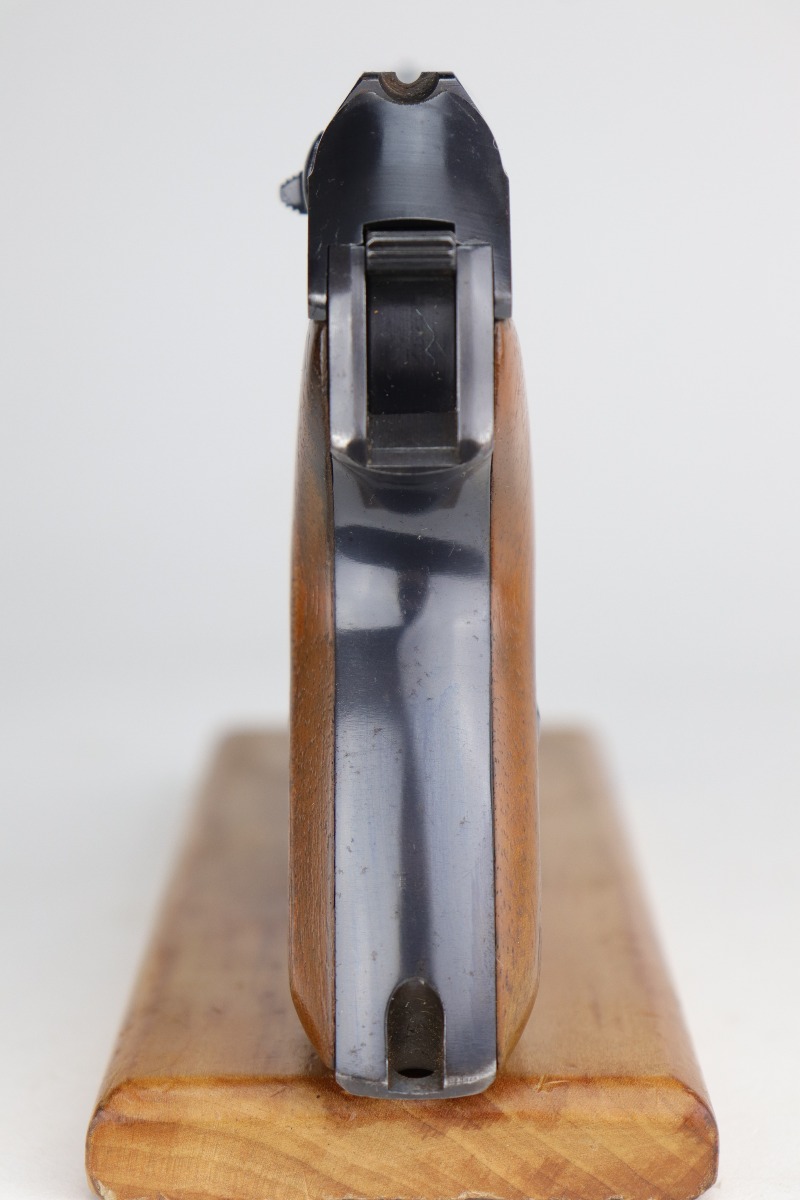 12/31/20 – This is an excellent example of a Mauser HSC issued to the Nazi military in 1942. It is matching and has the proper “Eagle 135” military proofs. It has retained about 95-96% of its original high polish blue. There is a spot of wear on the front strap, minor wear around the muzzle, and spotty discoloration on the right side of the slide. Spotty oxidation most noticeable around the muzzle and right side of the slide. It has excellent grips and one proper magazine. Excellent bore – shiny with strong rifling.