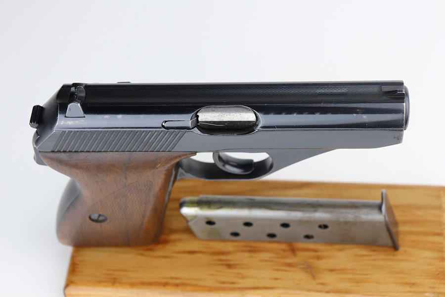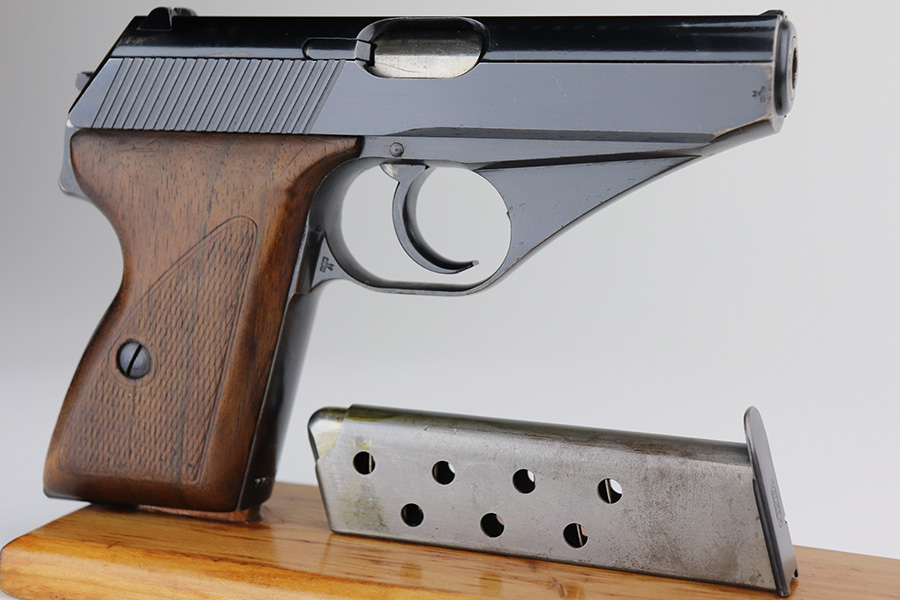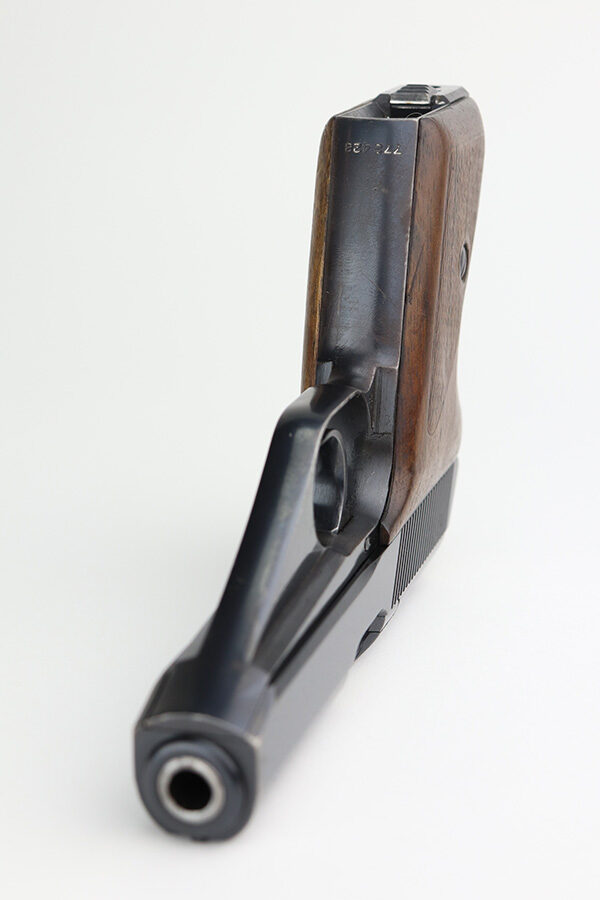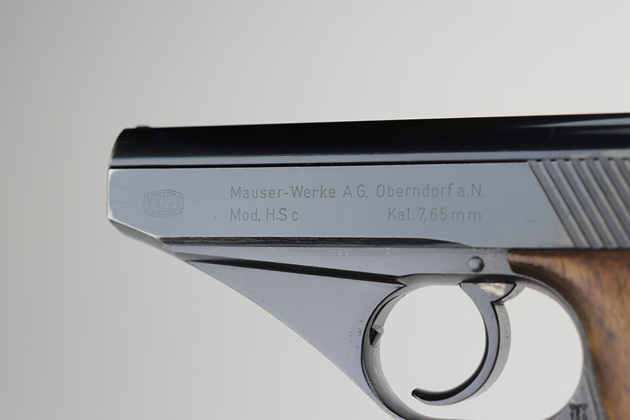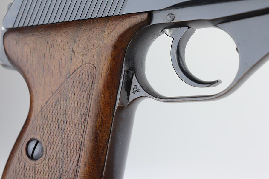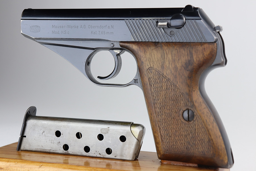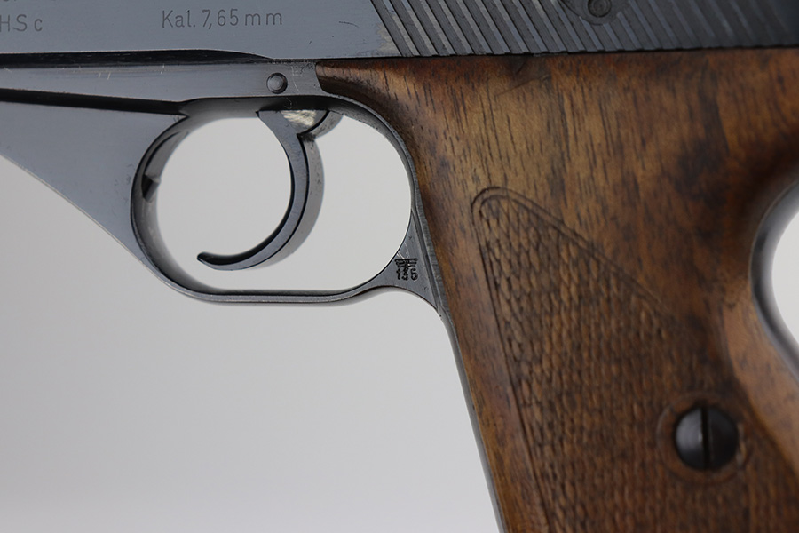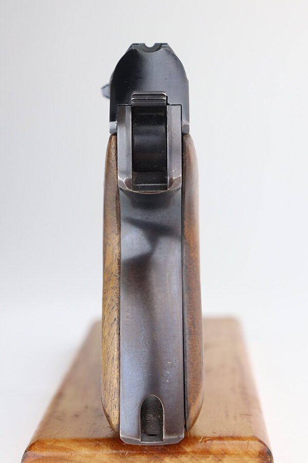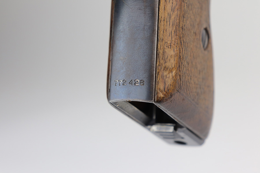 10/6/21 – This is an excellent example of a Mauser HSC issued to the Nazi military in 1942. It is all matching and has the proper “Eagle 135” military proof on the left side of the trigger guard. There is very minor wear around the muzzle and minor scratchy wear on the straps. There are some small dots of wear along the round edge of the right side of the slide. Comes with excellent wood grips and a period-correct magazine. The rifling in the bore is slightly worn and there is very minor pin-pricking throughout.