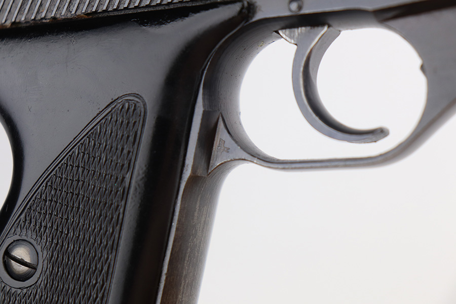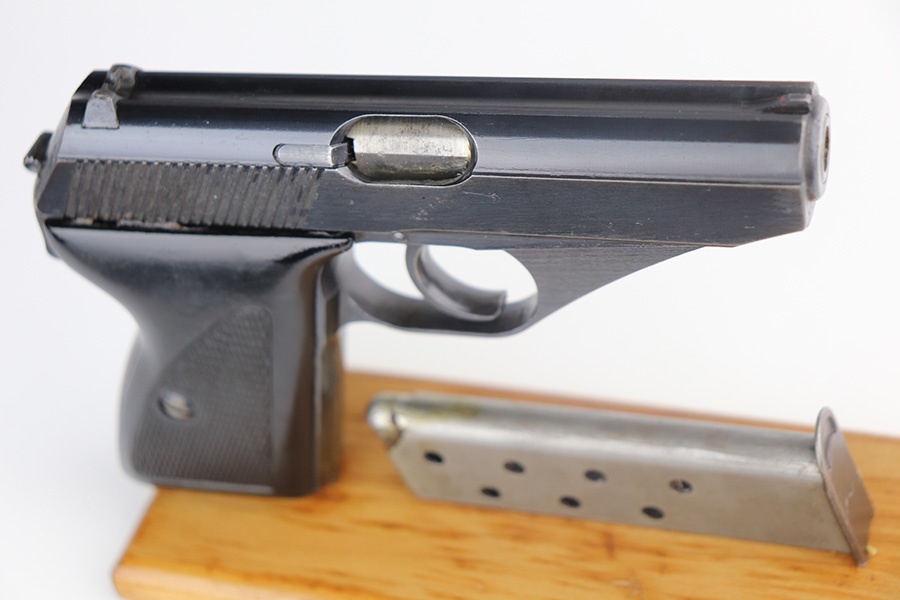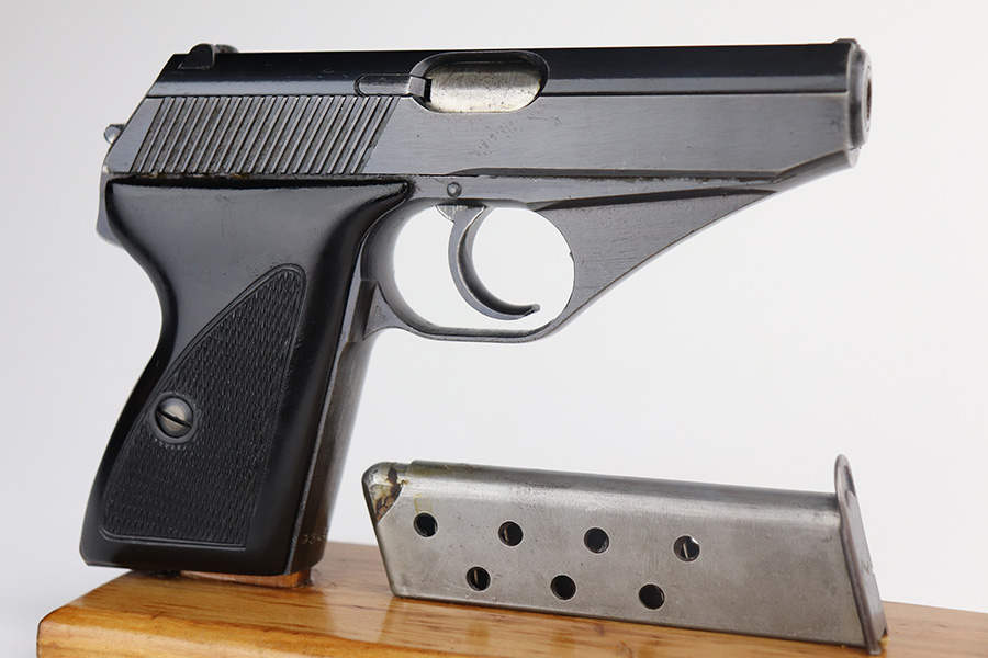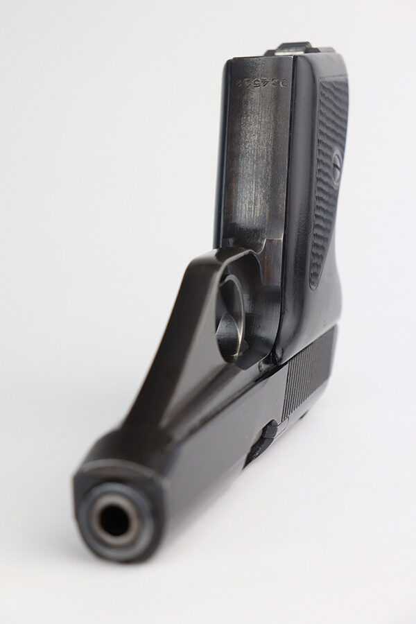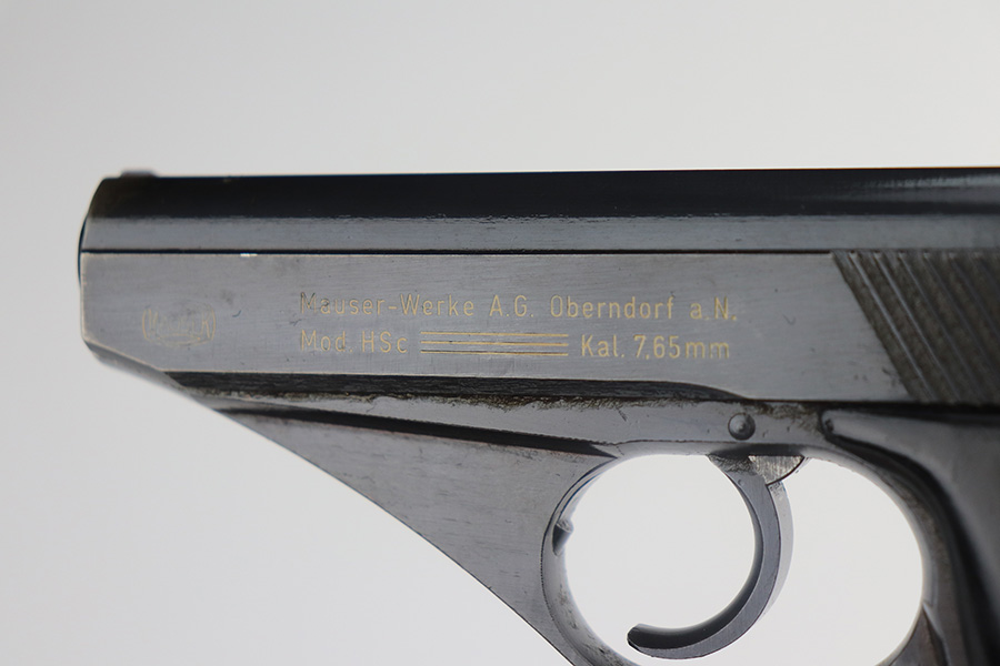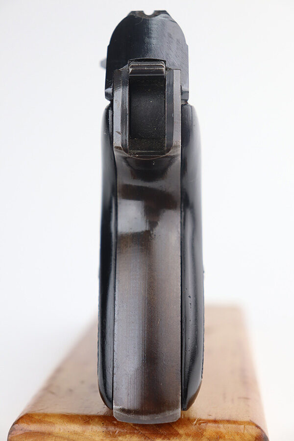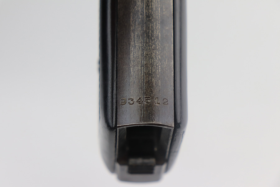 6/1/21 – This is an excellent example of a Mauser HSC issued to the Nazi military in 1944. It is matching and has the proper military waffen proof. It has retained about 97% of its finish. There is thinning on the front strap and minor patina on both straps. Just a hint of wear around the muzzle. A few very small dings on the right side of the slide. A few tiny dots of oxidation here and there. Comes with excellent late-war black bakelite grips and a proper magazine. Mint bore. There is thick grease in the internals – could benefit from a good cleaning.