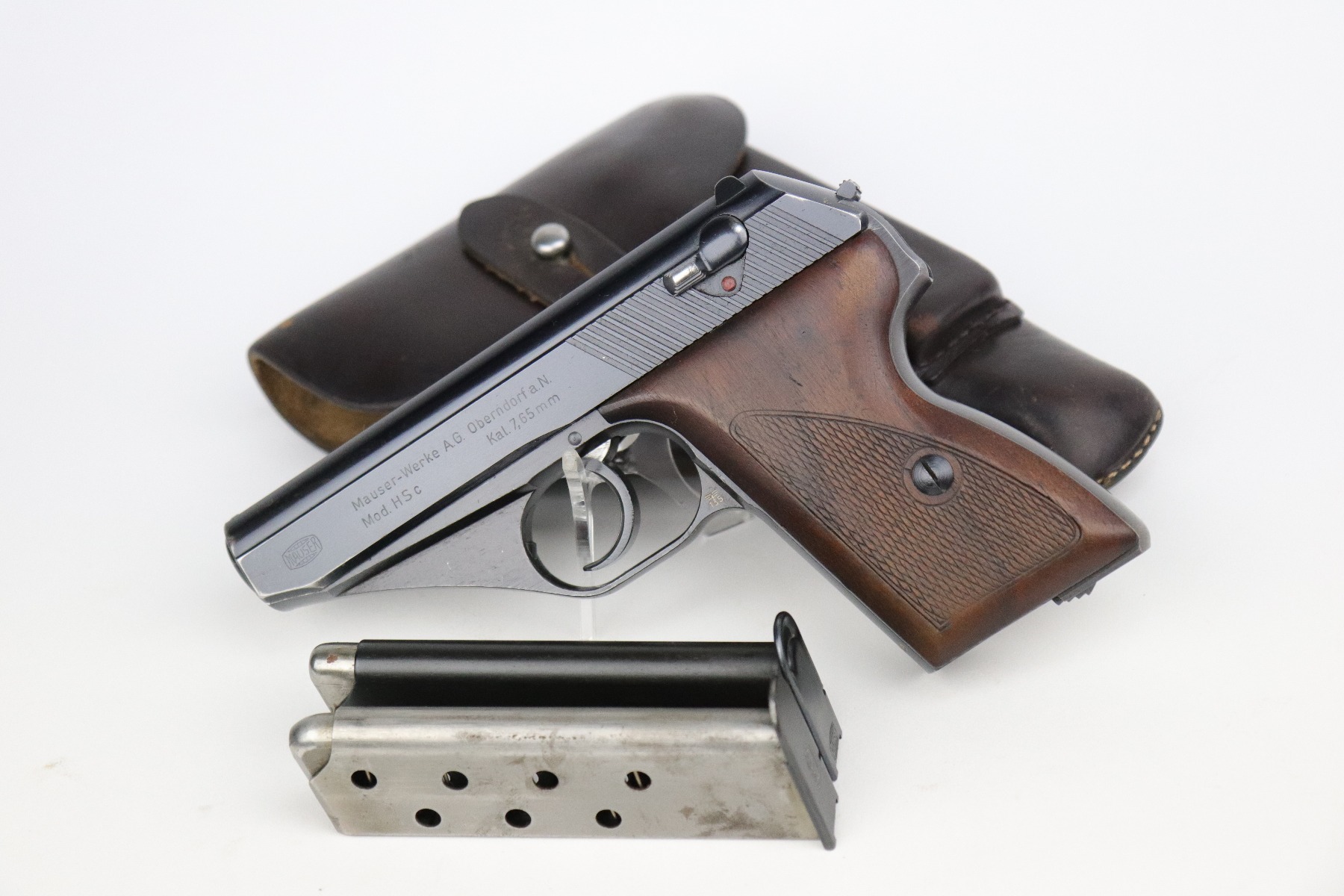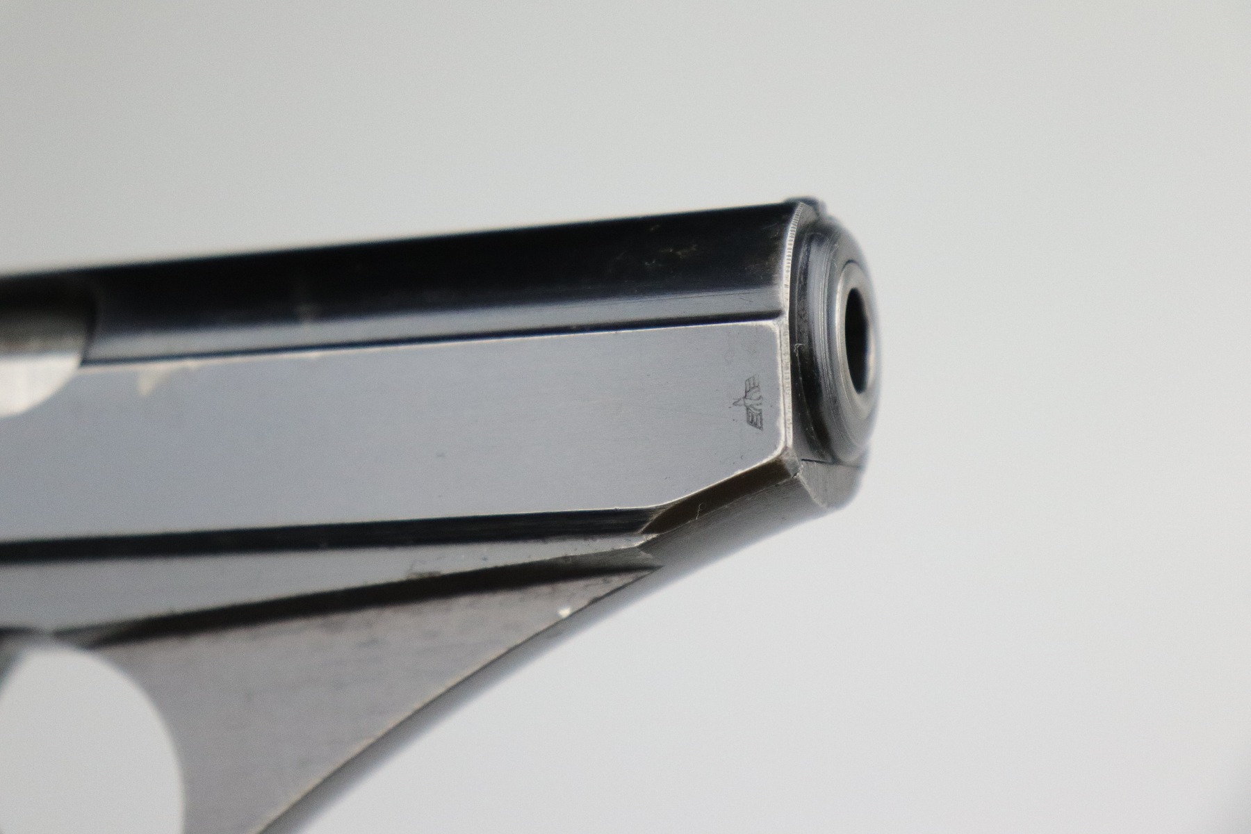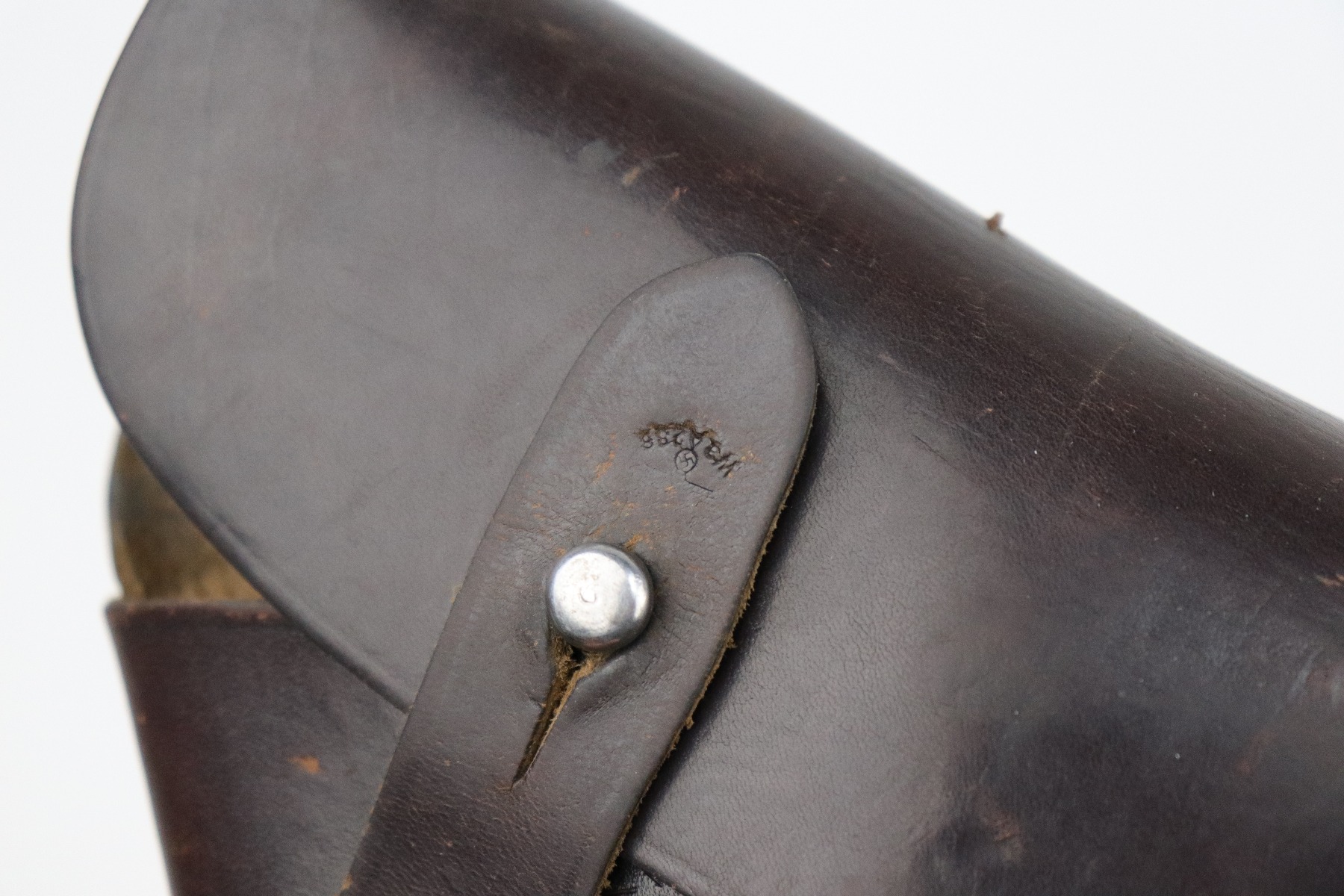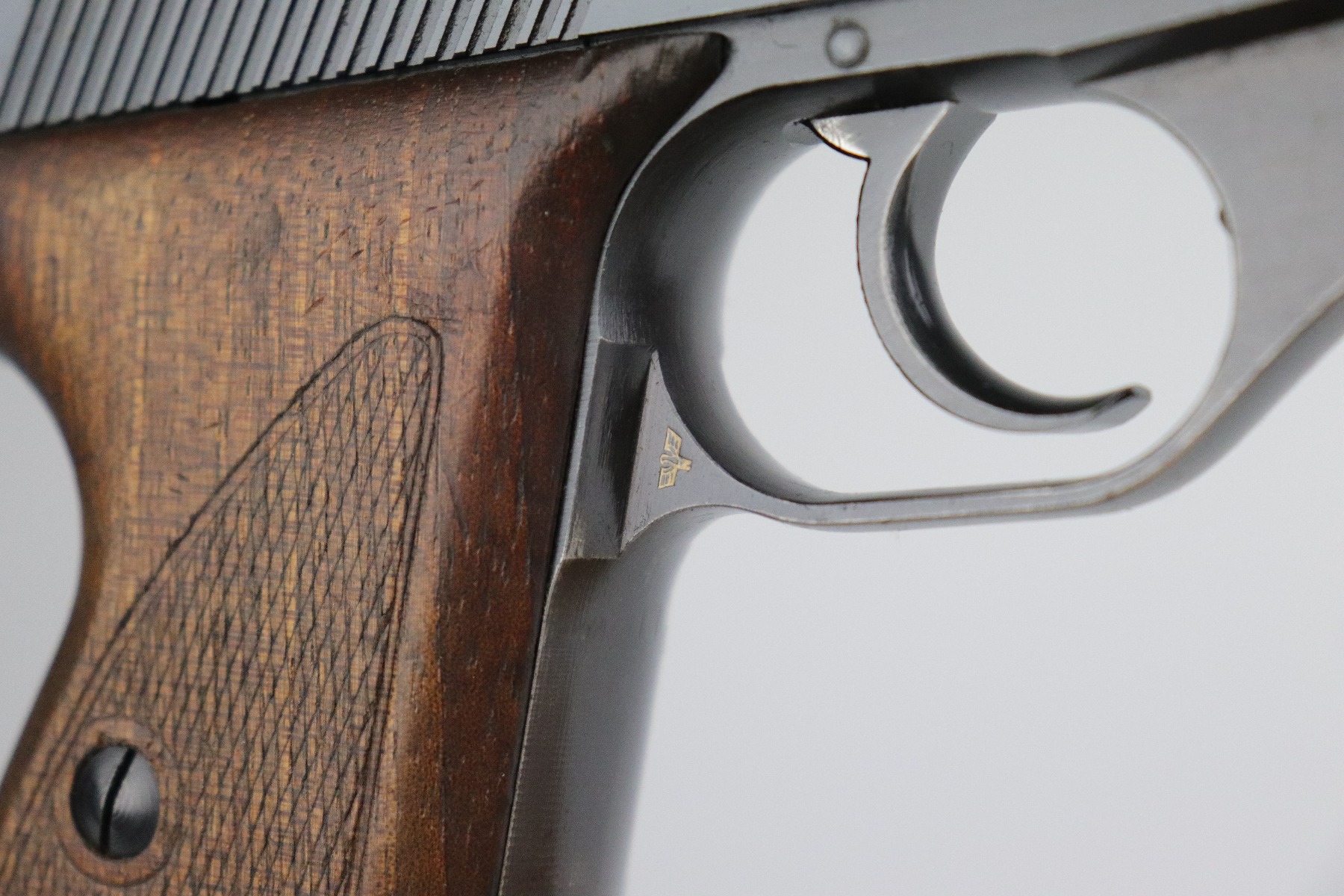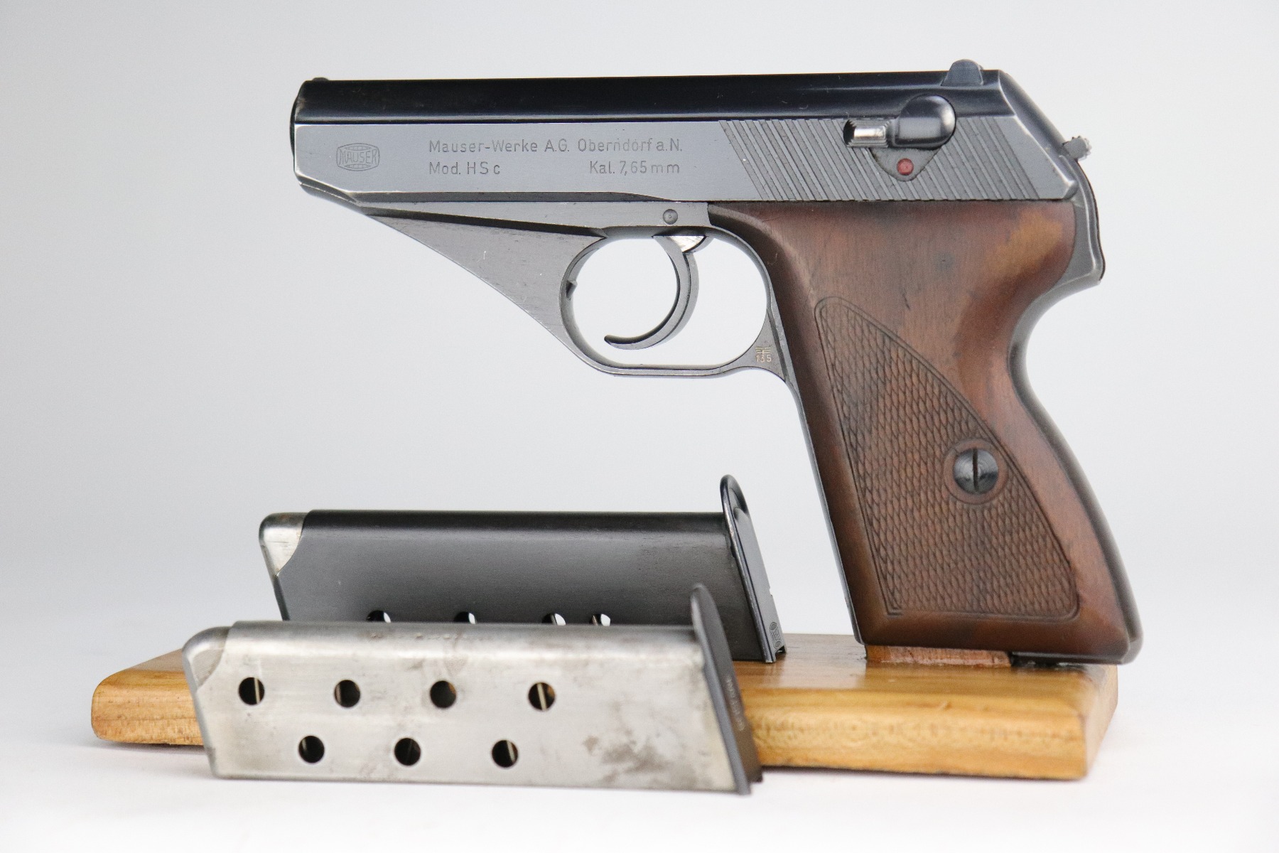 8/14/20 – This is an original Mauser HSC rig issued to the Nazi military in 1942. The gun has the proper “Eagle 135” Nazi military acceptance proof. The rig comes with an excellent holster and two magazines. One of the magazines is period-correct and the other is a post-war production. The gun is in excellent condition, retaining about 96% of its original bluing. Very minor muzzle wear and a few small spots of wear on the right side of the slide. There is a small spot of wear at the base of the back strap. Given the nature of the machining, the straps are difficult to rate, but there appears to be very minor thinning and some patina showing through. The bore is excellent – shiny with strong rifling. The holster is in excellent condition. It is waffenamt and dated 1941.