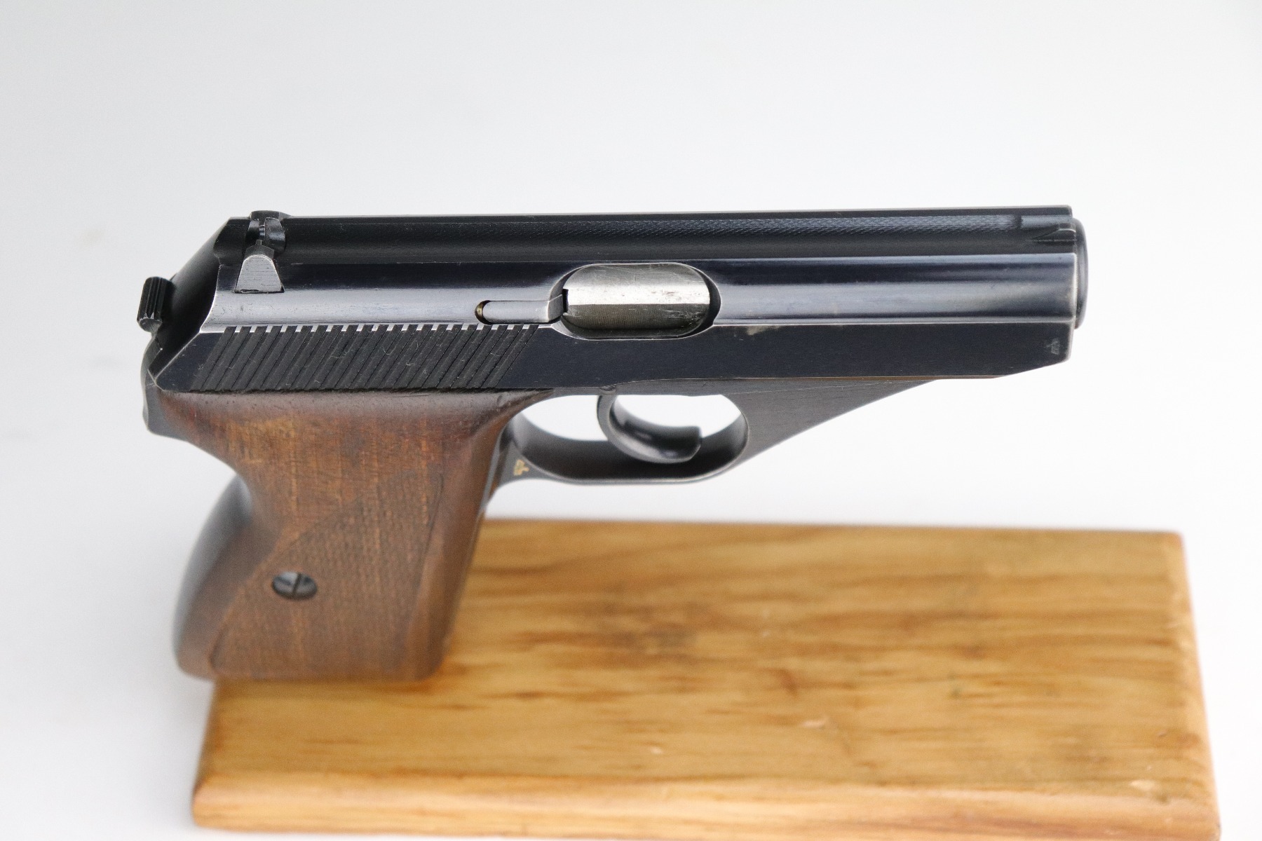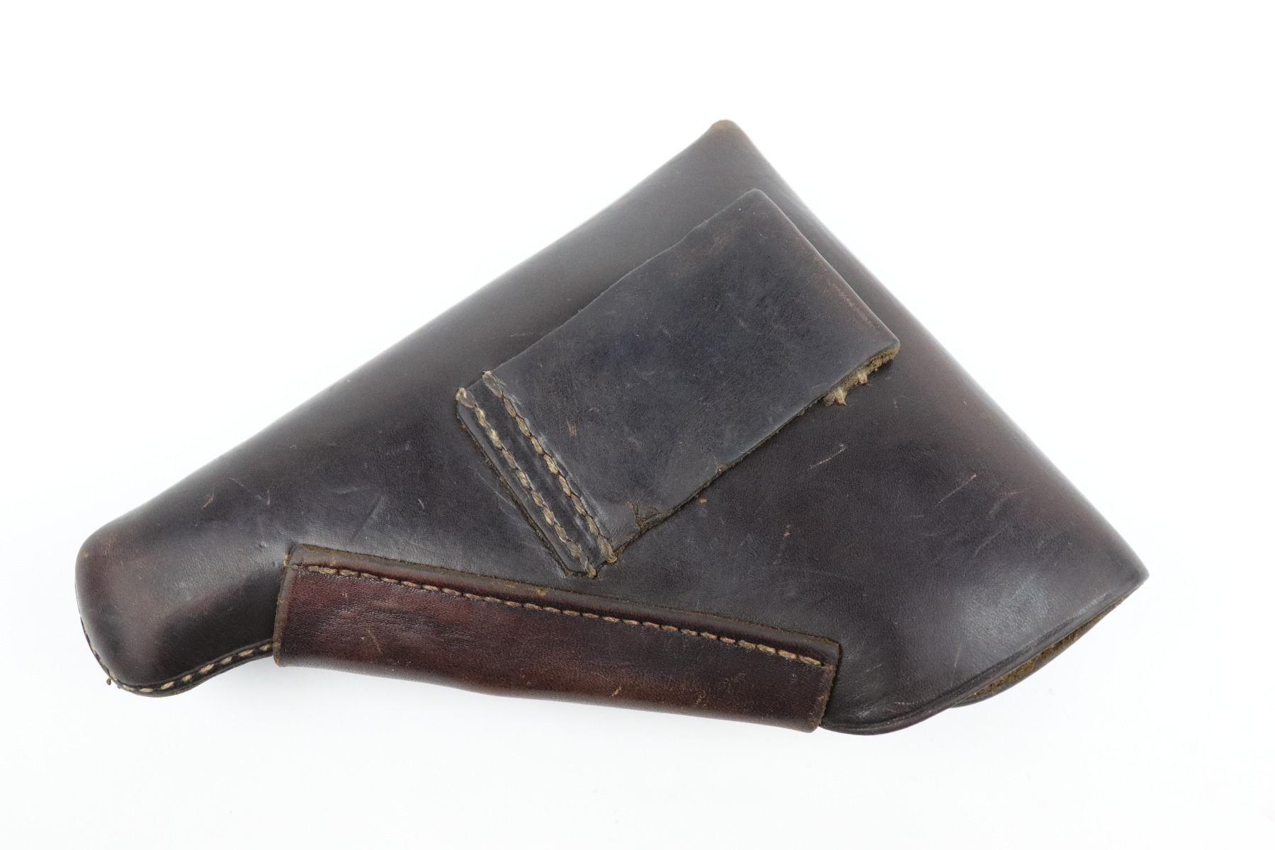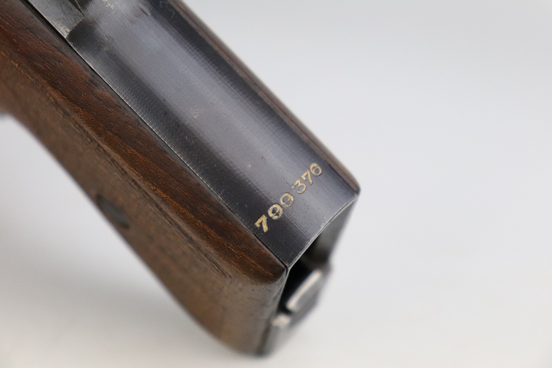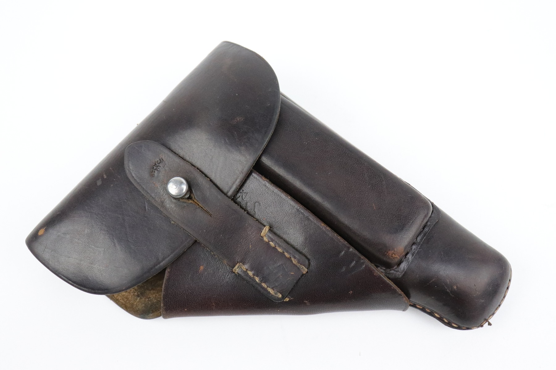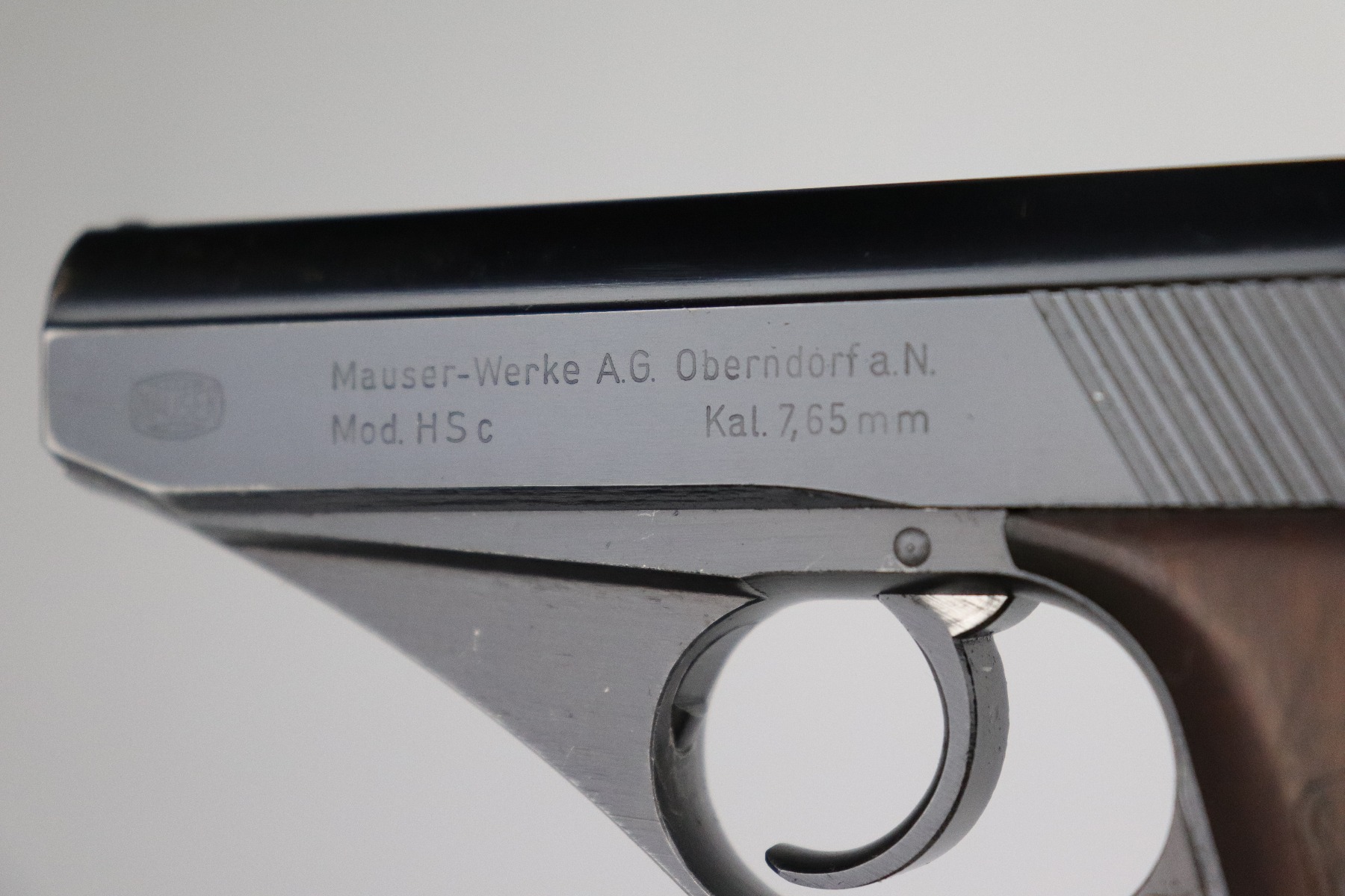 8/14/20 – This is an original Mauser HSC rig issued to the Nazi military in 1942. The gun has the proper “Eagle 135” Nazi military acceptance proof. The rig comes with an excellent holster and two magazines. One of the magazines is period-correct and the other is a post-war production. The gun is in excellent condition, retaining about 96% of its original bluing. Very minor muzzle wear and a few small spots of wear on the right side of the slide. There is a small spot of wear at the base of the back strap. Given the nature of the machining, the straps are difficult to rate, but there appears to be very minor thinning and some patina showing through. The bore is excellent – shiny with strong rifling. The holster is in excellent condition. It is waffenamt and dated 1941.