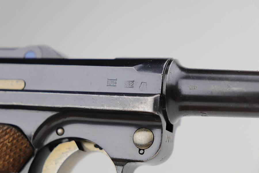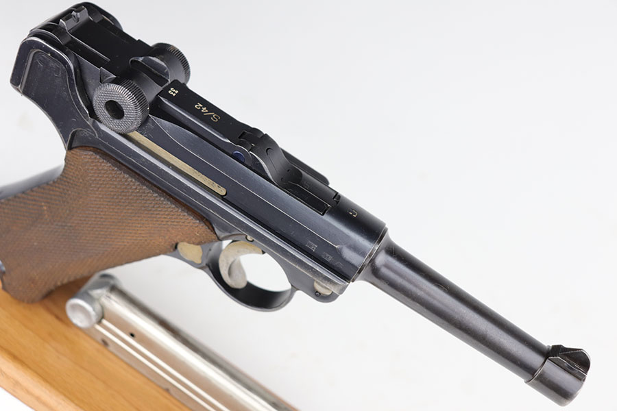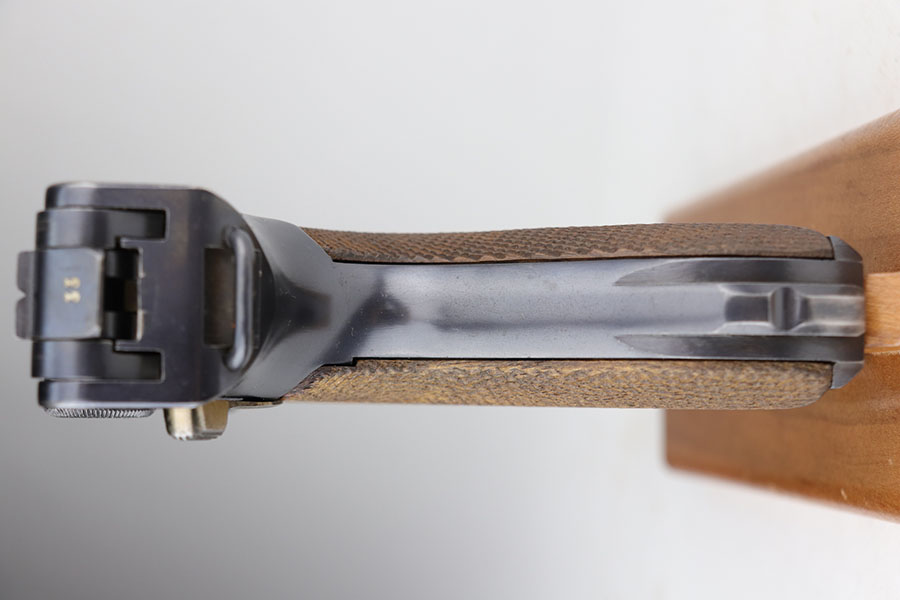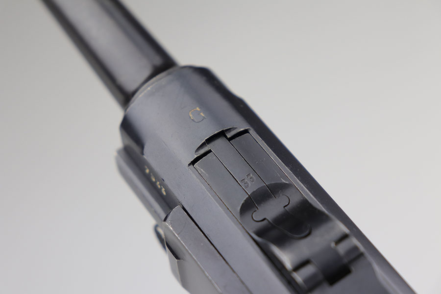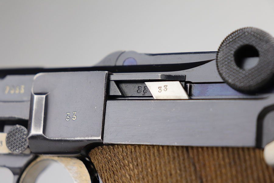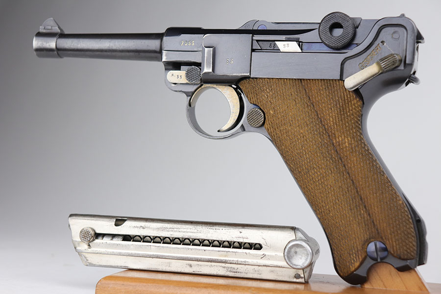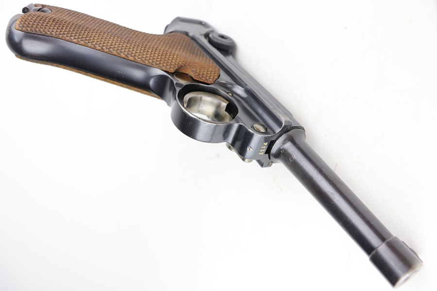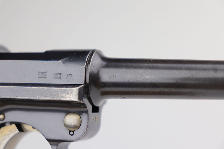 1/19/21 – This is an excellent Nazi Mauser Luger from 1935, when the Germans were still trying to hide military firearm production and using letter codes rather than dates. The gun has all matching numbered parts, with unmarked grips and period original but mismatched magazine. It has about 96% of the original blue, just standard high edge wear on sideplate, muzzle, trigger guard and bottom of front strap. Minty bore. The grips are in excellent condition aside from the common safety chip on the left panel.